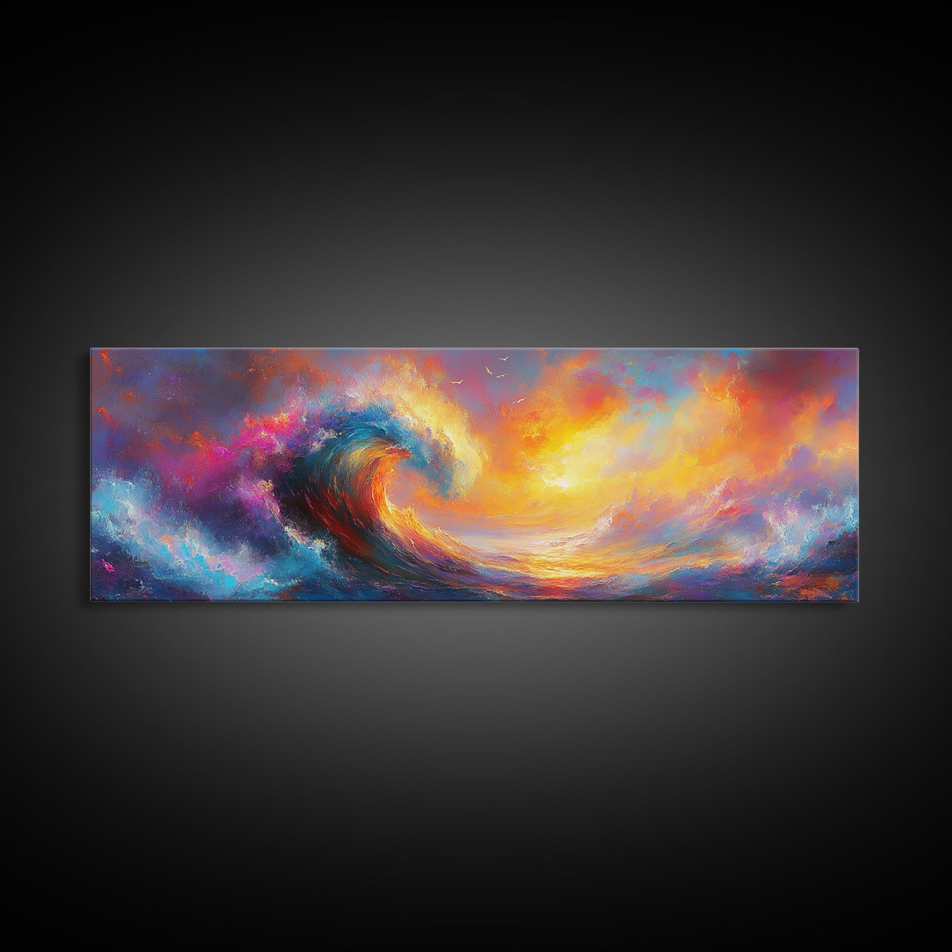 Oil Painting Print of Rainbow Ocean Waves, Retro Farmhouse Beach House Decor, Panoramic Extra Wide Wall Art