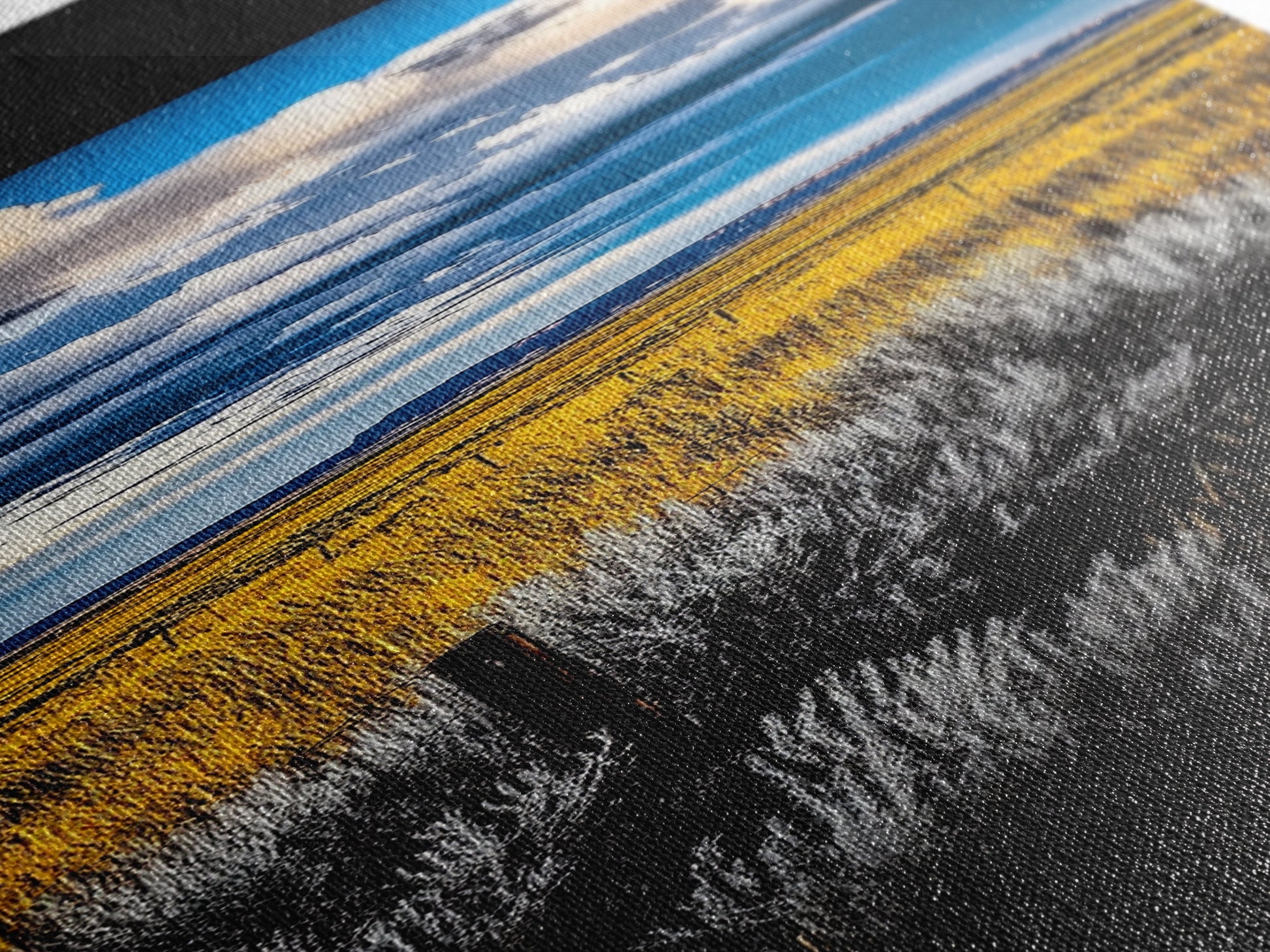 Most of our canvases are made in the USA, with the exception of canvases ordered with the light oak unstained frames, and any large canvases (24x48, 30x60, 16x48 and 20x60) ordered WITH a frame. These are temporarily made in and shipped from Europe, while we try to find a more consistent supplier in the USA.