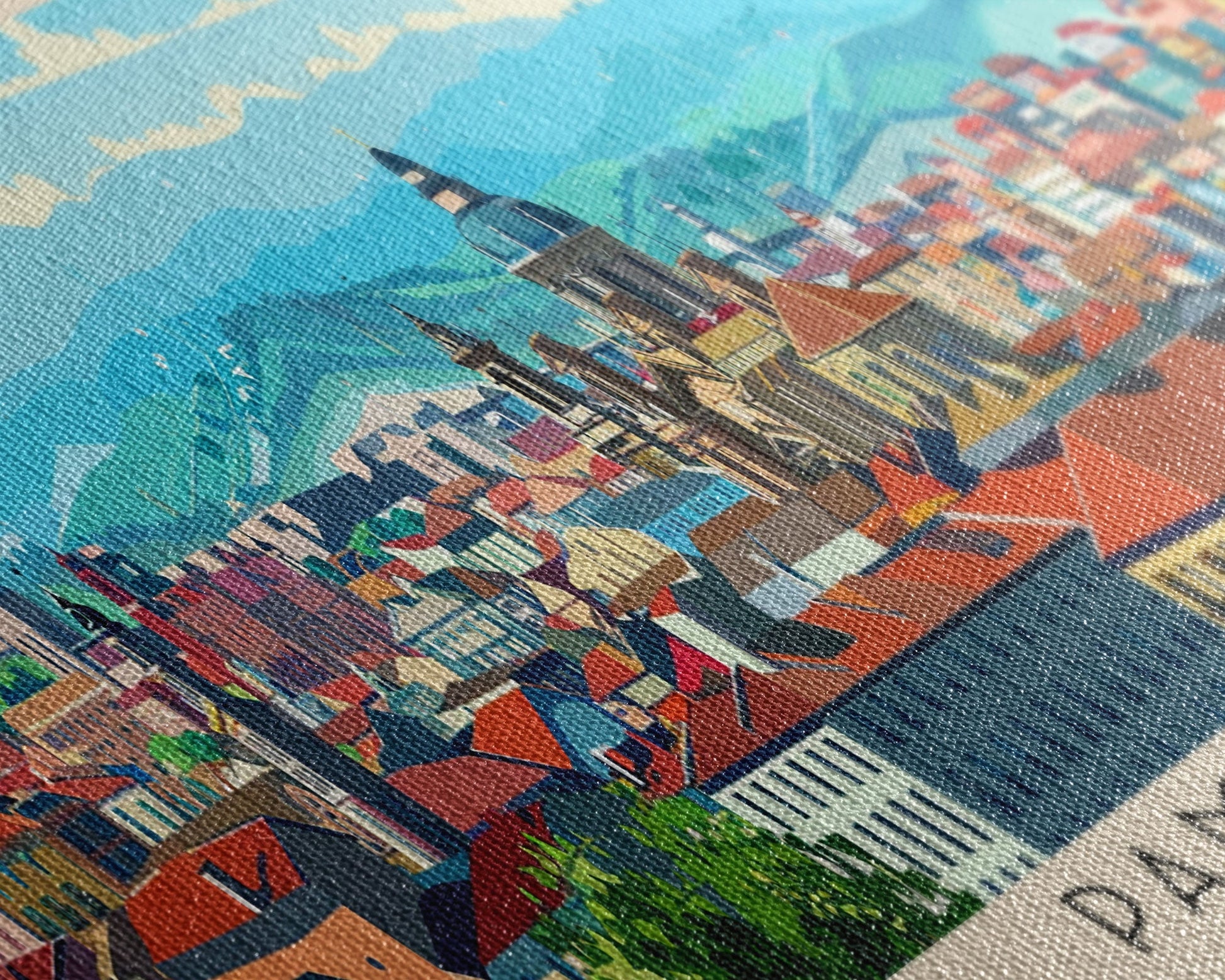 Pamplona Spain Panoramic Travel Poster, Framed Canvas Print or Metal Wall Art, Travel Art, Home Decor, Panoramic Painting, Midcentury Art