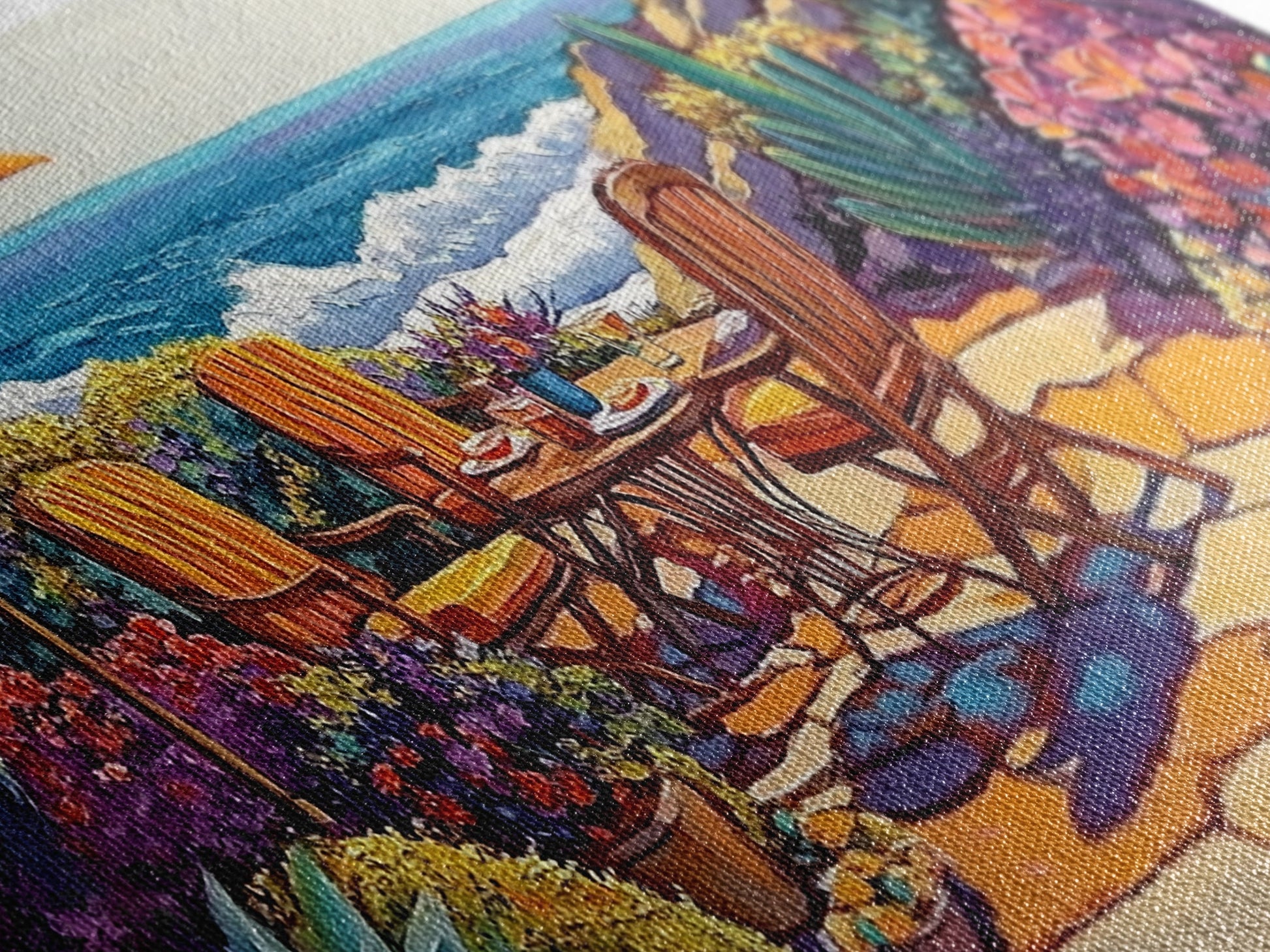 Most of our canvases are made in the USA, with the exception of canvases ordered with the light oak unstained frames, and any large canvases (24x48, 30x60, 16x48 and 20x60) ordered WITH a frame. These are temporarily made in and shipped from Europe, while we try to find a more consistent supplier in the USA.