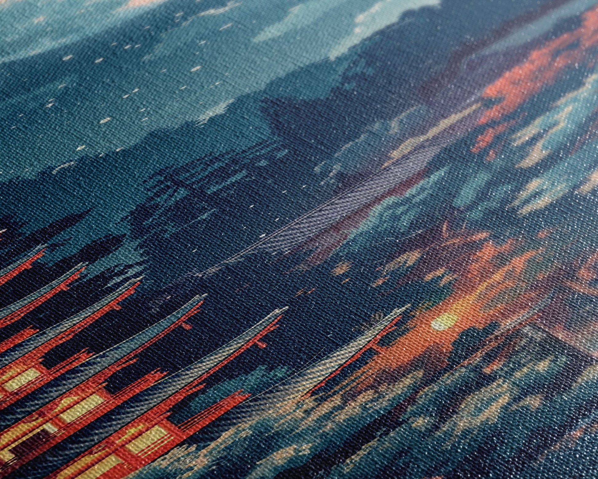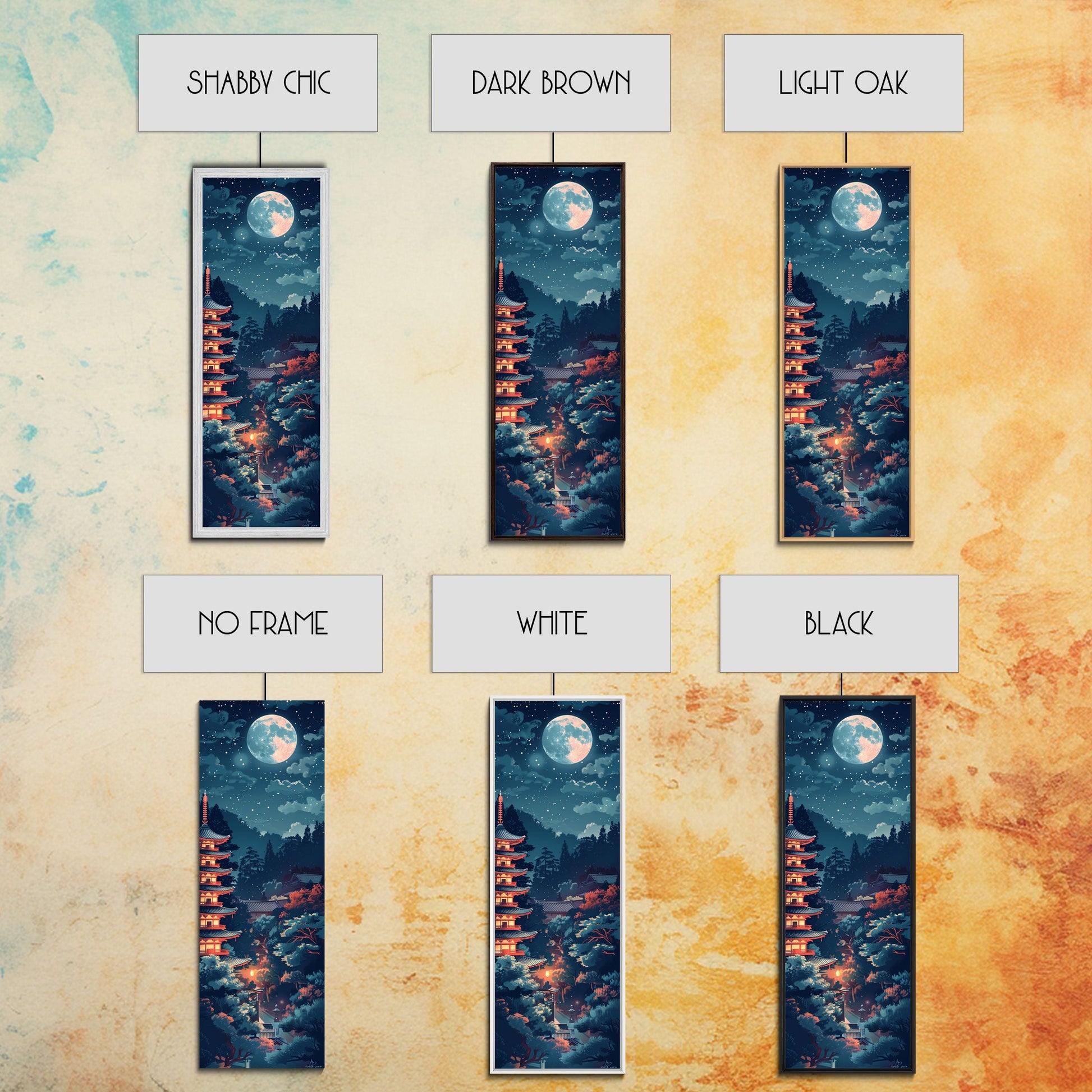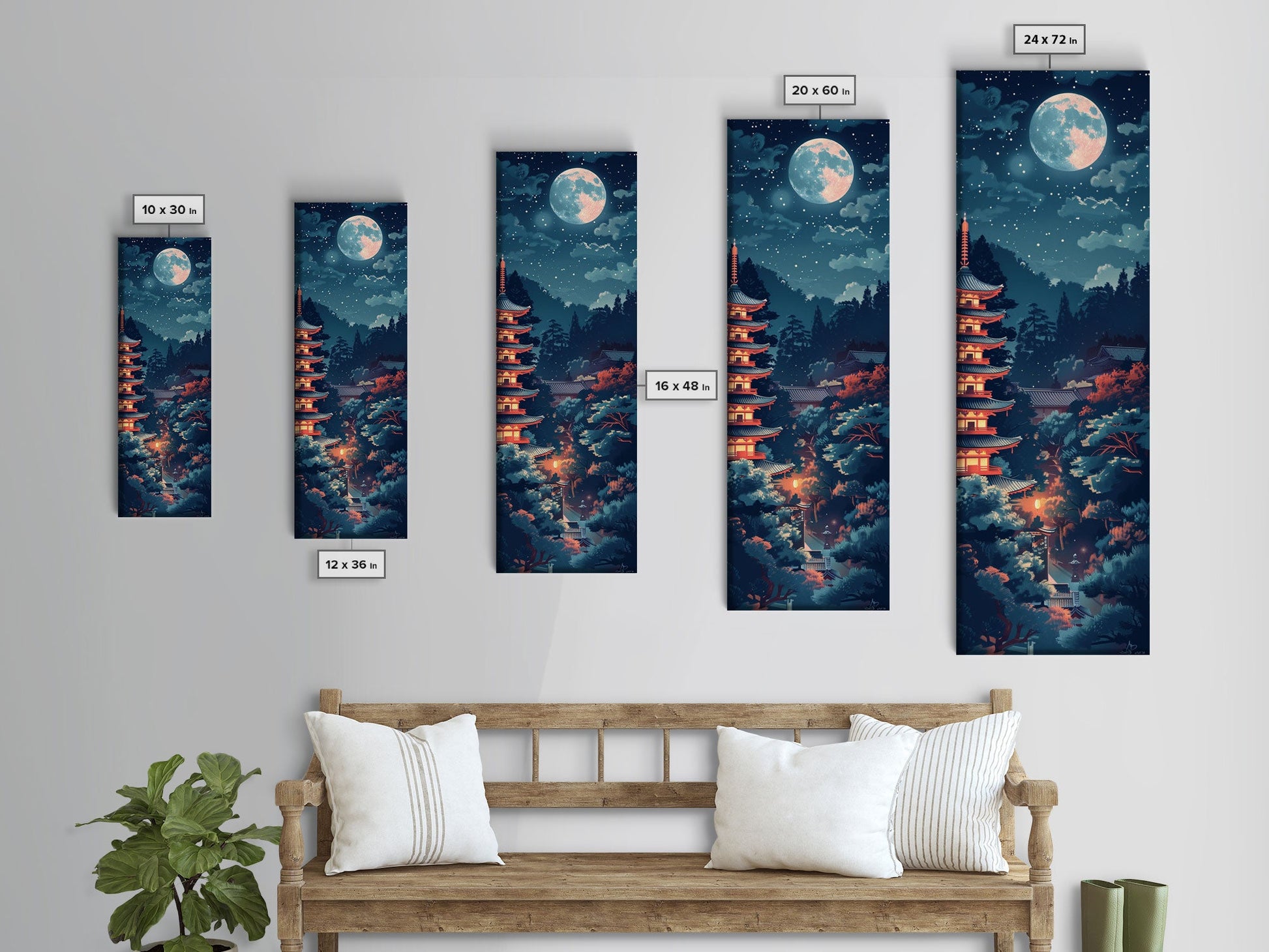 Peaceful Japanese Temple And Pagoda Under A Full Moon, Skinny Art Tall Wall Art Framed Canvas Print Japanese Style Art