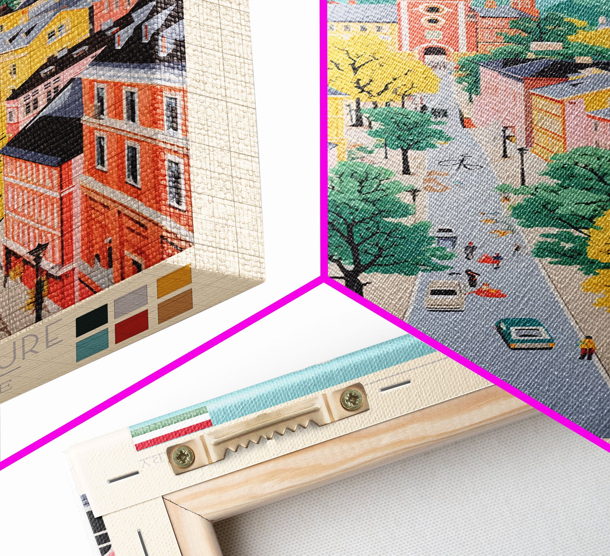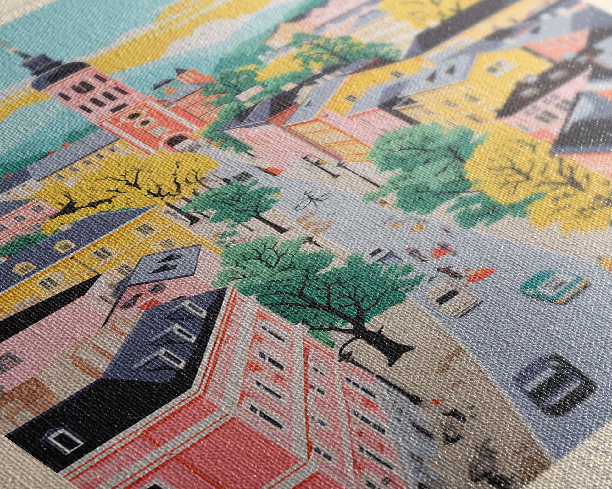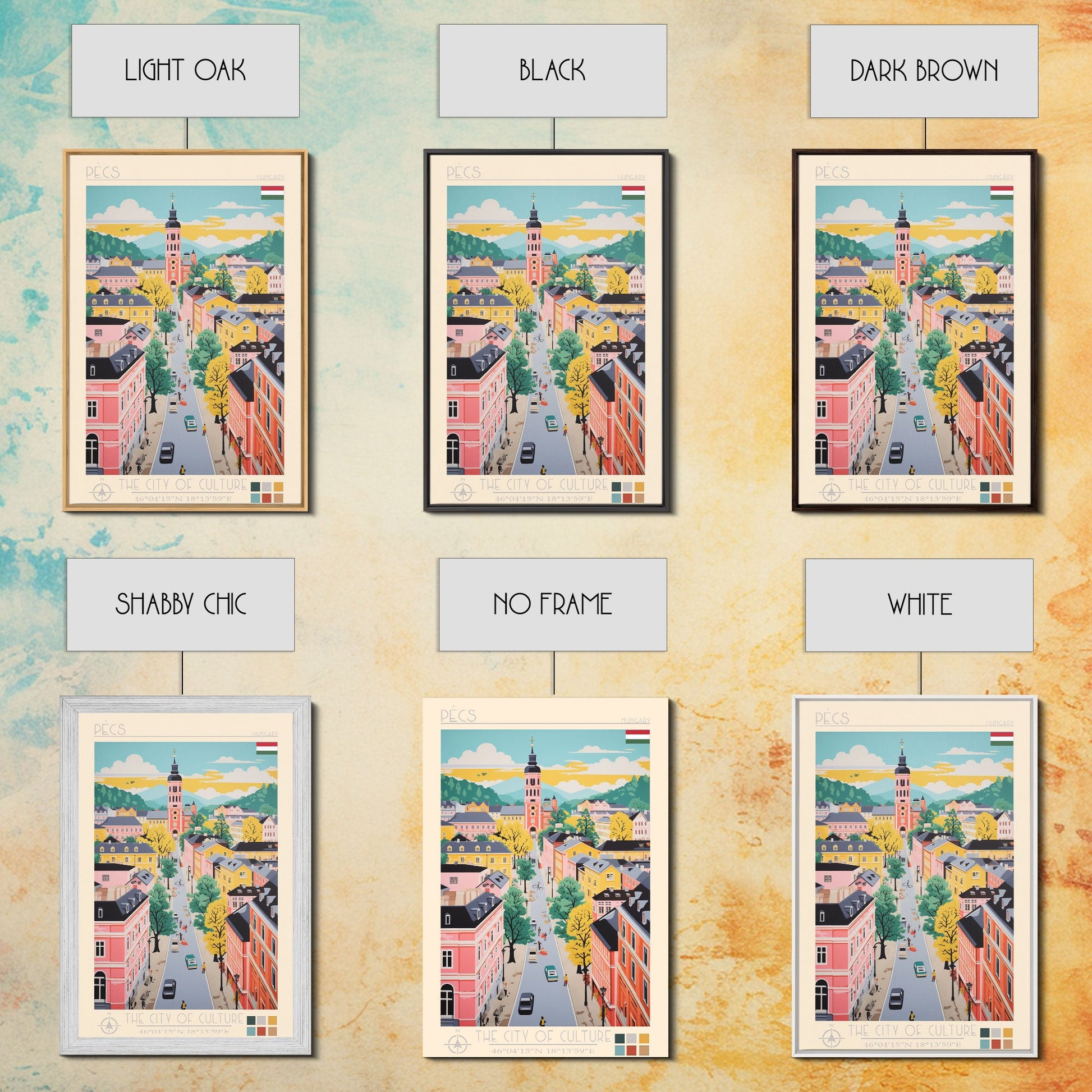Pécs Hungary Travel Poster Framed Canvas Print, Midcentury Modern Art, Pop Art Wall Decor, Living Room Art, Home Decoration