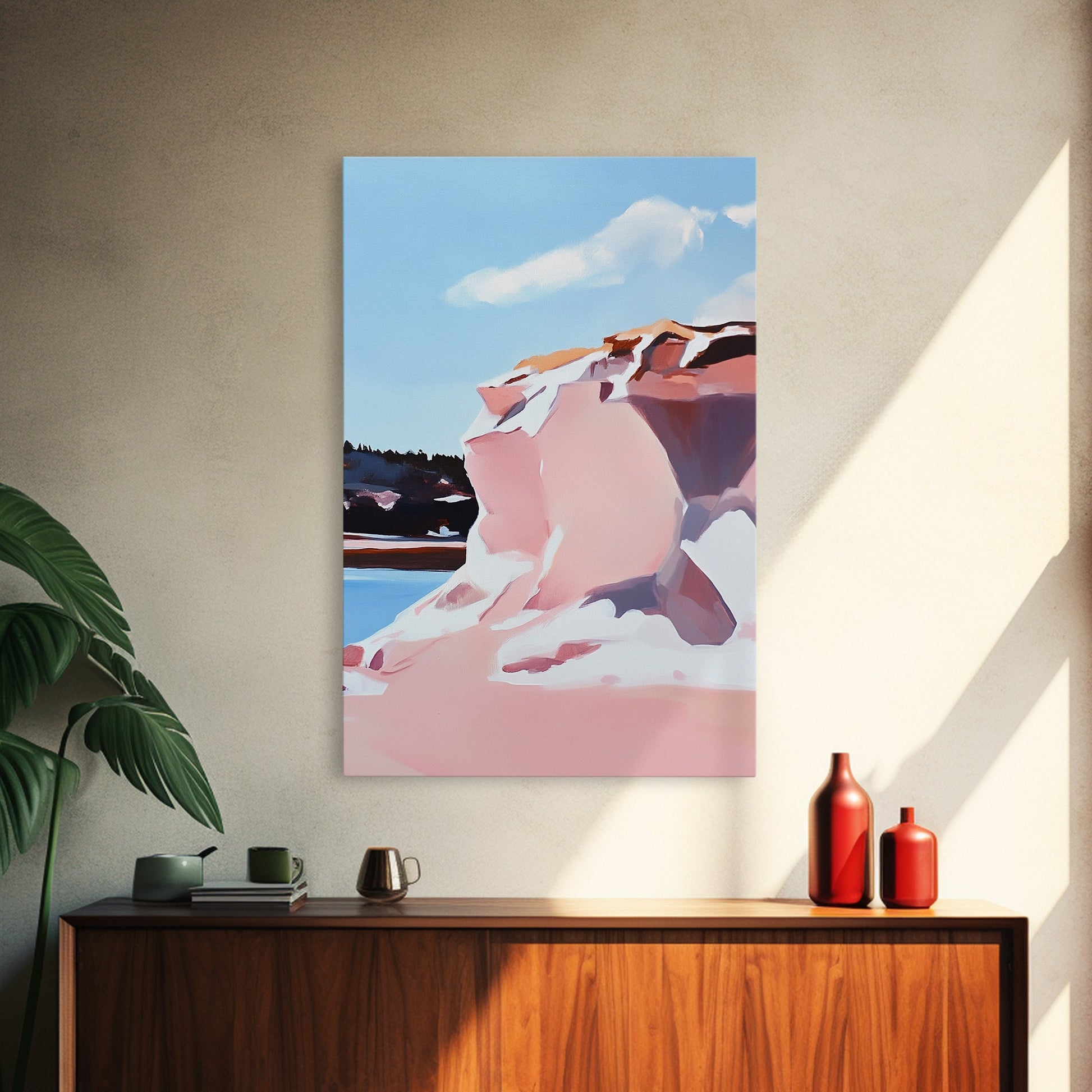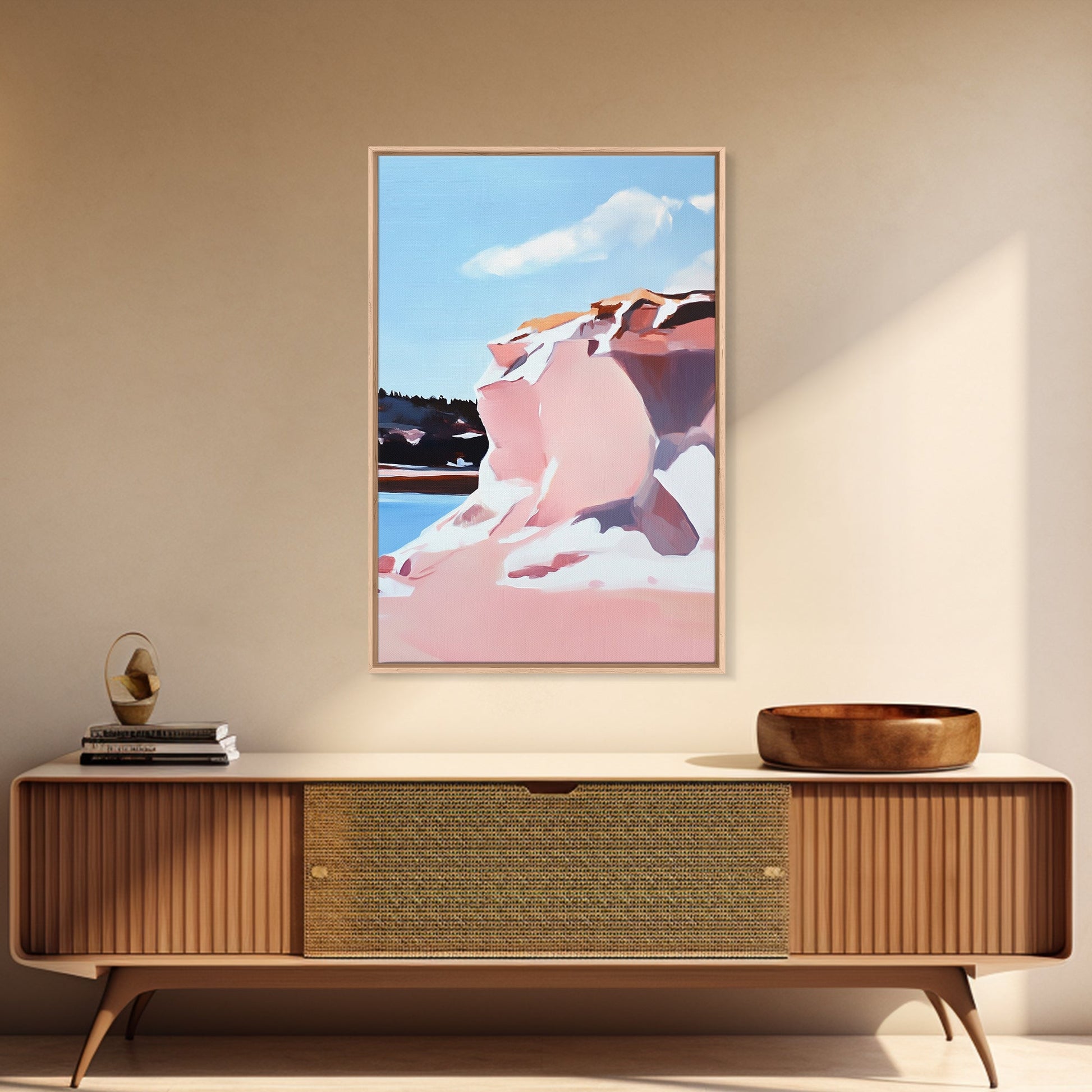 Pink Cliffs, Coastal Beauty, Ocean Landscape, Soft Pastel Art, Nature Inspired, Tranquil Scenery, Boho Wall Art, Framed Canvas Print