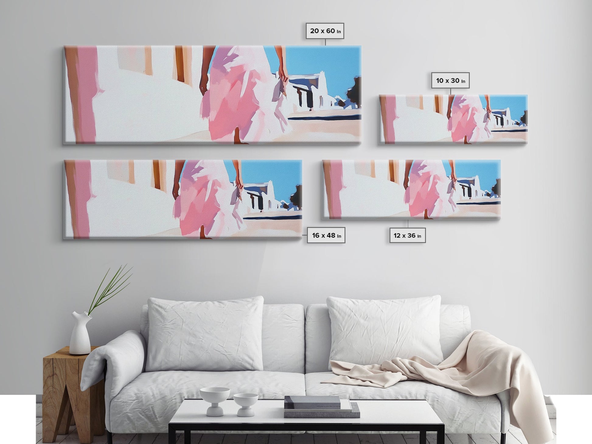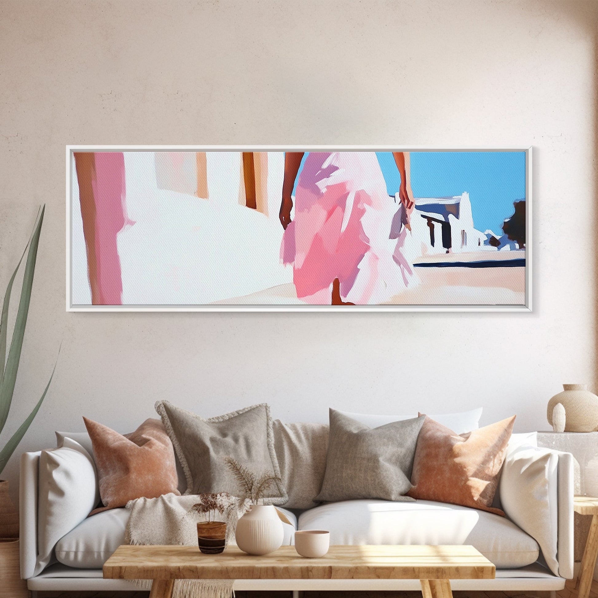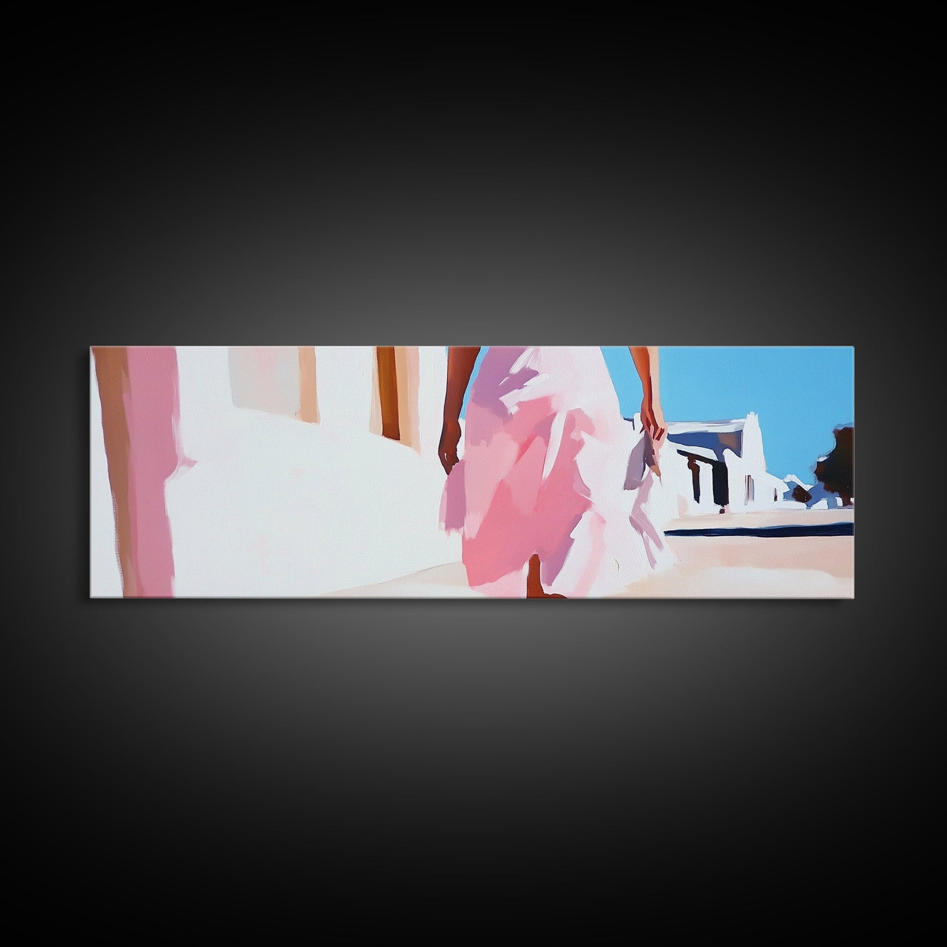 Pink Dress, Elegant Stroll, Romantic Scene, Framed Canvas Print, Modern Wall Art, Feminine Decor, Stylish Living Room Artwork