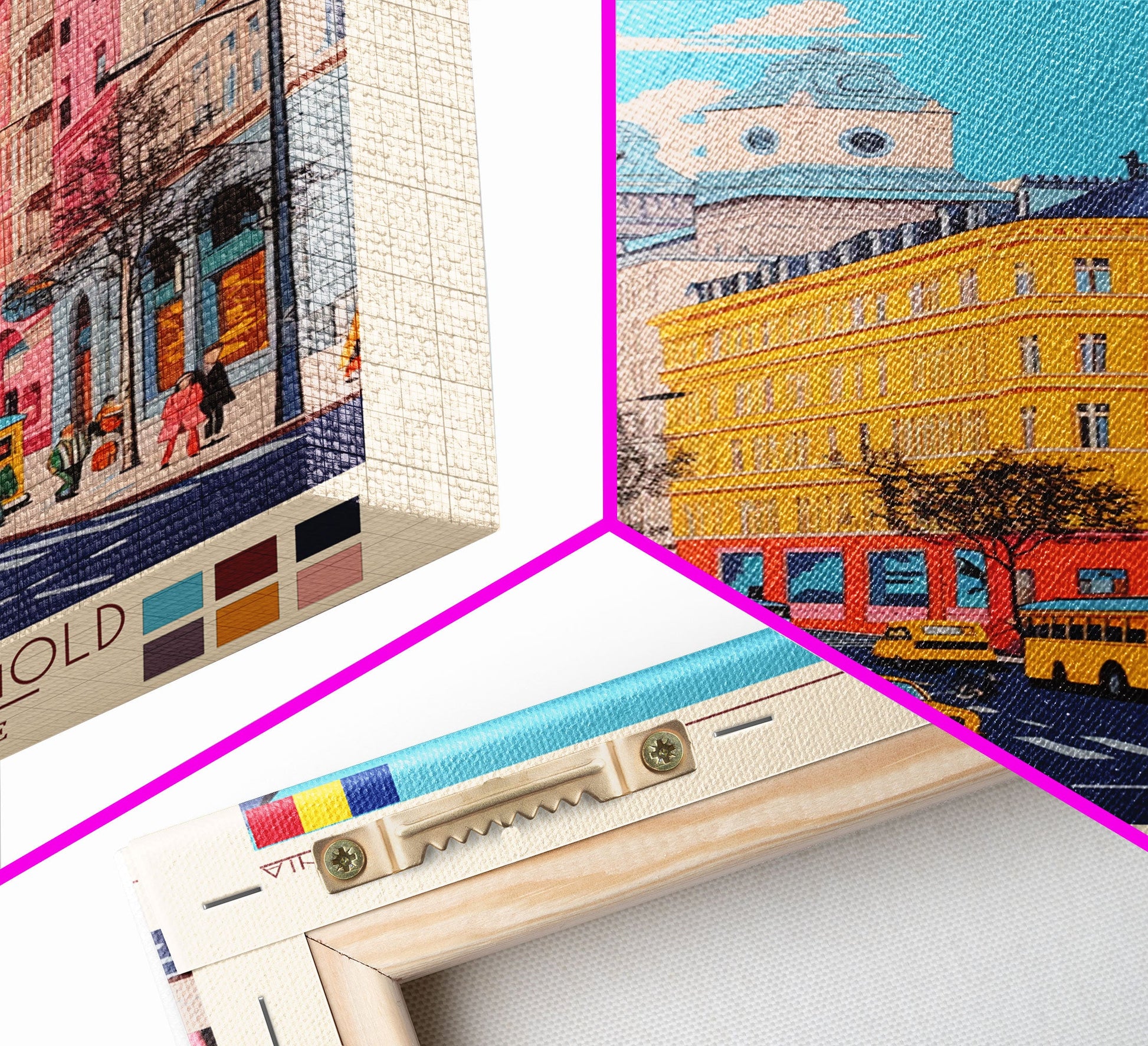 Pitești Romania Travel Poster Framed Canvas Print, Midcentury Modern Art, Pop Art Wall Decor, Home Decor, Vacation Gift, Bedroom Art