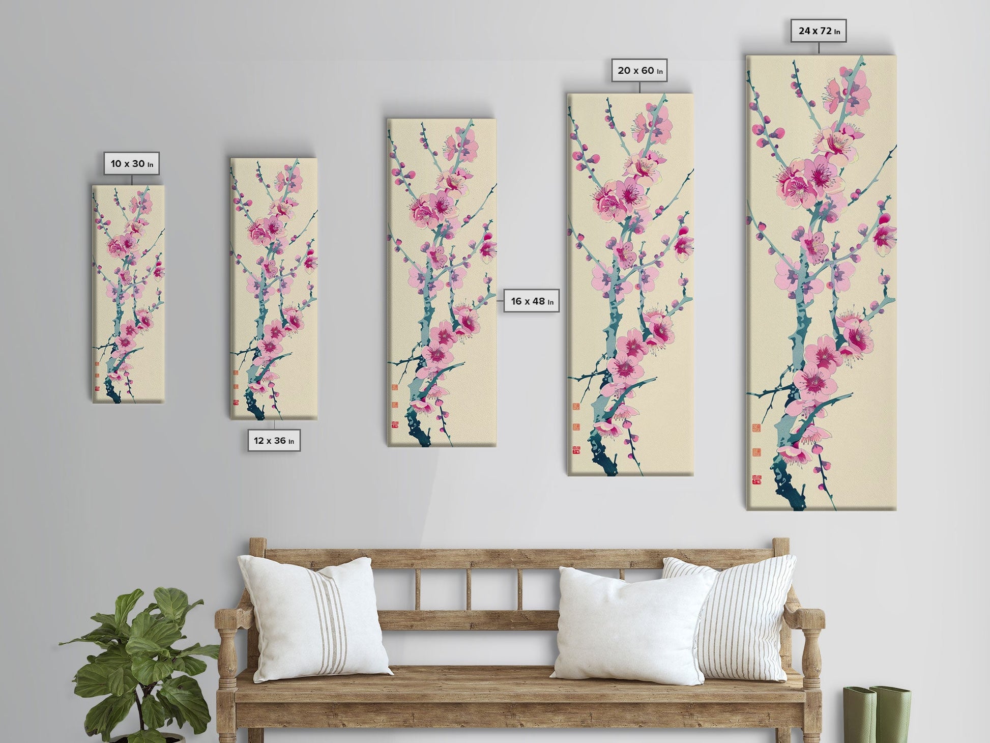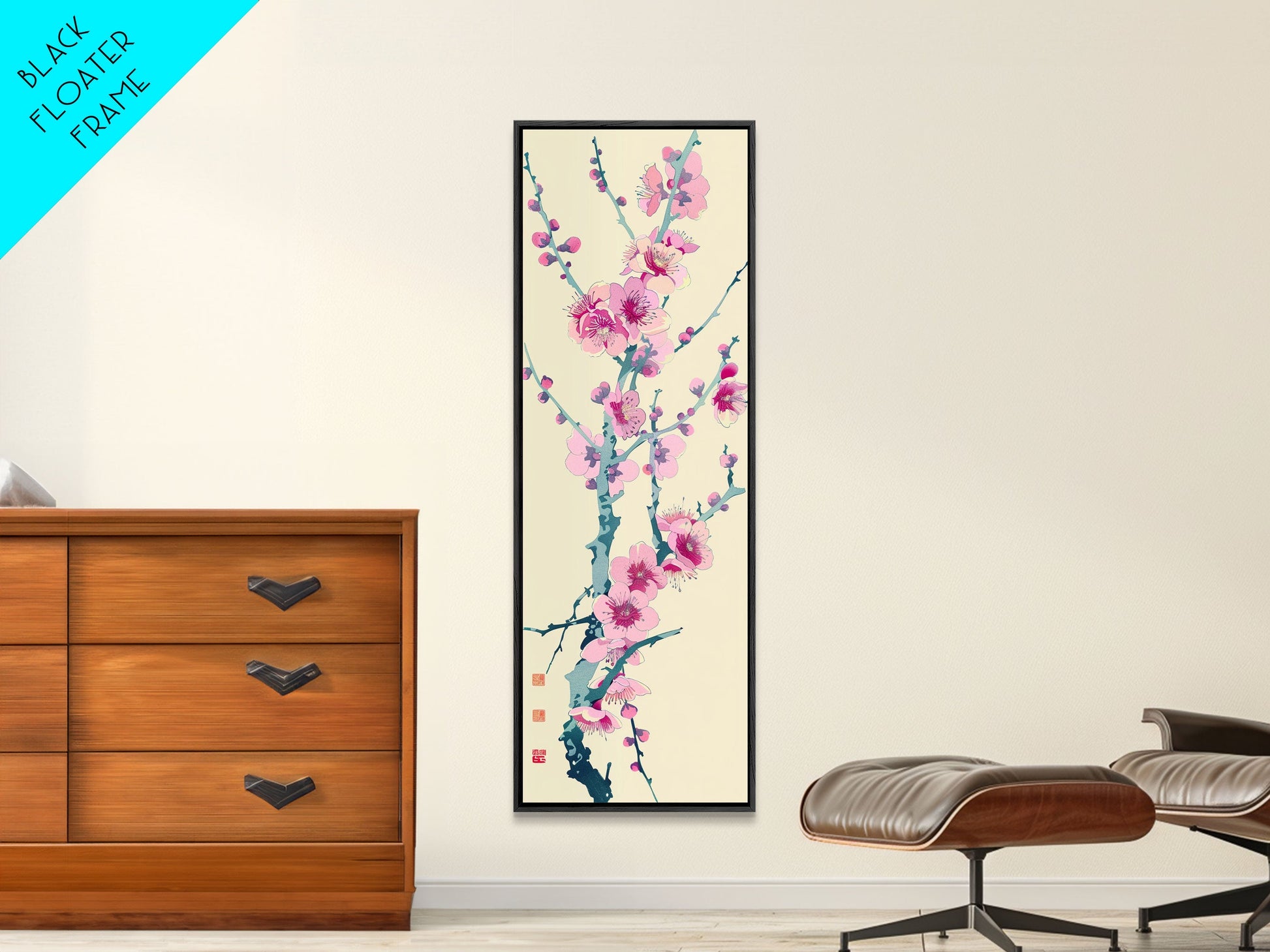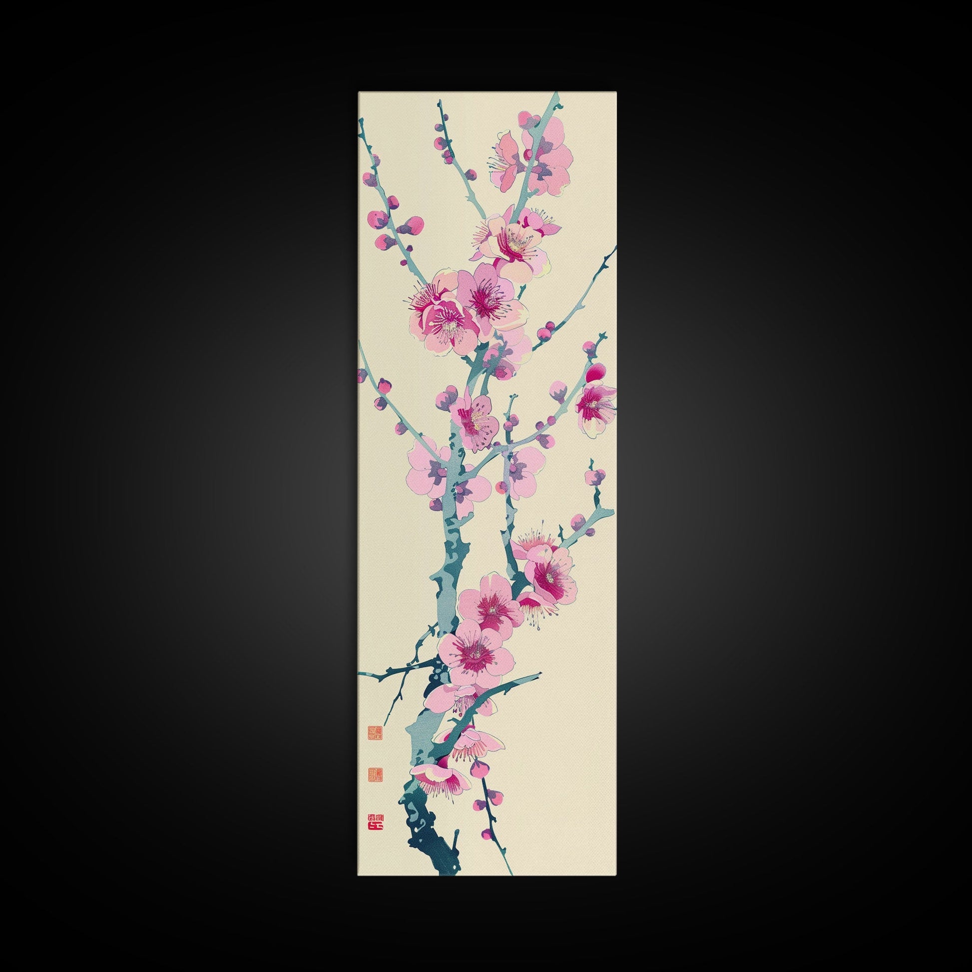 Plum Blossom Branch in Japanese Skinny Art with Delicate Pink Flowers – Framed Canvas Print