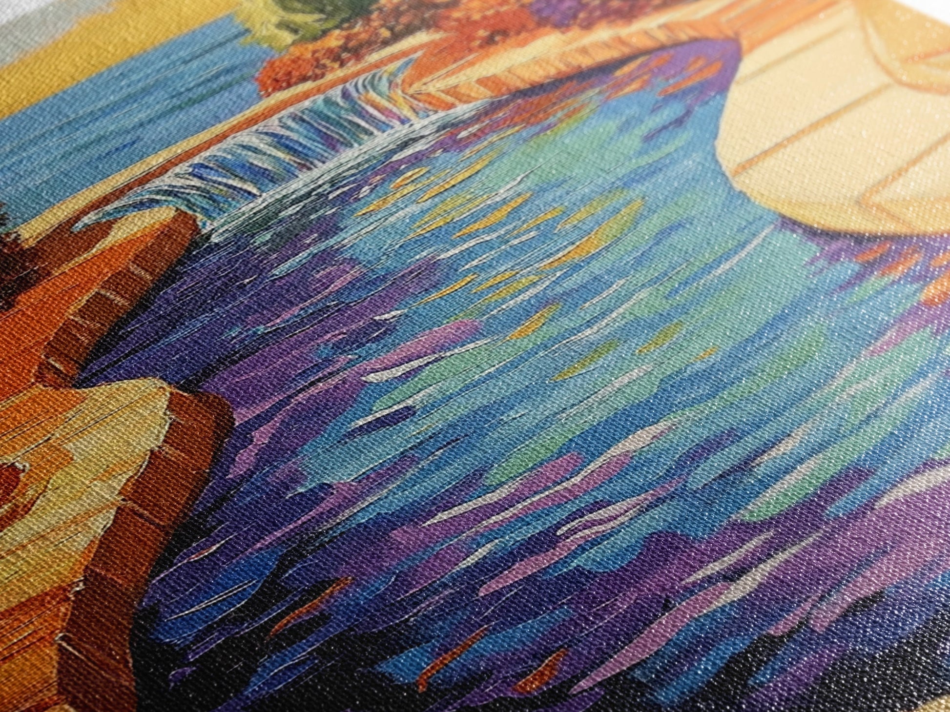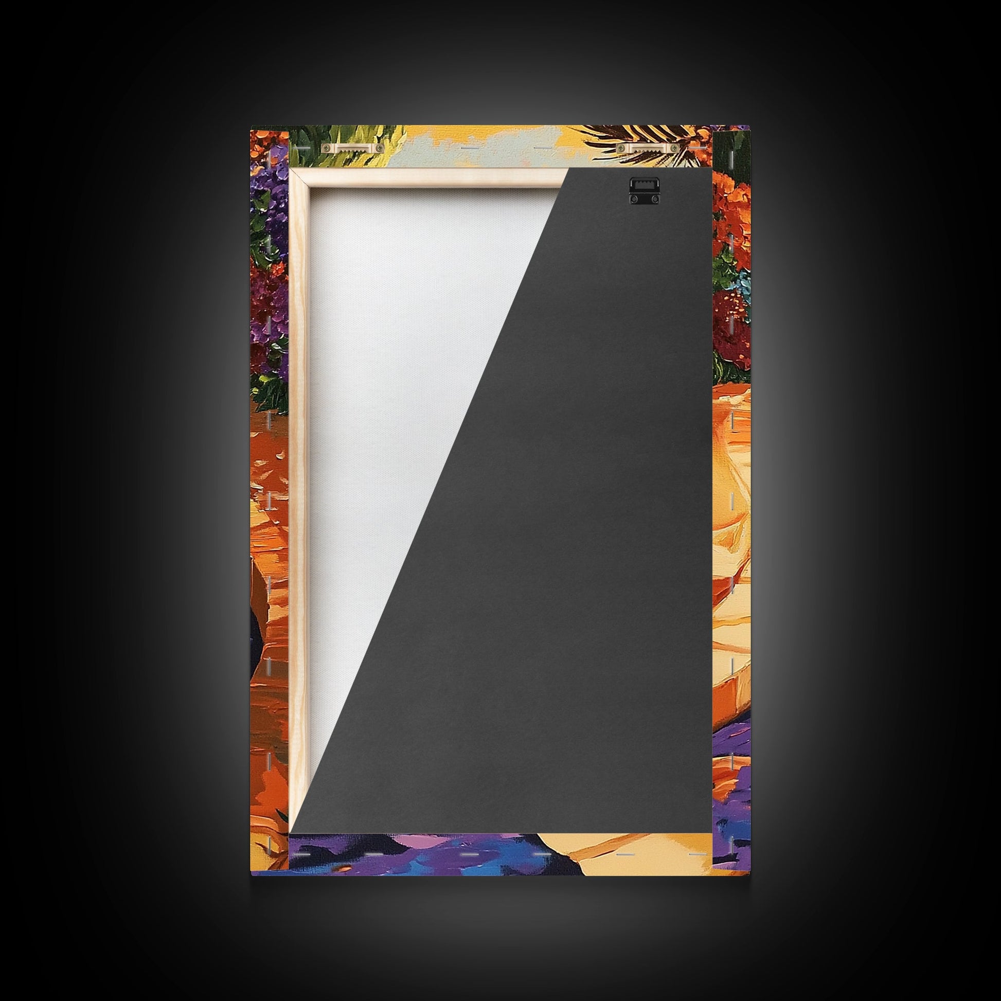 Pool Garden, Oasis, Sunset, Framed Canvas Print vibrant patio wall art, tropical courtyard landscape, kitchen art, sunroom boho decor