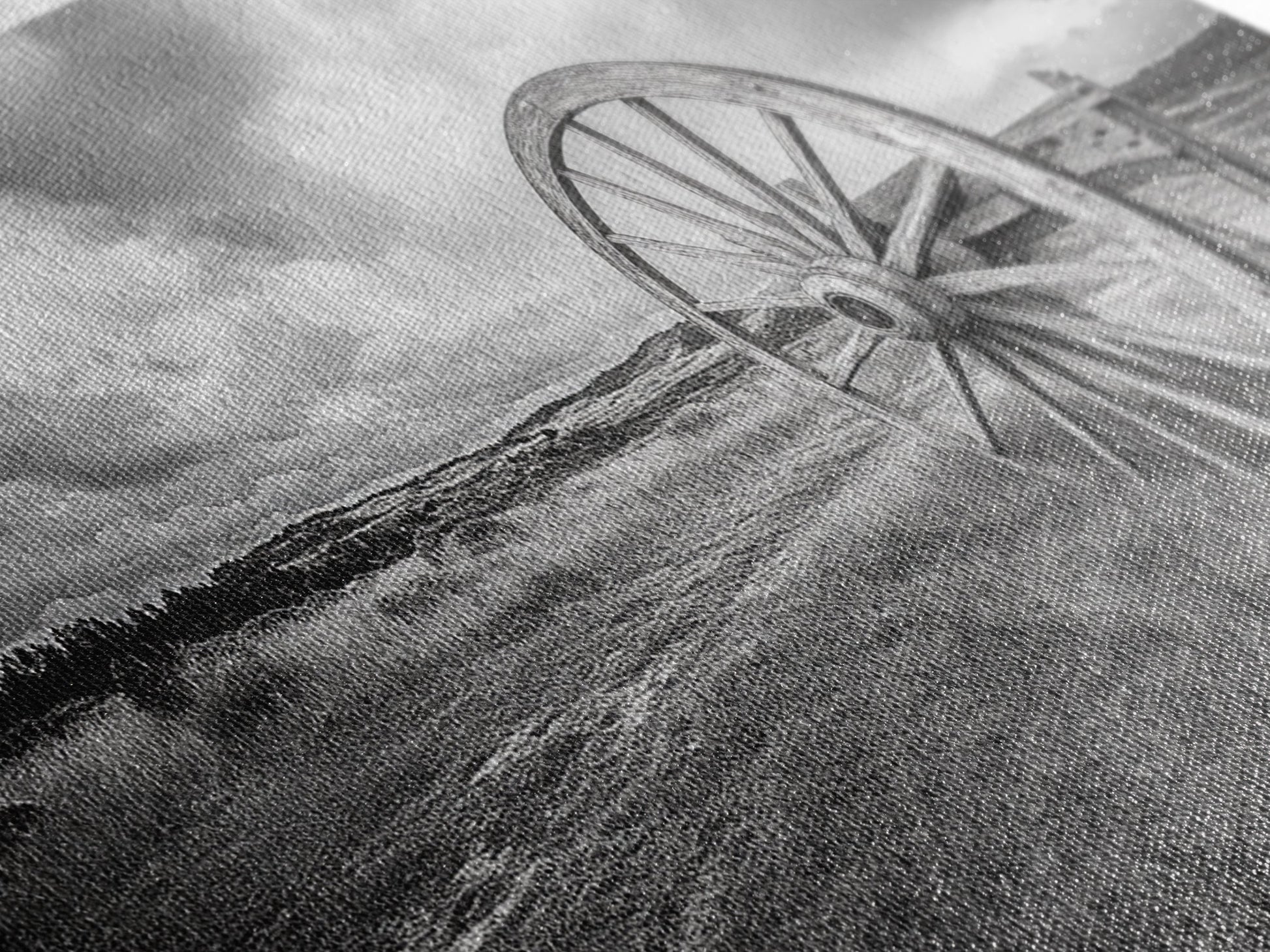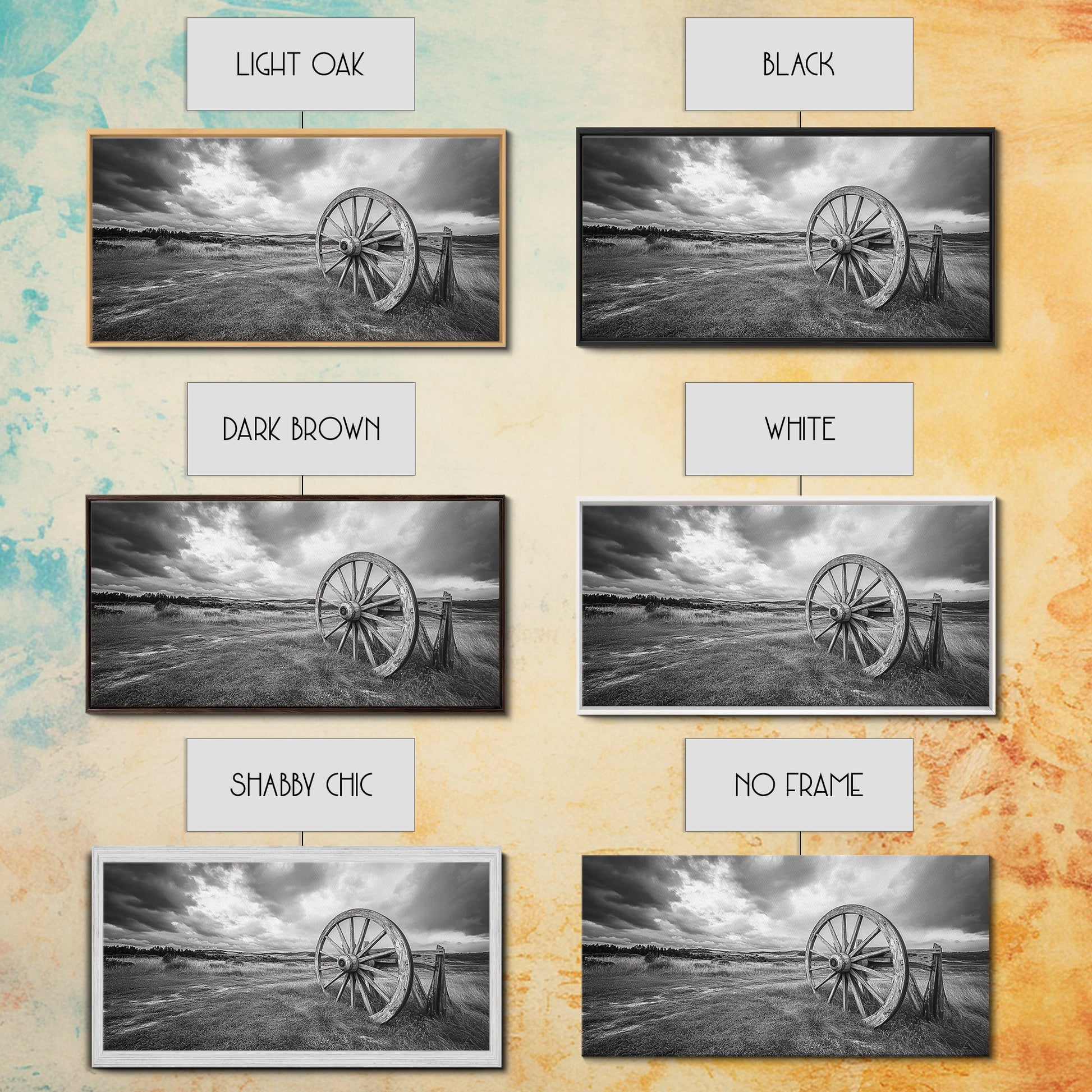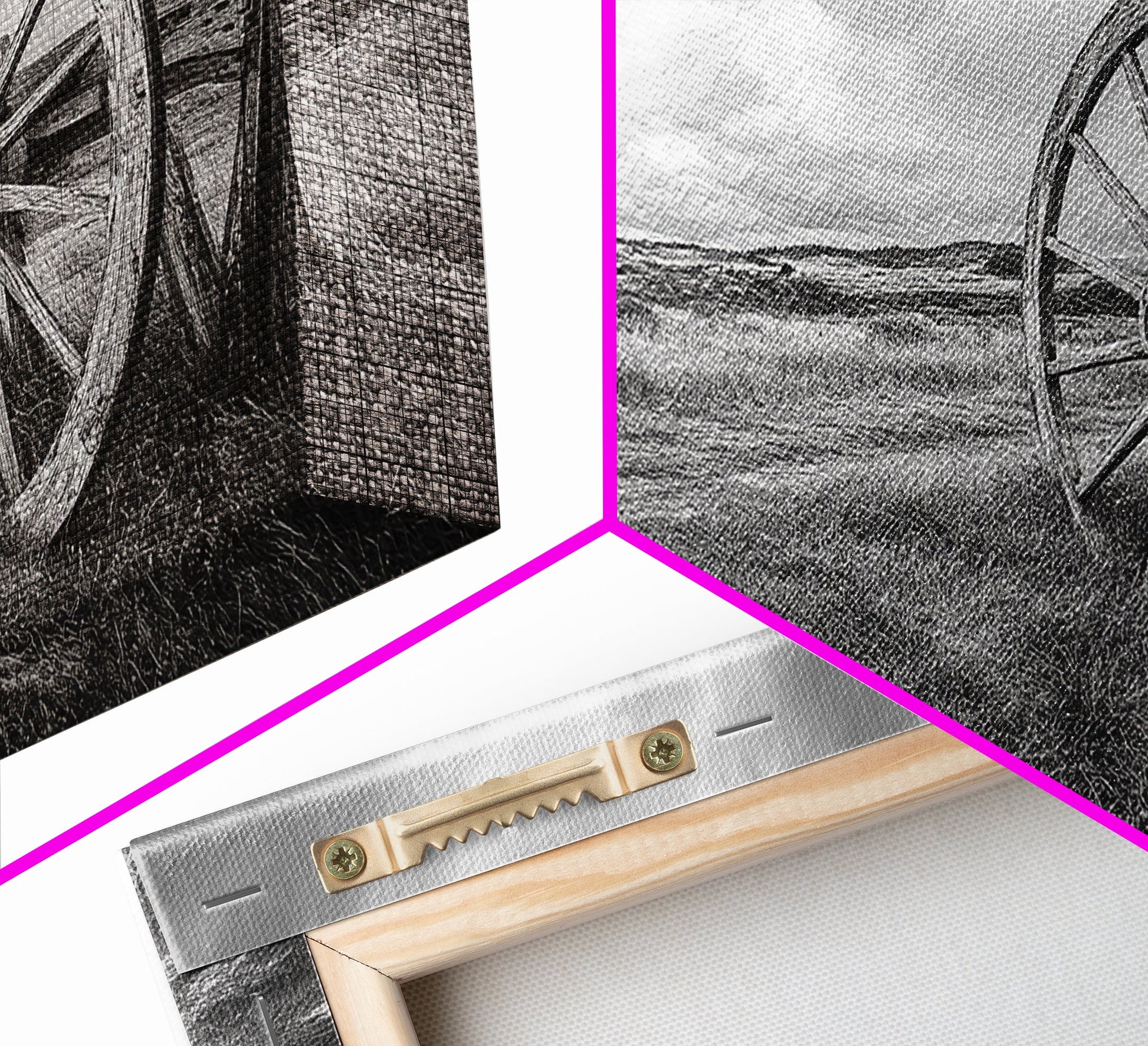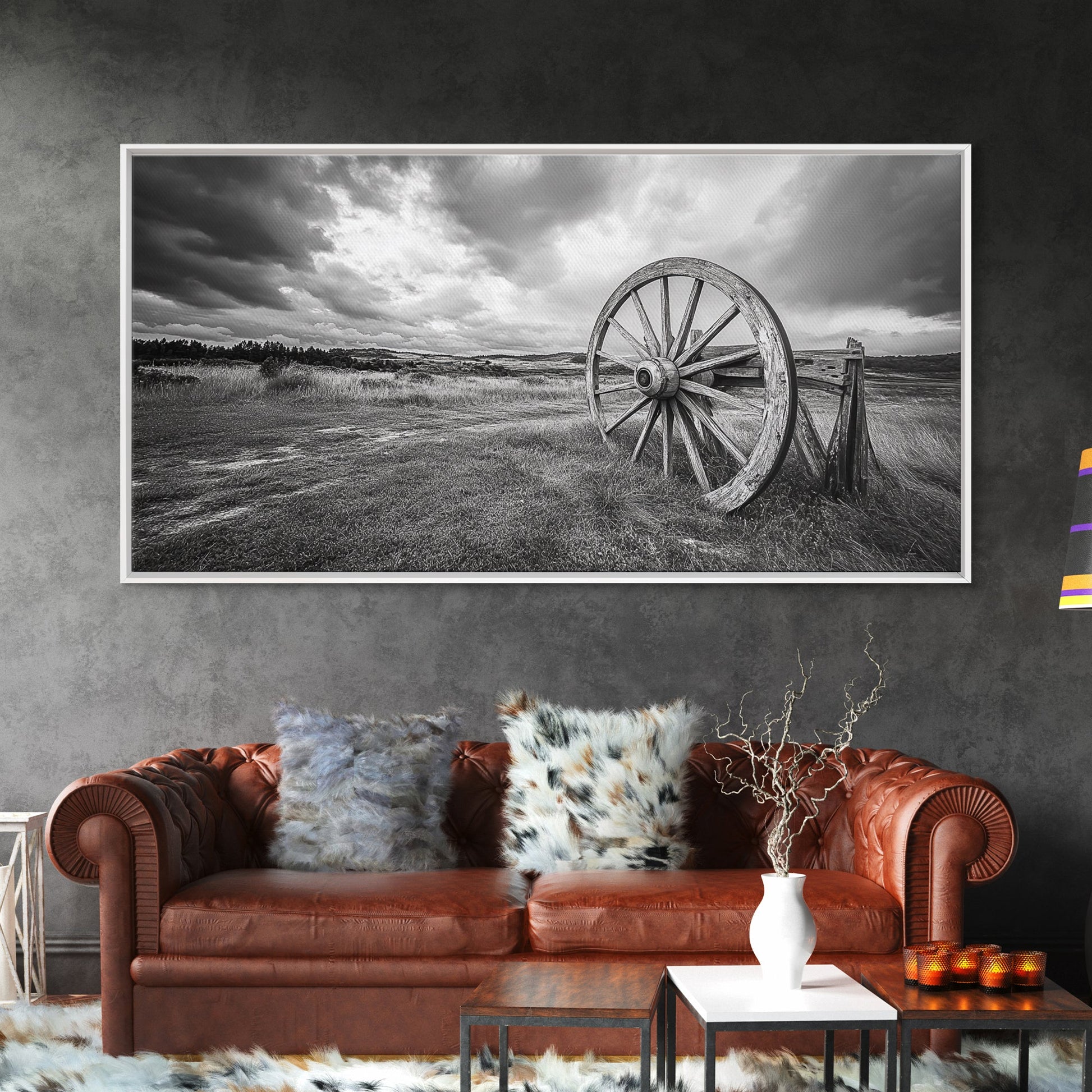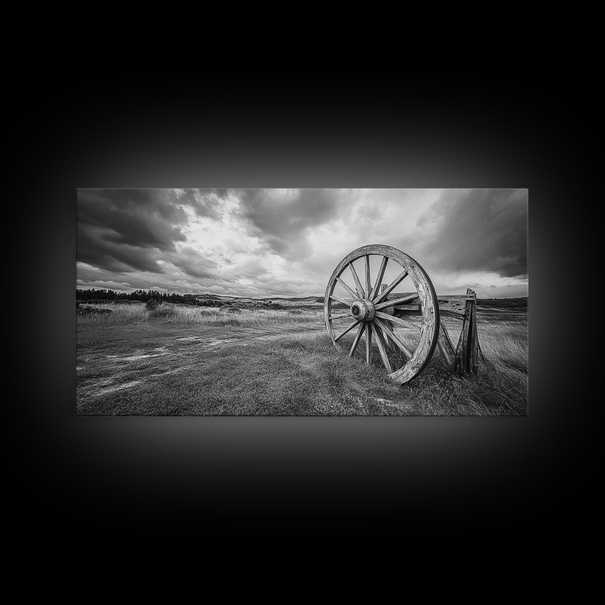 Prairie Wagon Wheel, Western Landscape, Rustic Field, Canvas Print, Country Farmhouse Wall Art, Fall Rustic Decor, Black And White Art