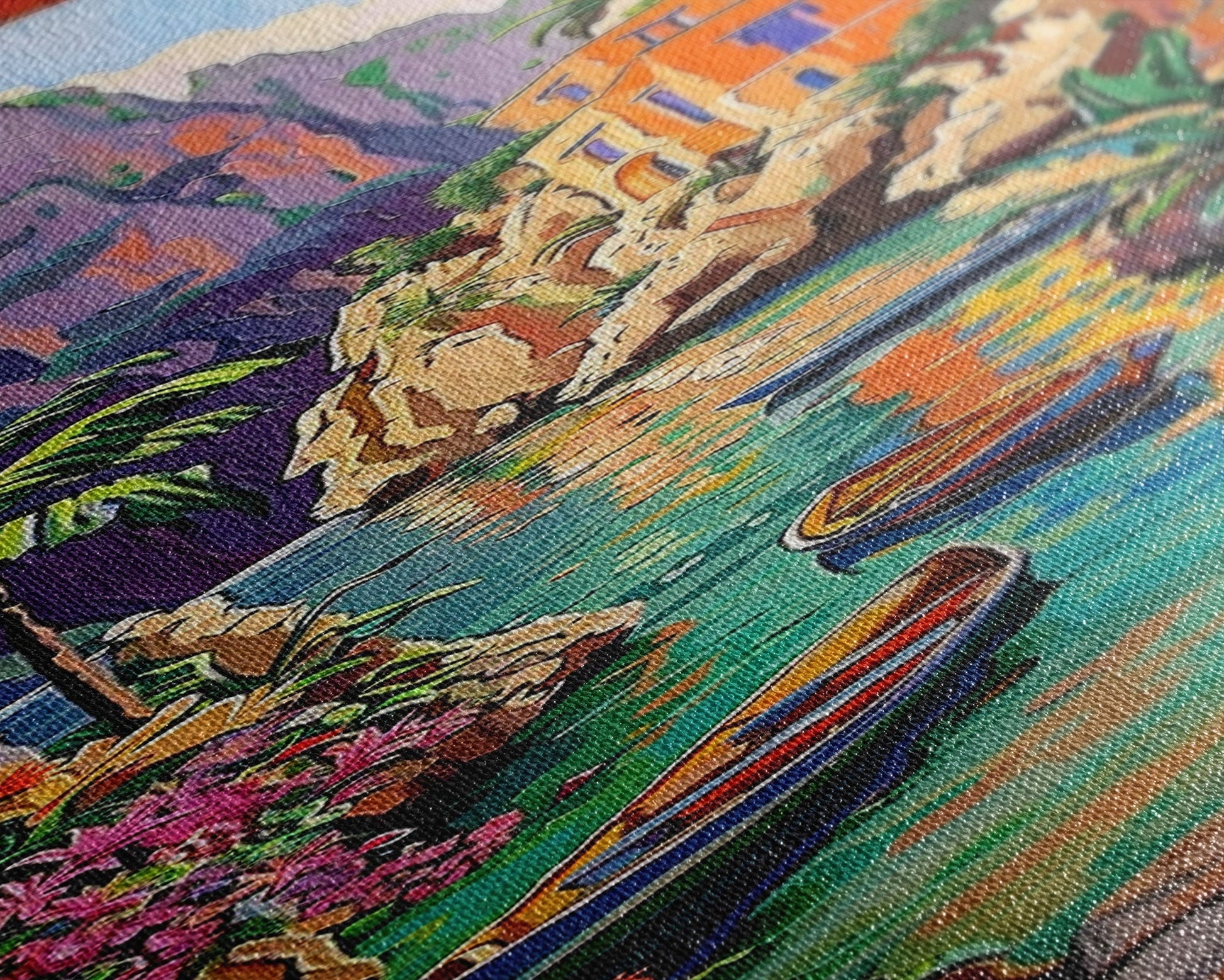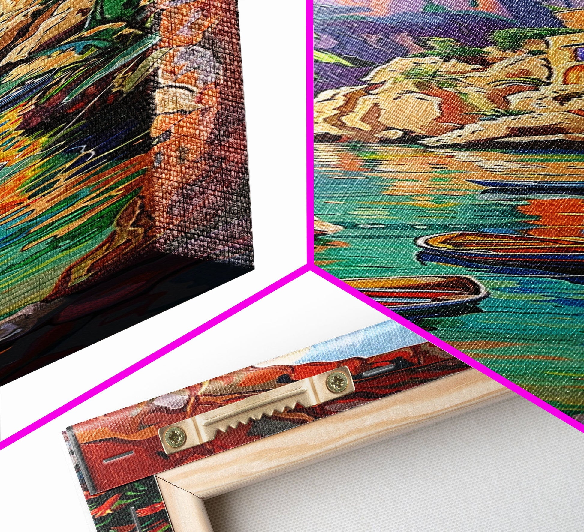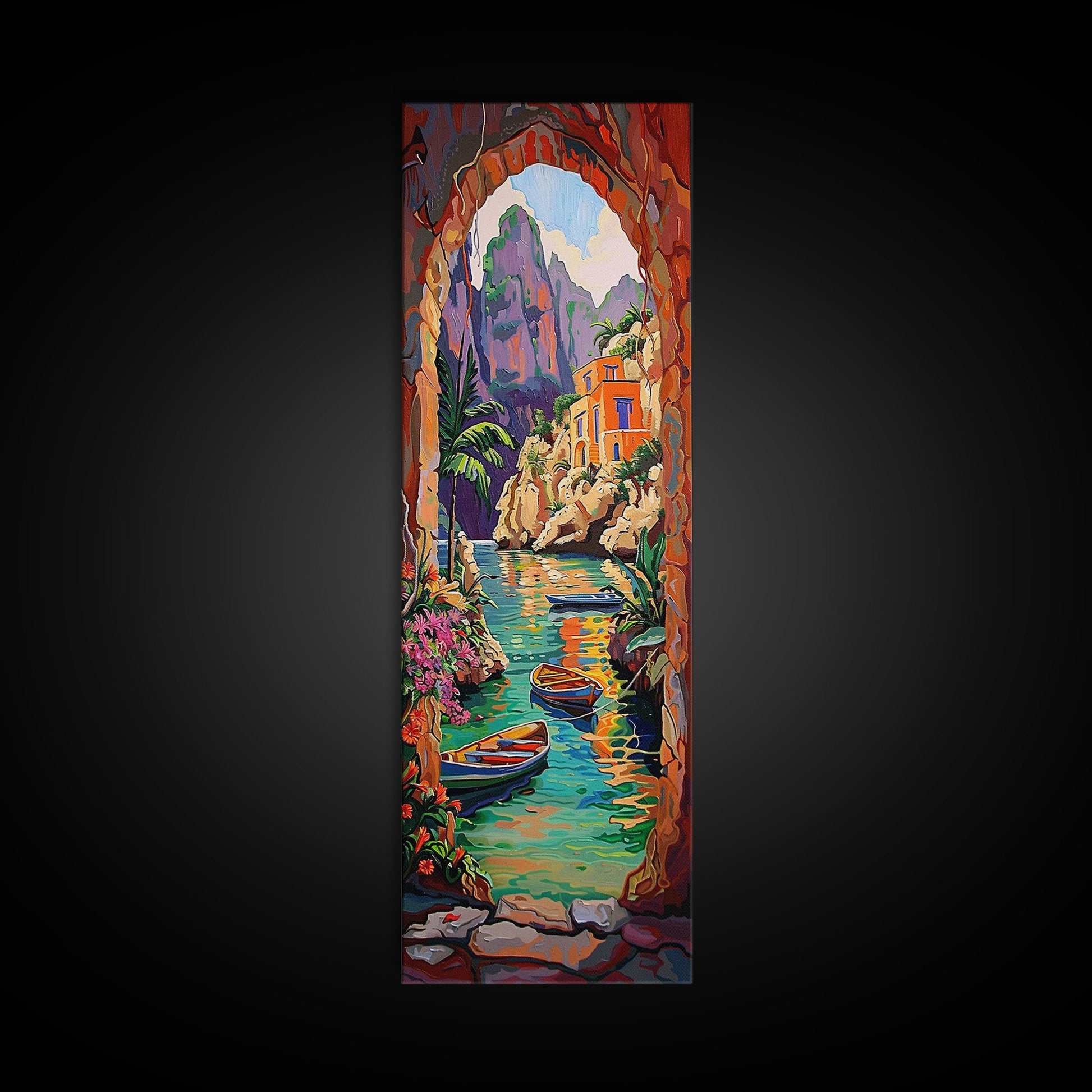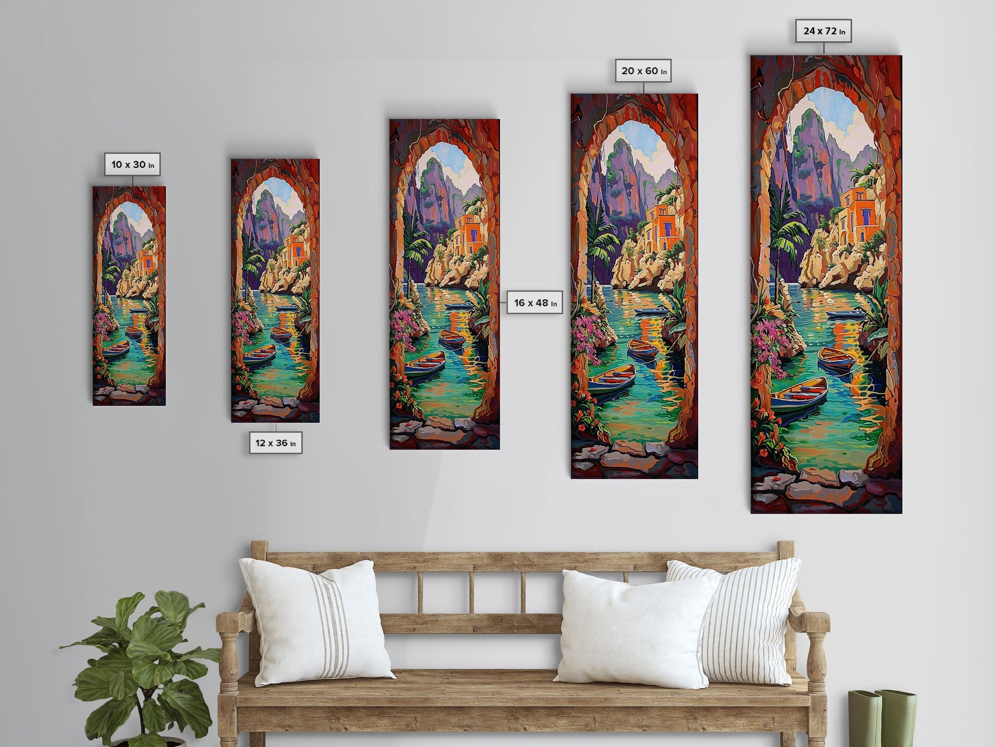 Printed Canvas Painting of Spanish Waterway, Tall Narrow Wall Art Framed and Printed on Canvas, Coastal Art Print for Vacation House Decor