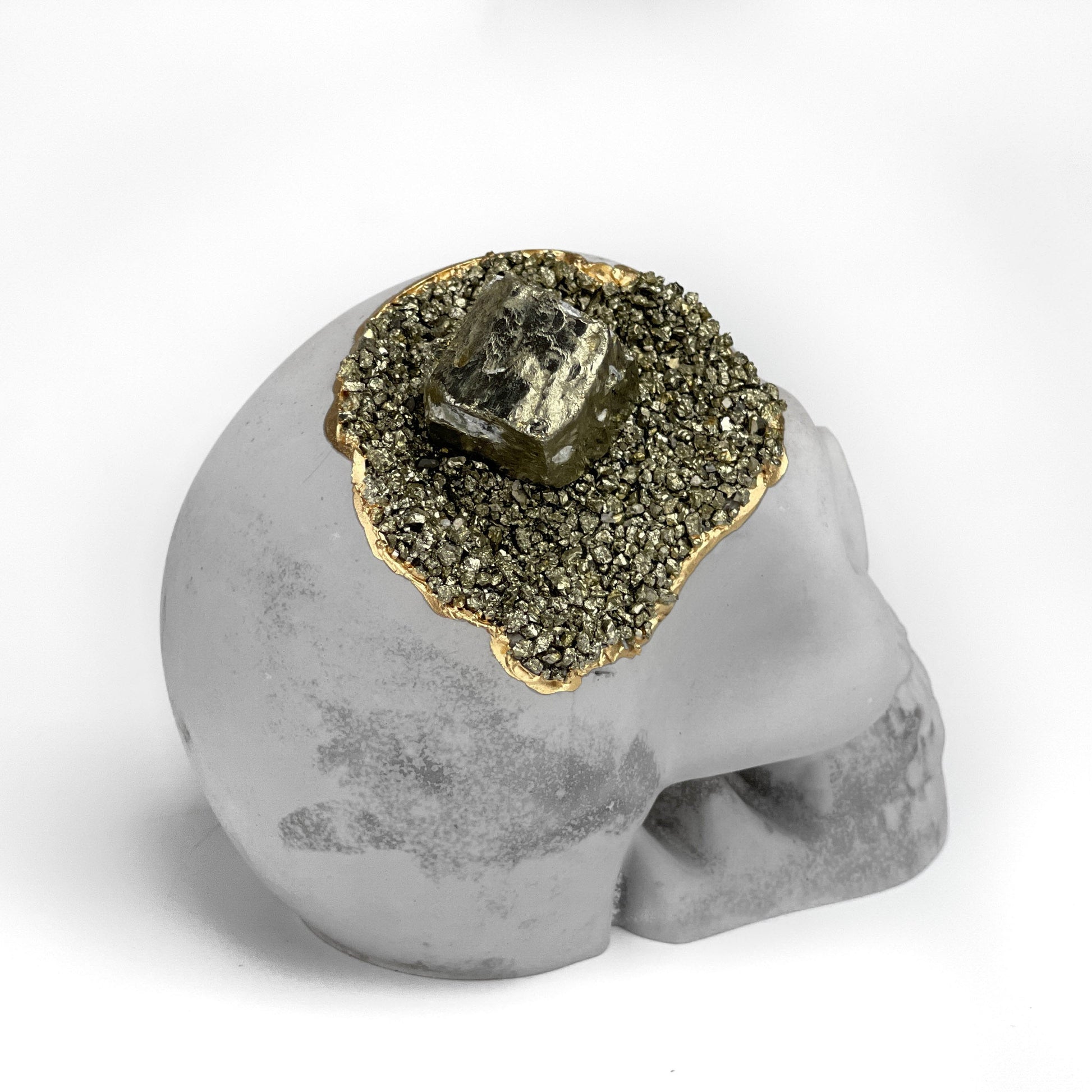 This unique and stunning piece of art is inspired by the belief in crystal power. This is a one-of-a-kind large concrete skull, skillfully hand-cast from high quality natural cement and adorned with natural Pyrite crystals. This is a realistic skull with an incredible geode on top.