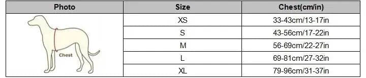 Size XS: chest is 33-43cm/13-17in Size S: chest is 43-56cm/17-22in Size M: chest is 56-69cm/22-27in Size L : chest is 69-81cm/27-32in Size XL: chest is 79-96cm/31-37in Note: 1) if there is discrepancy between the neck and the chest ,follow the chest size 2) if your dog is between sizes,please size up, choose larger size 3) please add 3-4cm to the chest girth of your dog, for example,if the chest girth of your dog is 66cm,you need to choose 69-70cm chest, L size