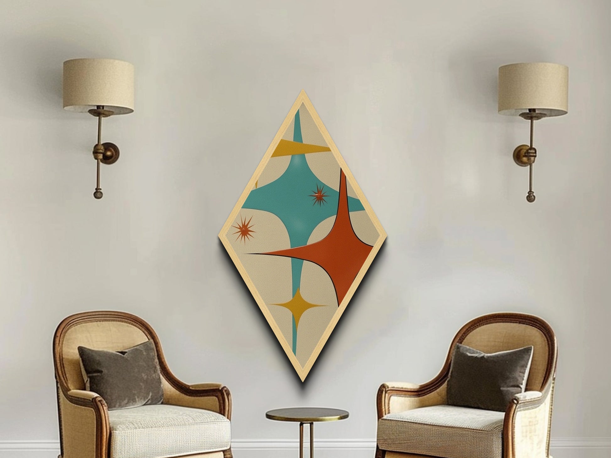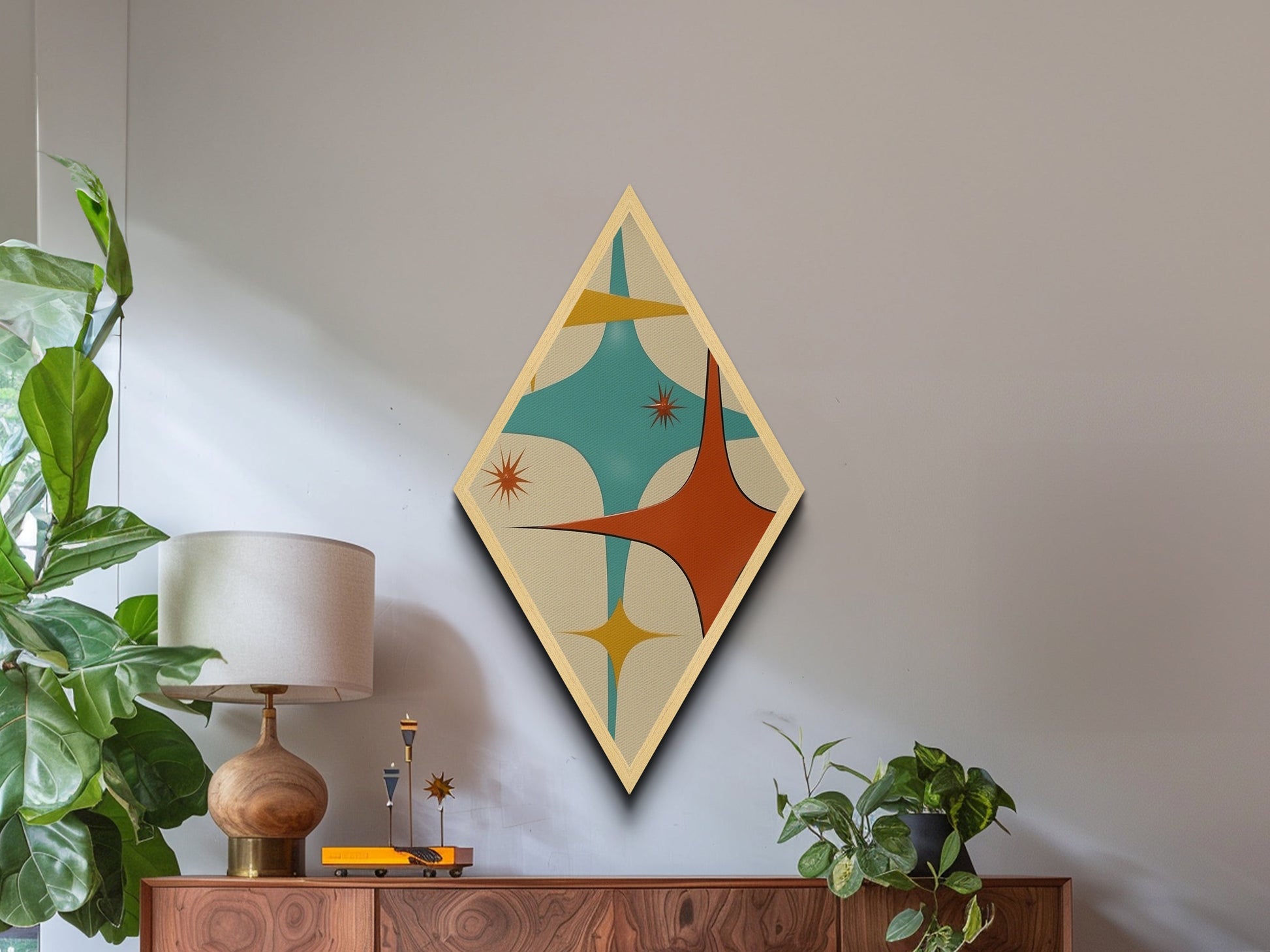 Retro Rocket Spikes – Diamond Shaped Canvas Art Print, midcentury atomic design, minimalist geometric decor, starburst pattern artwork
