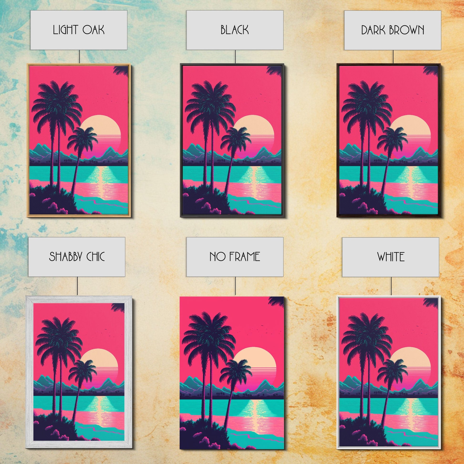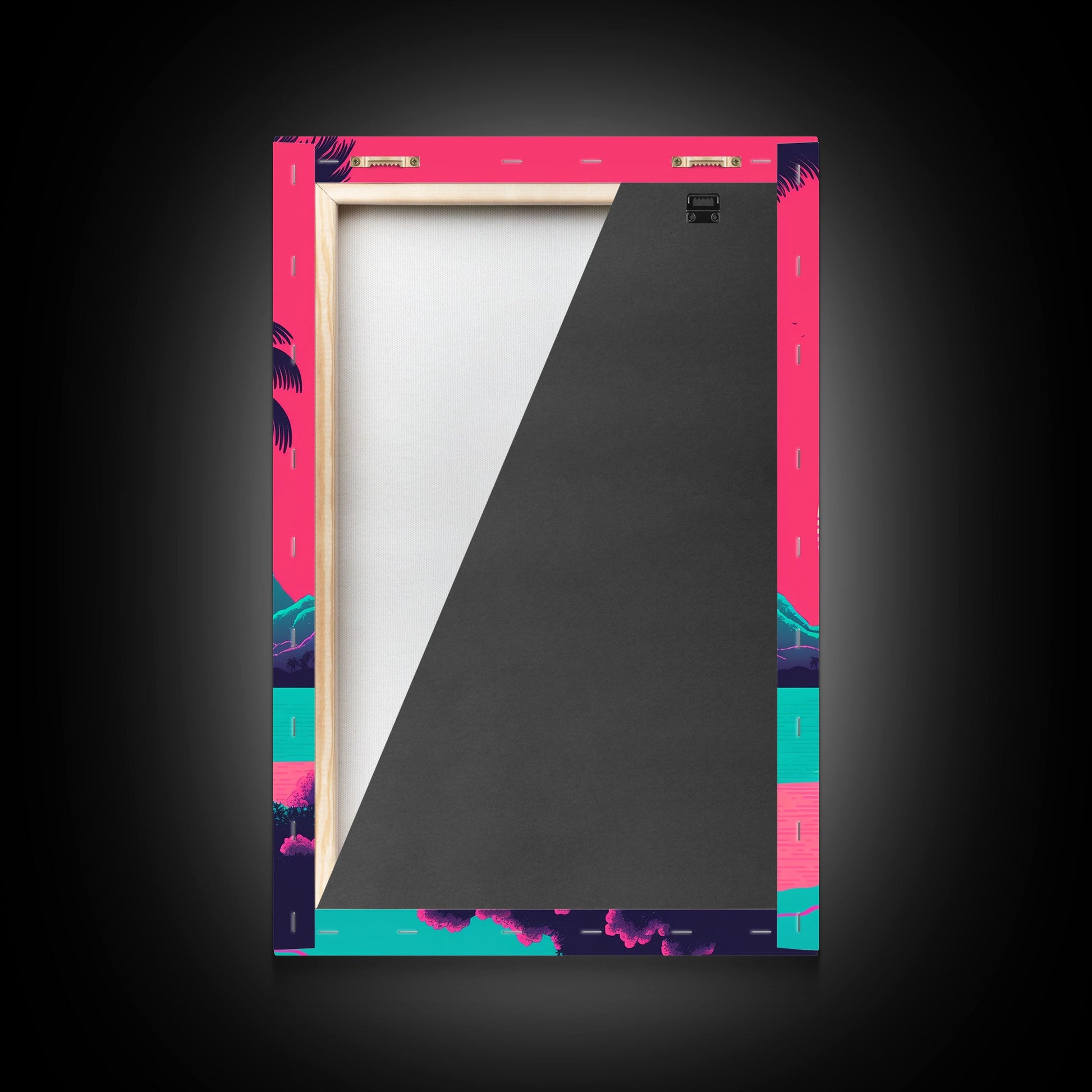 Retro Synthwave 80s Vibes Sunset Over The Mountains and Palm Trees, Highway, Framed Canvas Print