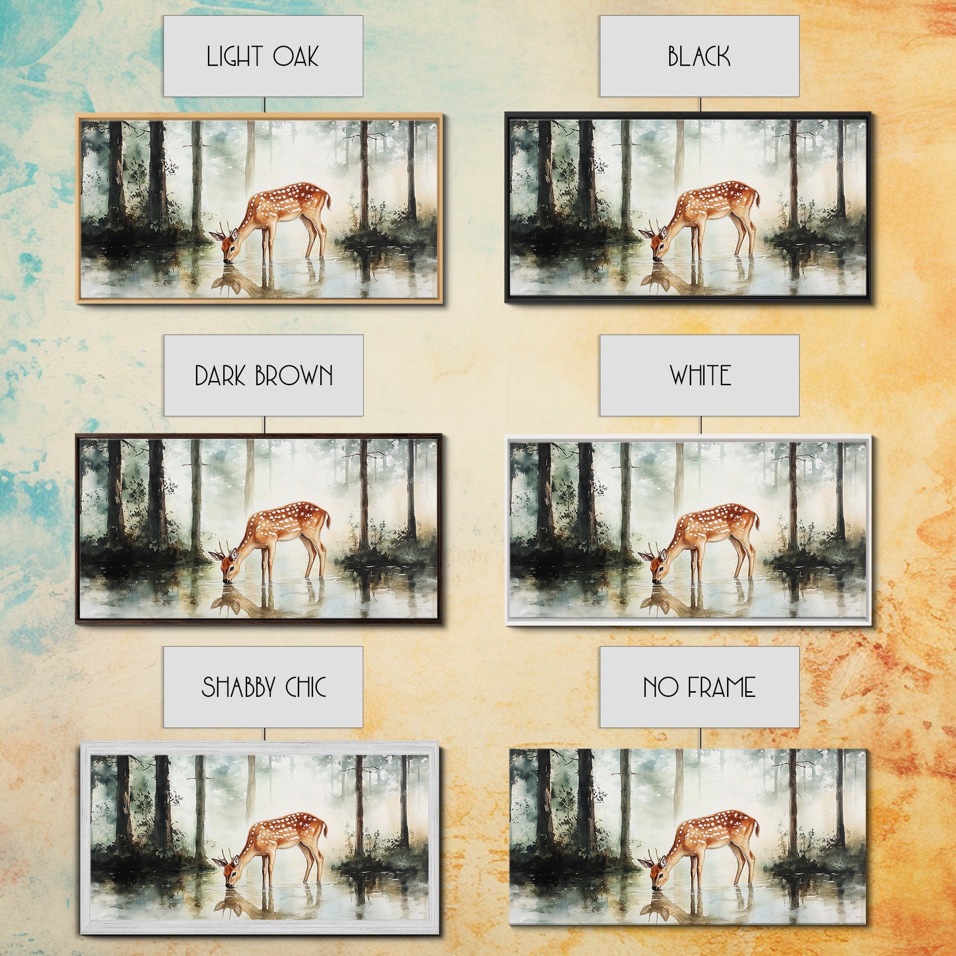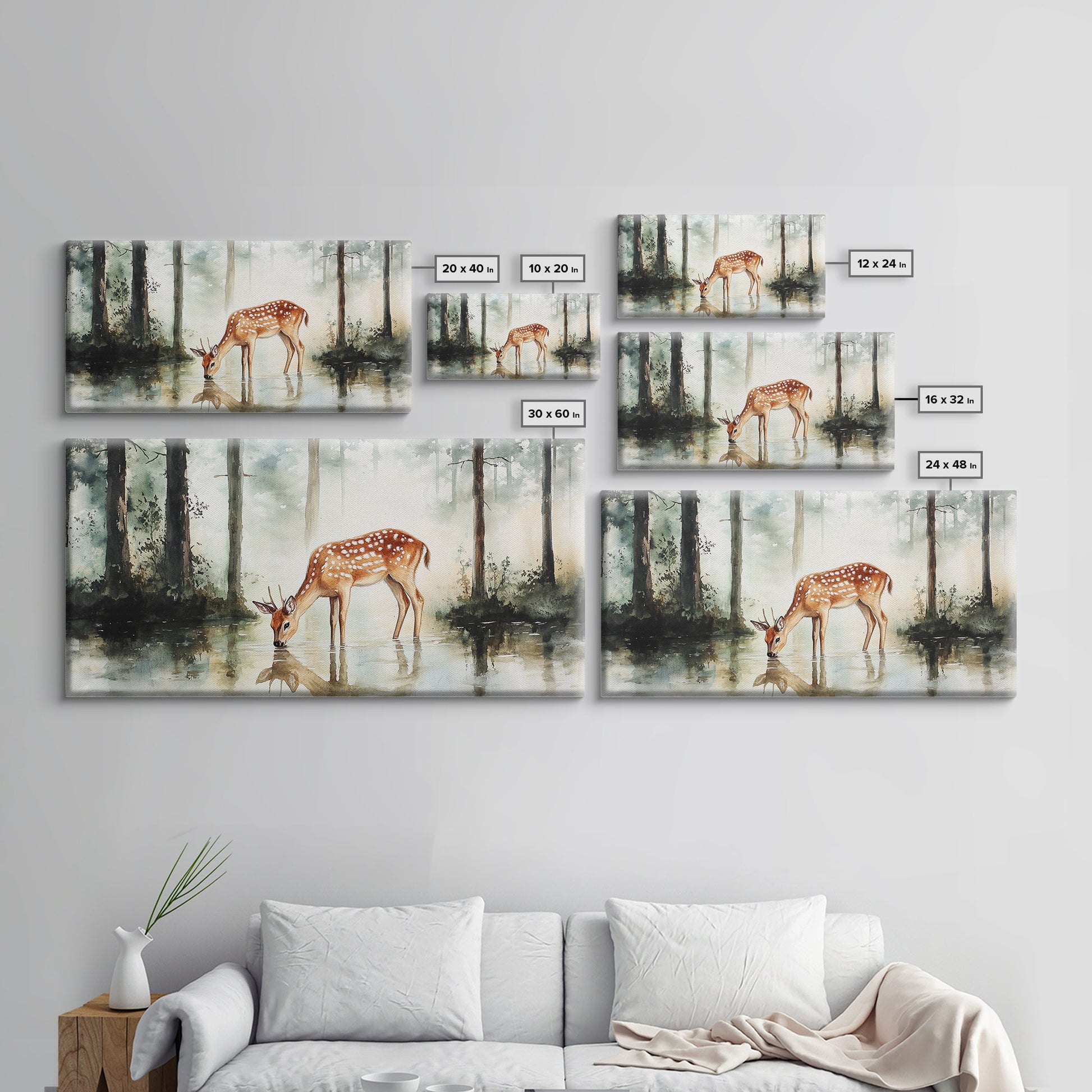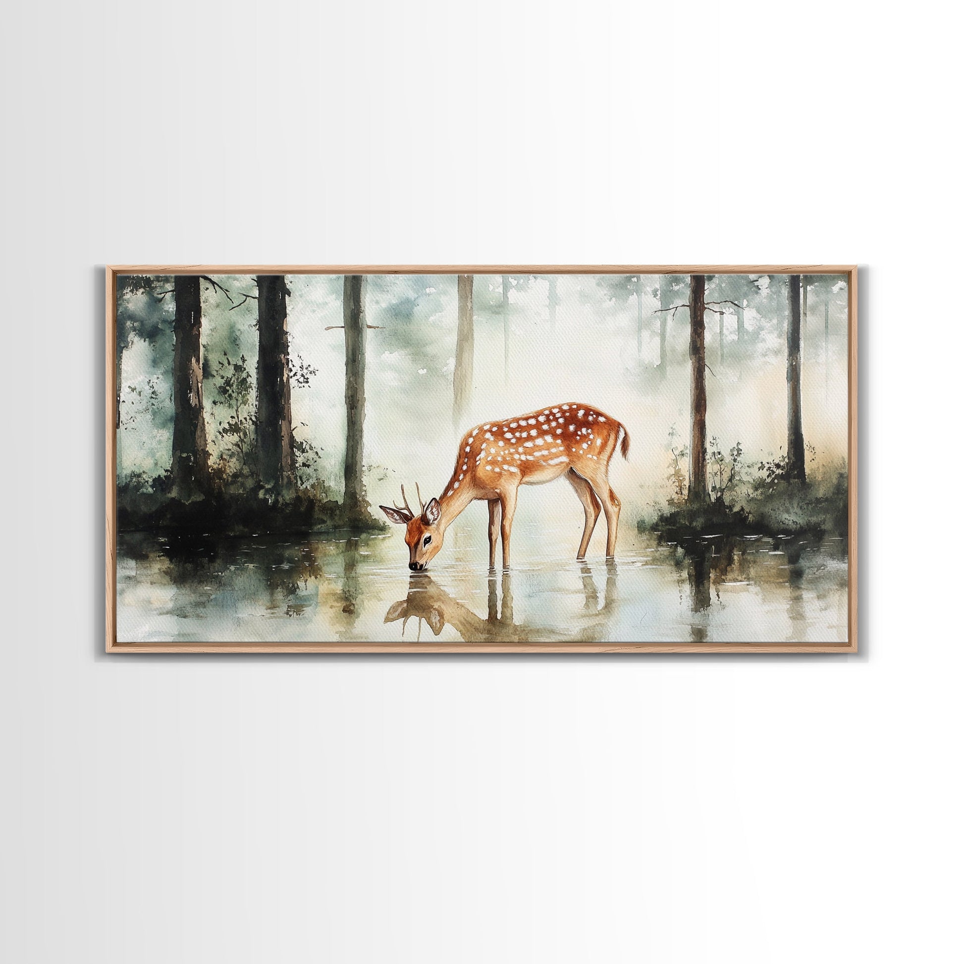 Rustic Farmhouse or Cabin Wall Art Painting of a Deer Drinking Water In The Forest, Minimalist Farmhouse Decor, Framed Canvas Print