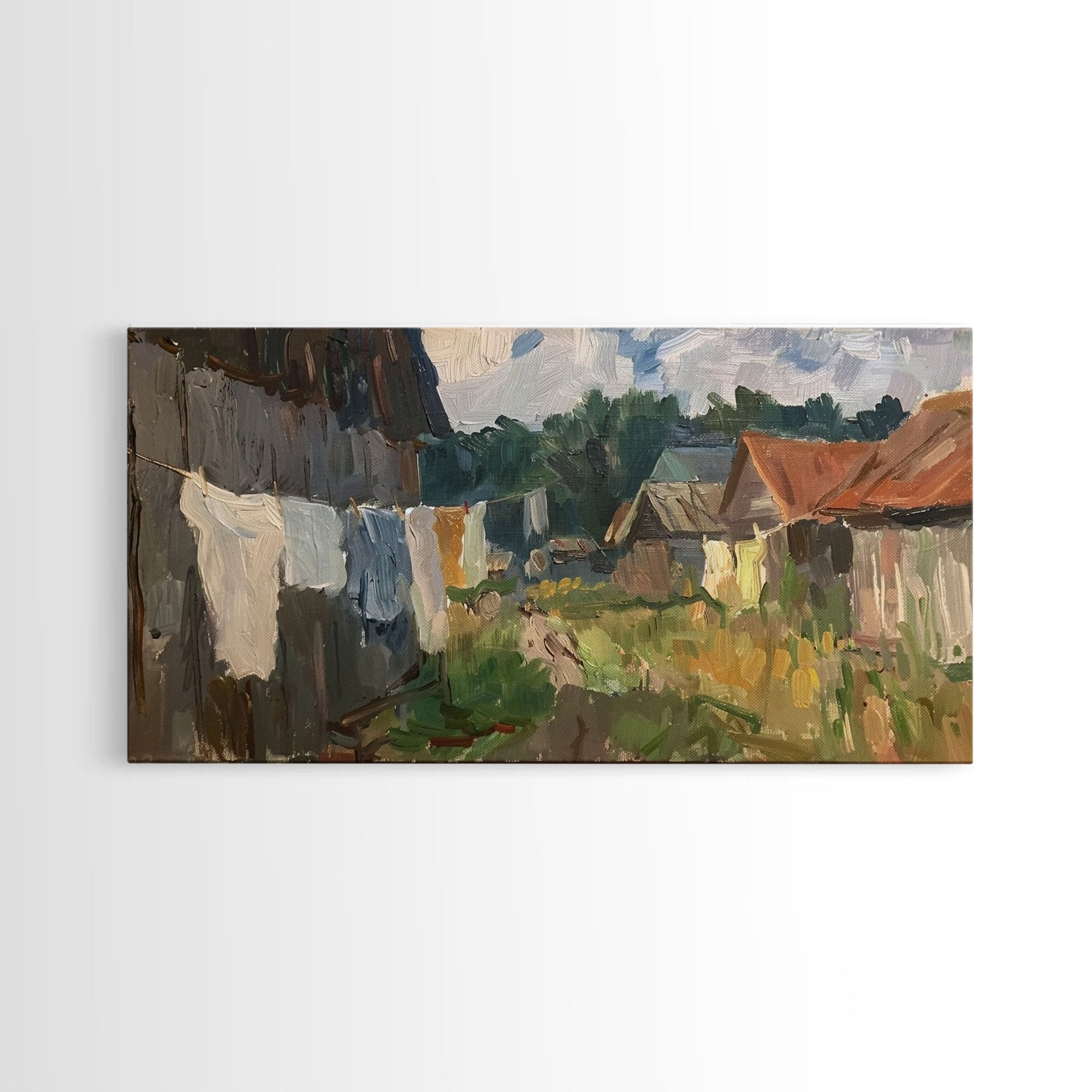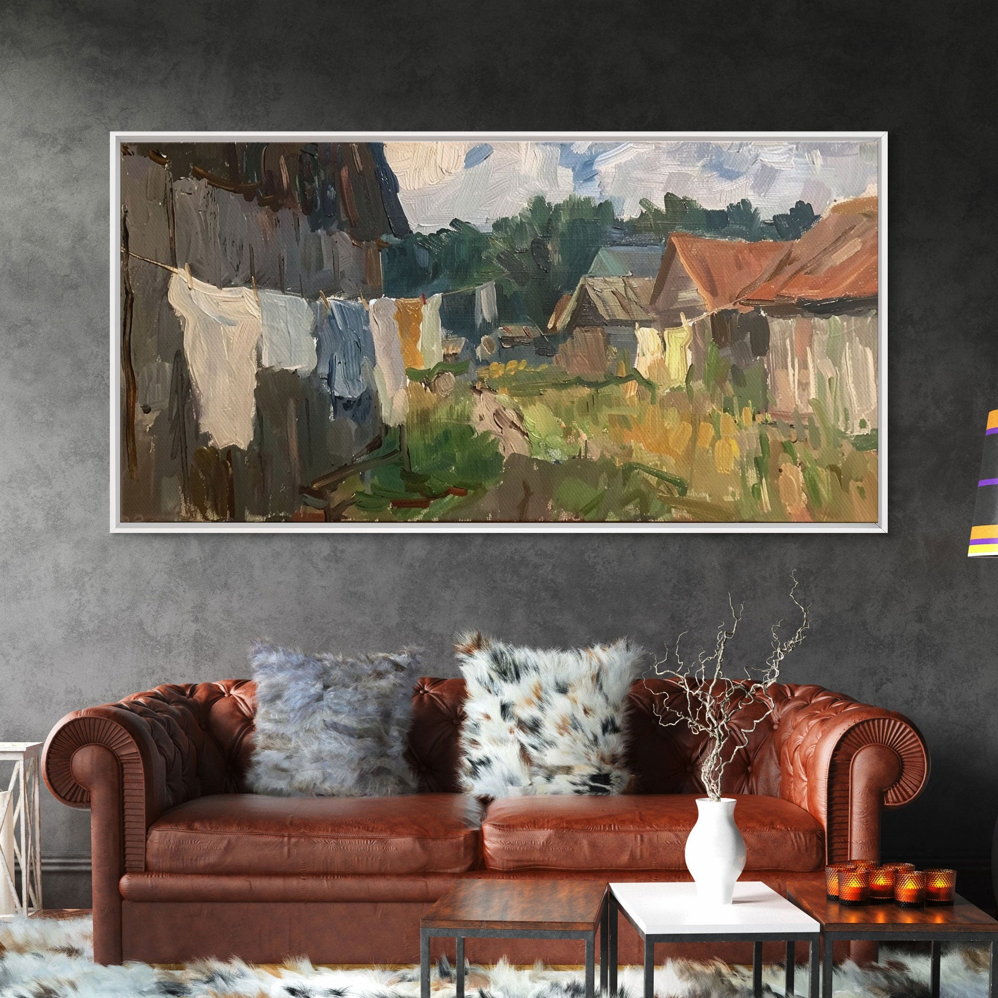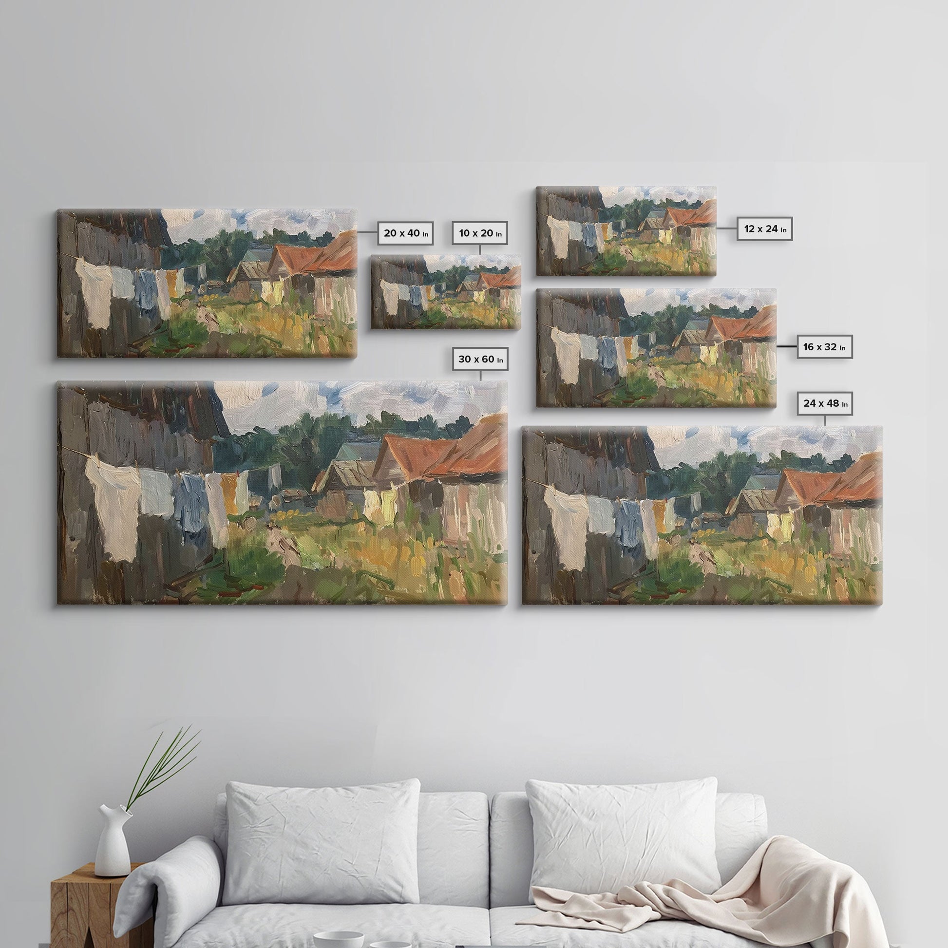 Rustic Farmyard with Laundry, Framed Canvas Print, Farmhouse Wall Art, Living Room Decor, Country Style, Outdoor Scene