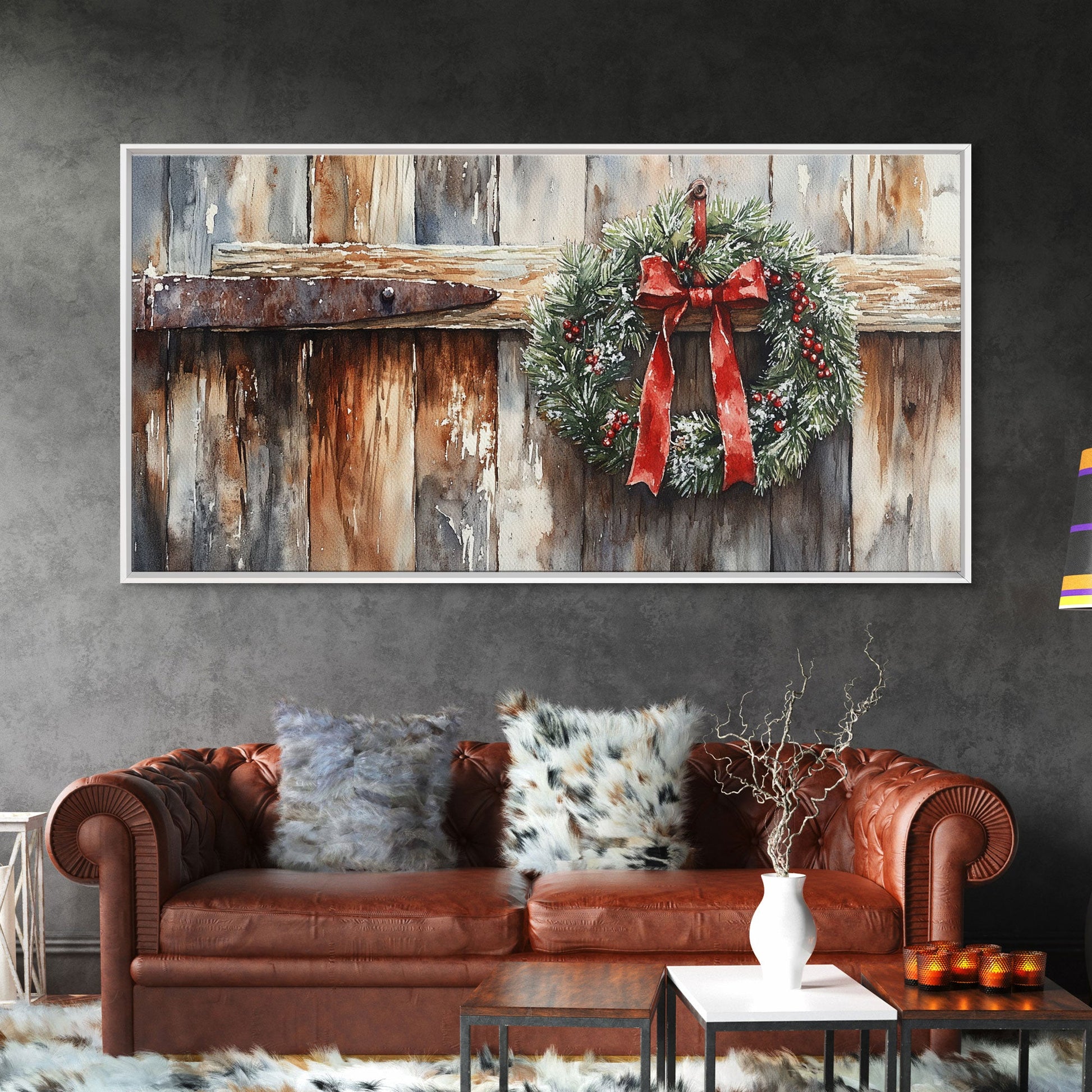Rustic Wreath Red Ribbon Canvas Print Christmas Door Decor Farmhouse Christmas Wall Art Framed Canvas Print Christmas Outdoor Decor