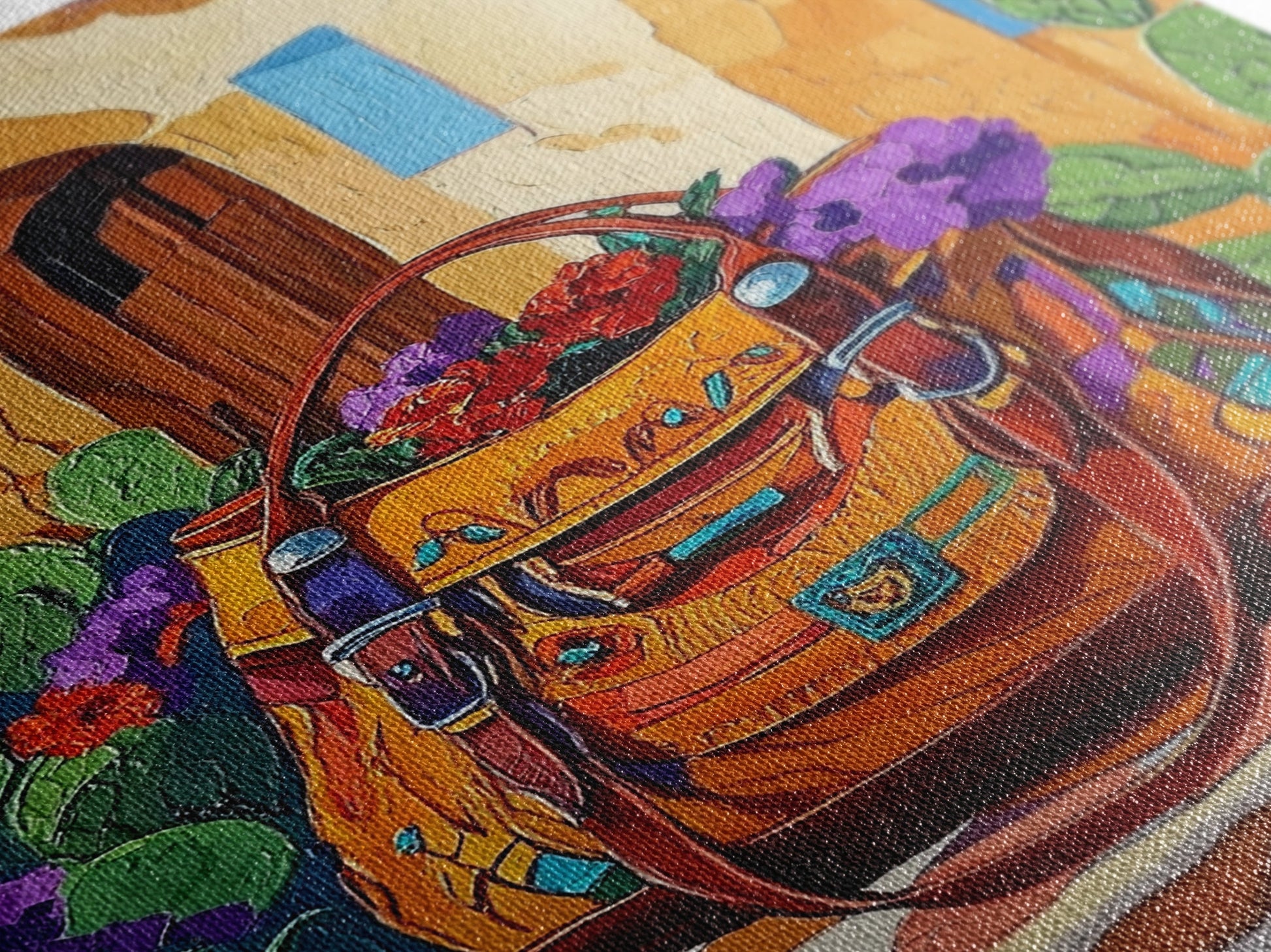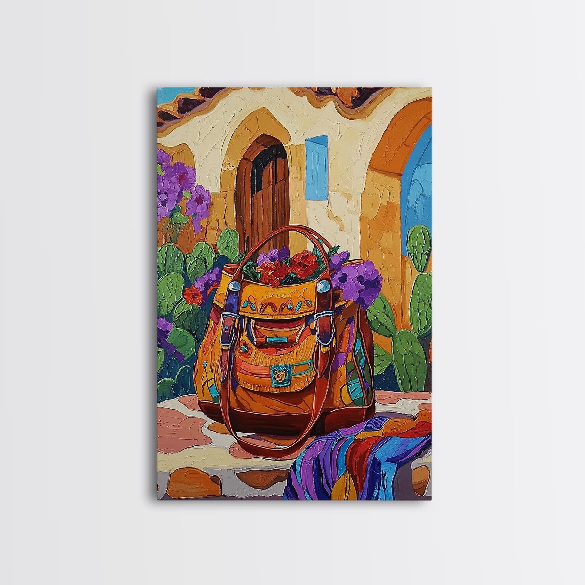 Saddle Bag, Desert Flowers, Southwest Style, Rustic Charm, Mexican Market Vibe, Entryway Wall Art, Framed Canvas Print, Colorful Boho Art