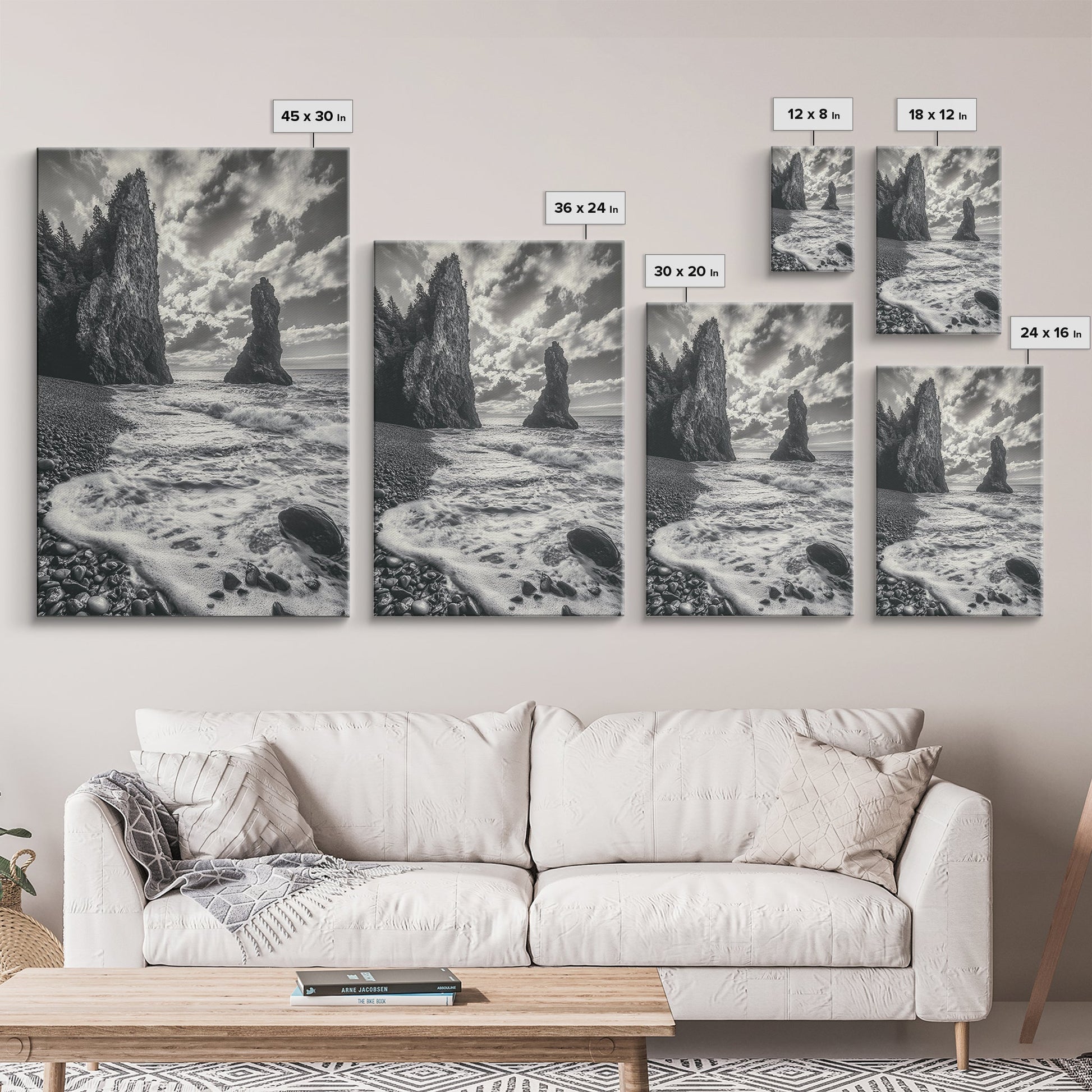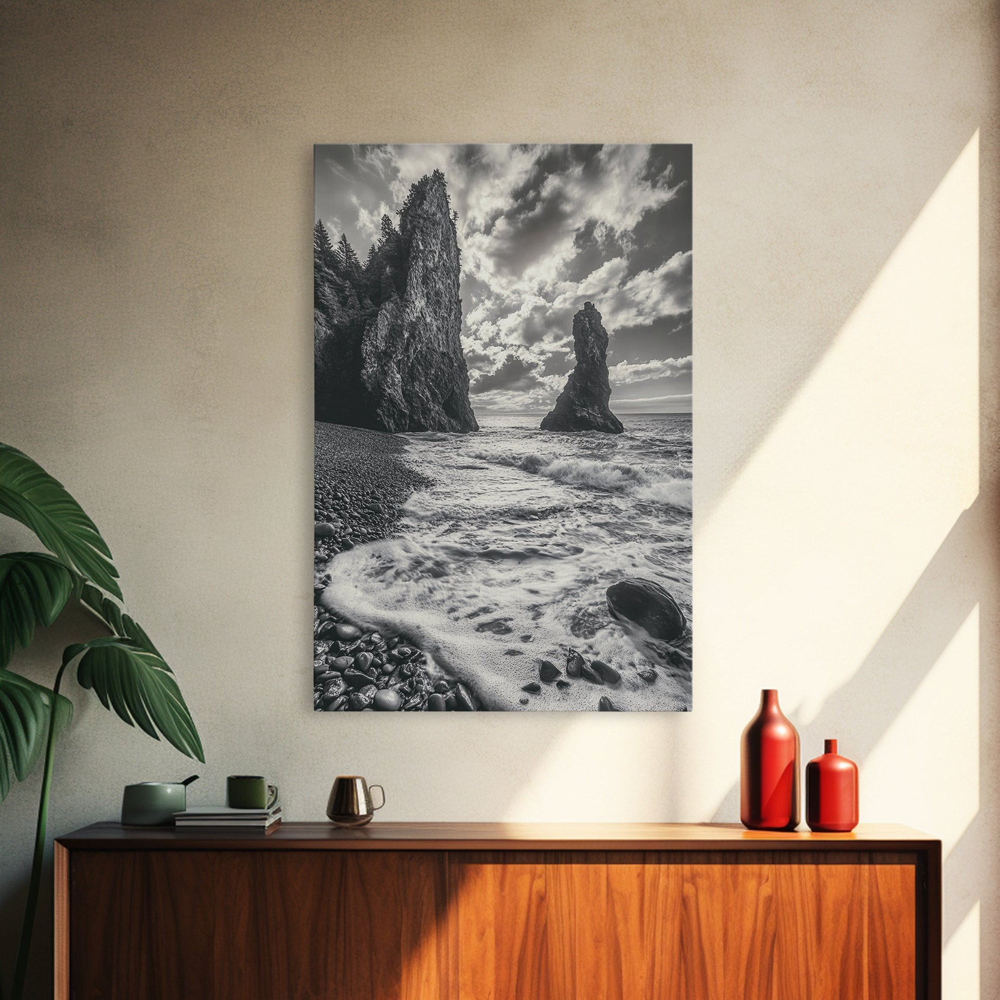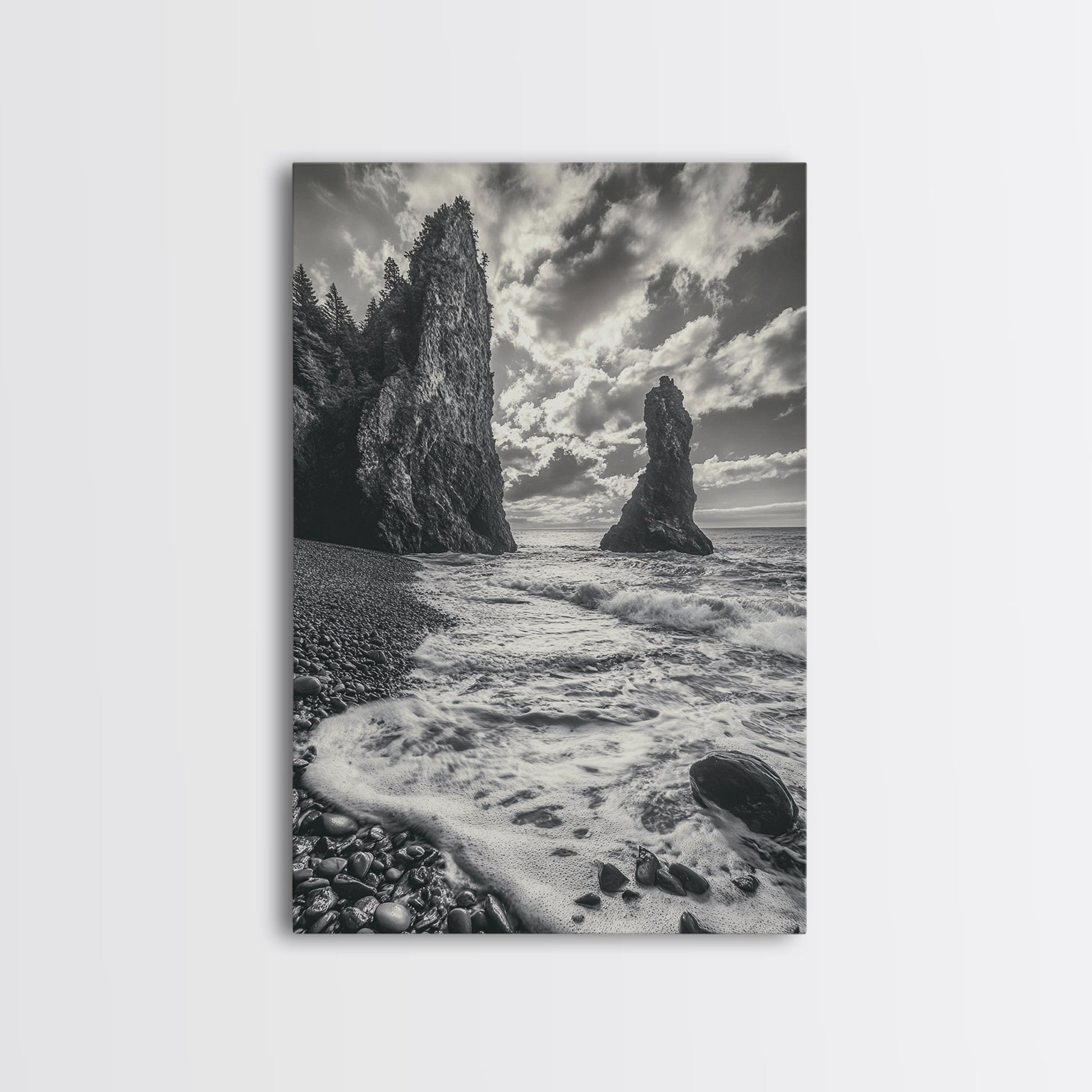 Sea Spires, Ocean Foam, Pebble Shore, Wild Coast, Framed Canvas Print, Living Room Wall Art, Dramatic Landscape, Coastal Home Decor