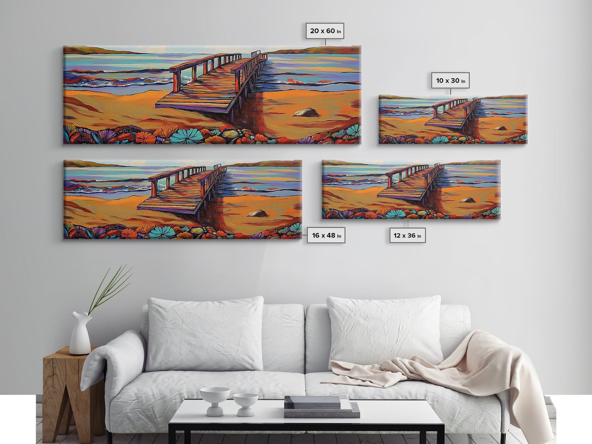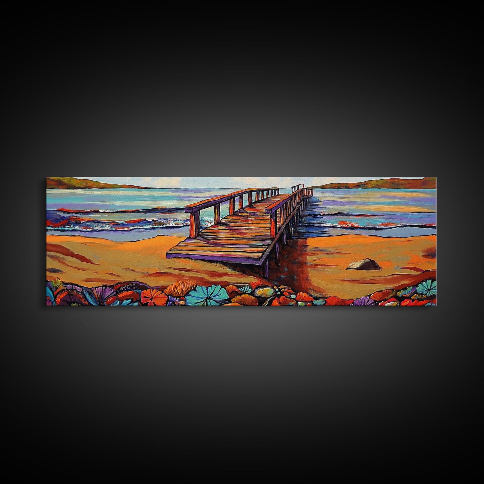 Seaside Pier, Vibrant Coast, Beach View, Framed Canvas Print, coastal artwork, beach house decor, summer vibes, living room art
