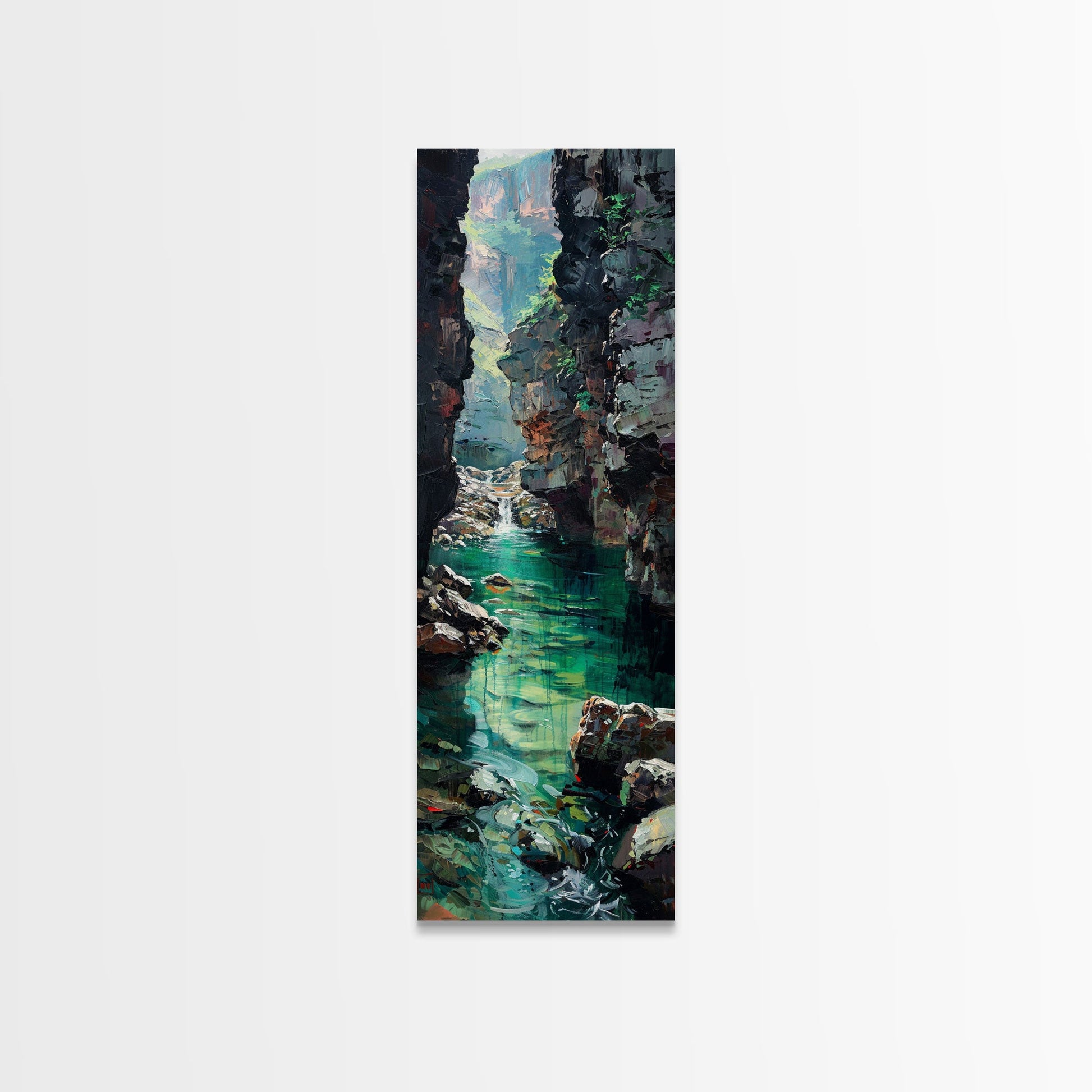 Serene Mountain River Gorge Scene Skinny Art Framed Canvas Print For Living Room Or Bedroom Wall Decor