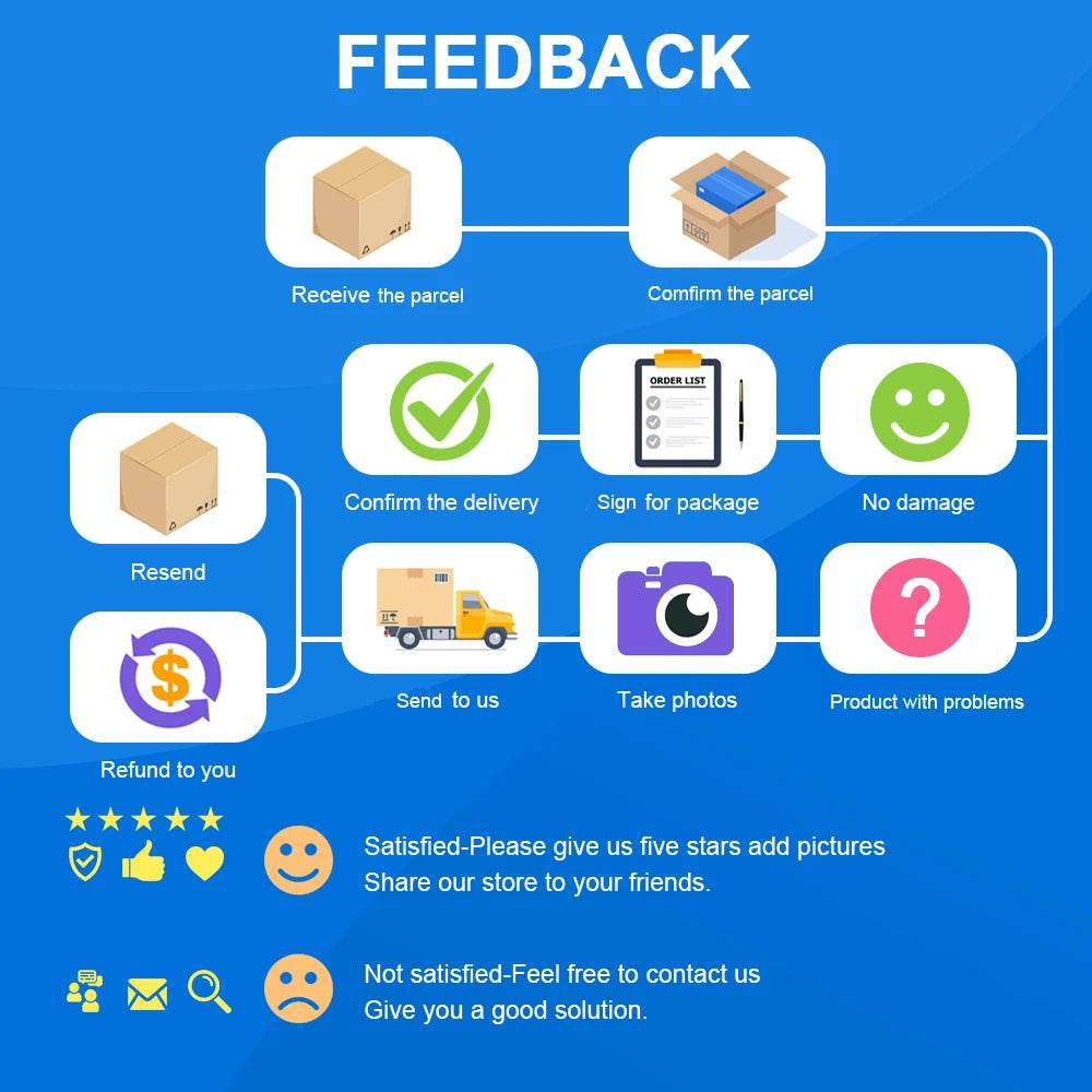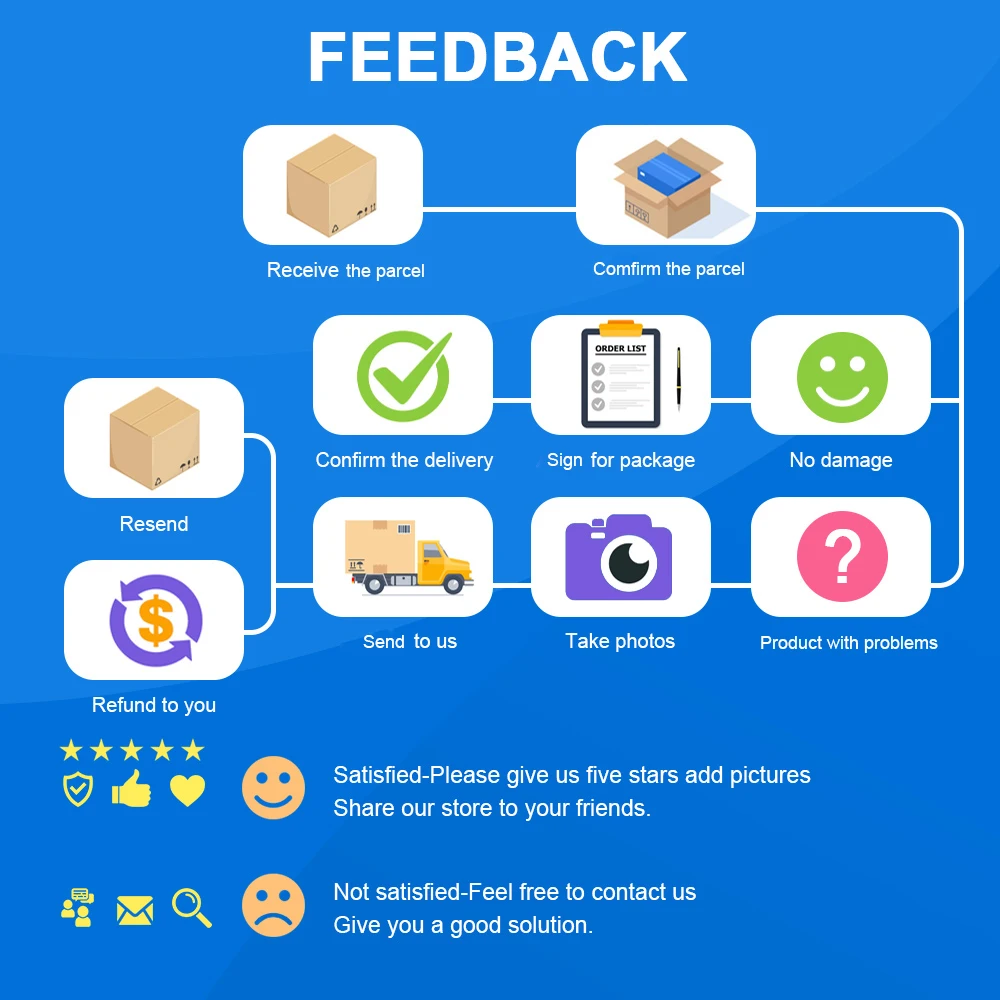 2. If there're some product problems after receiving your package, please contact us in time, we will offer the after-sale service and solve the problem for you quickly(except due to the time difference we can't reply you in time), please don't open dispute in advance, thank you for your understanding !
