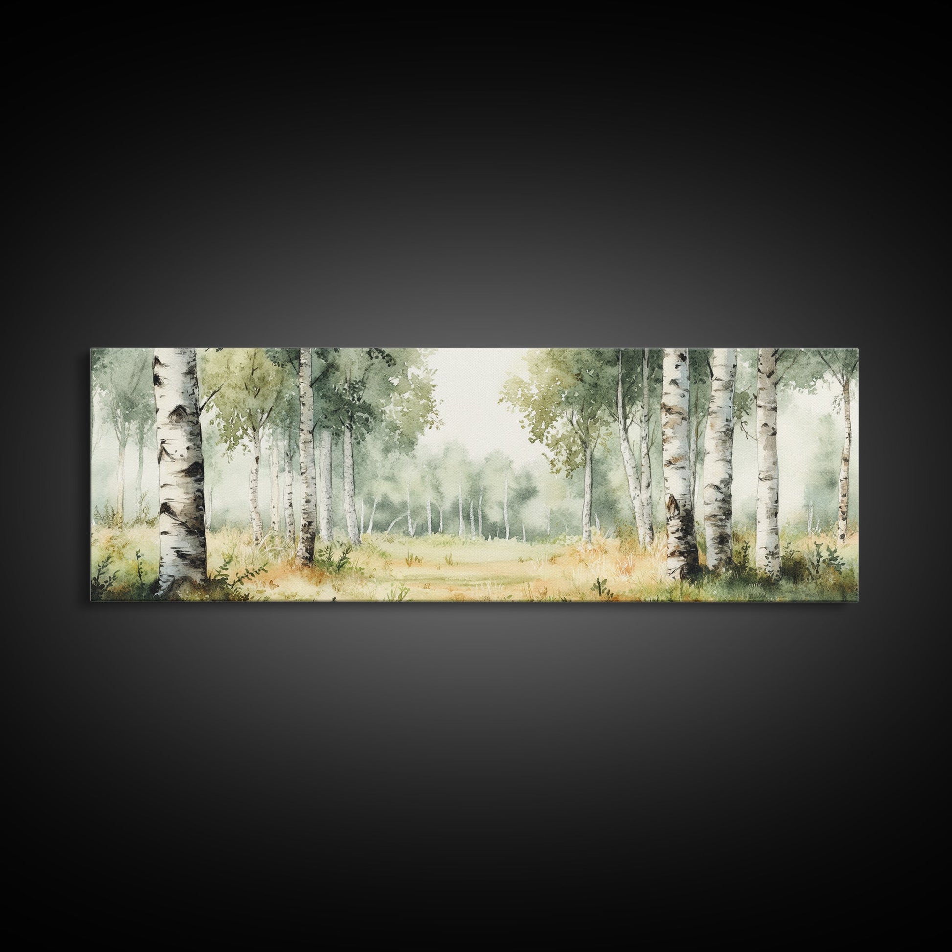 Silver Birch Trees in Spring Panoramic Canvas Print, Panoramic Painting, Aspen Trees Painting, Forest Landscape Horizontal Wall Art