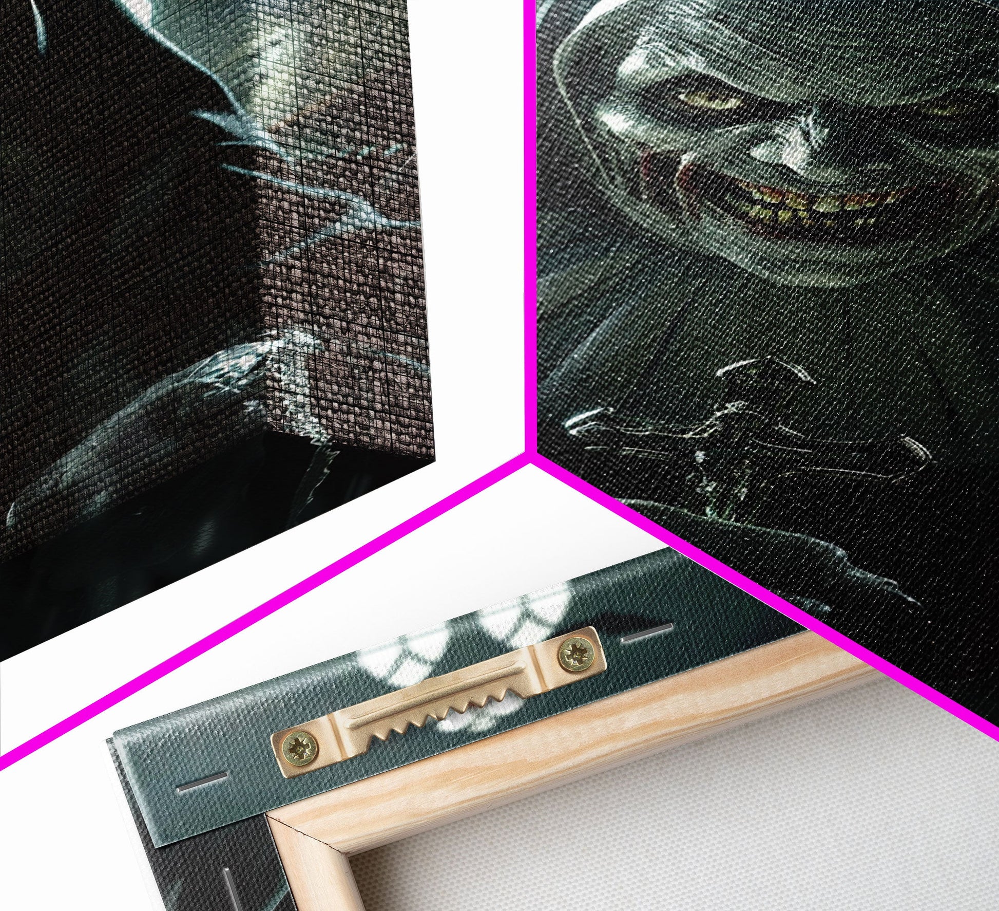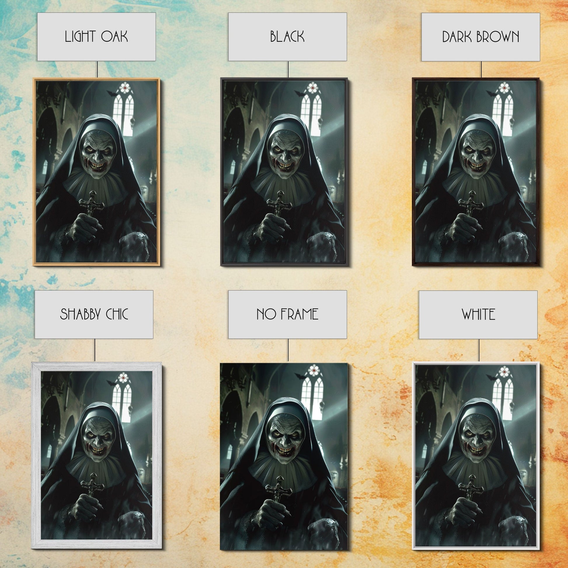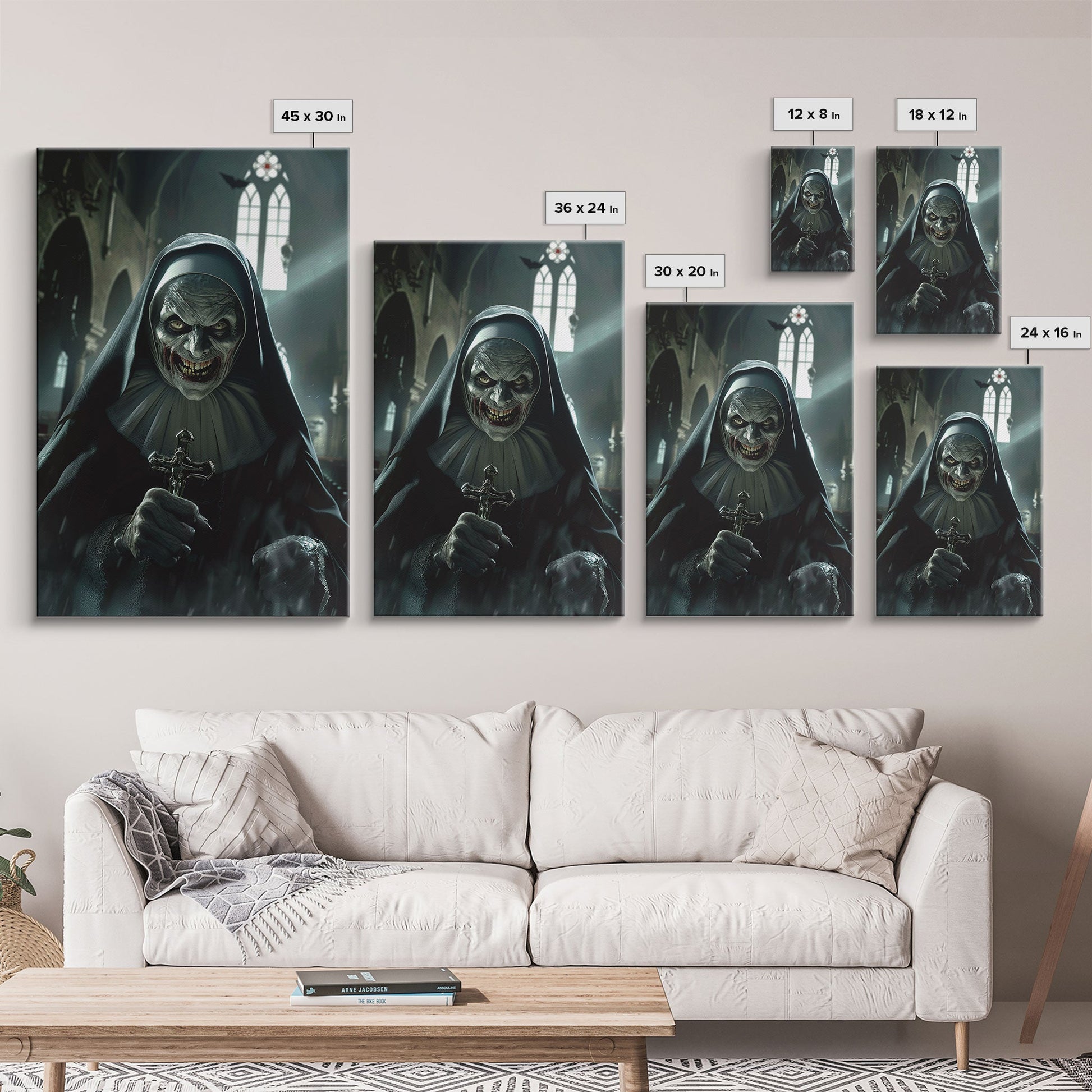Sinister Nun with Crucifix in Haunted Church - Scary Halloween Themed Framed Canvas Print, Creepy Gothic Home Wall Decor