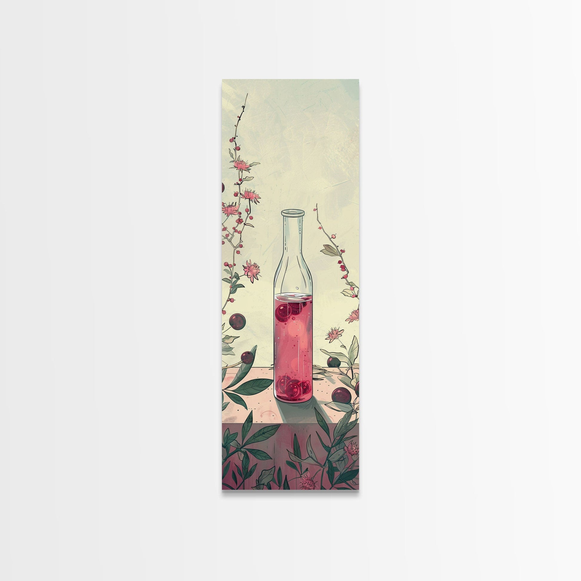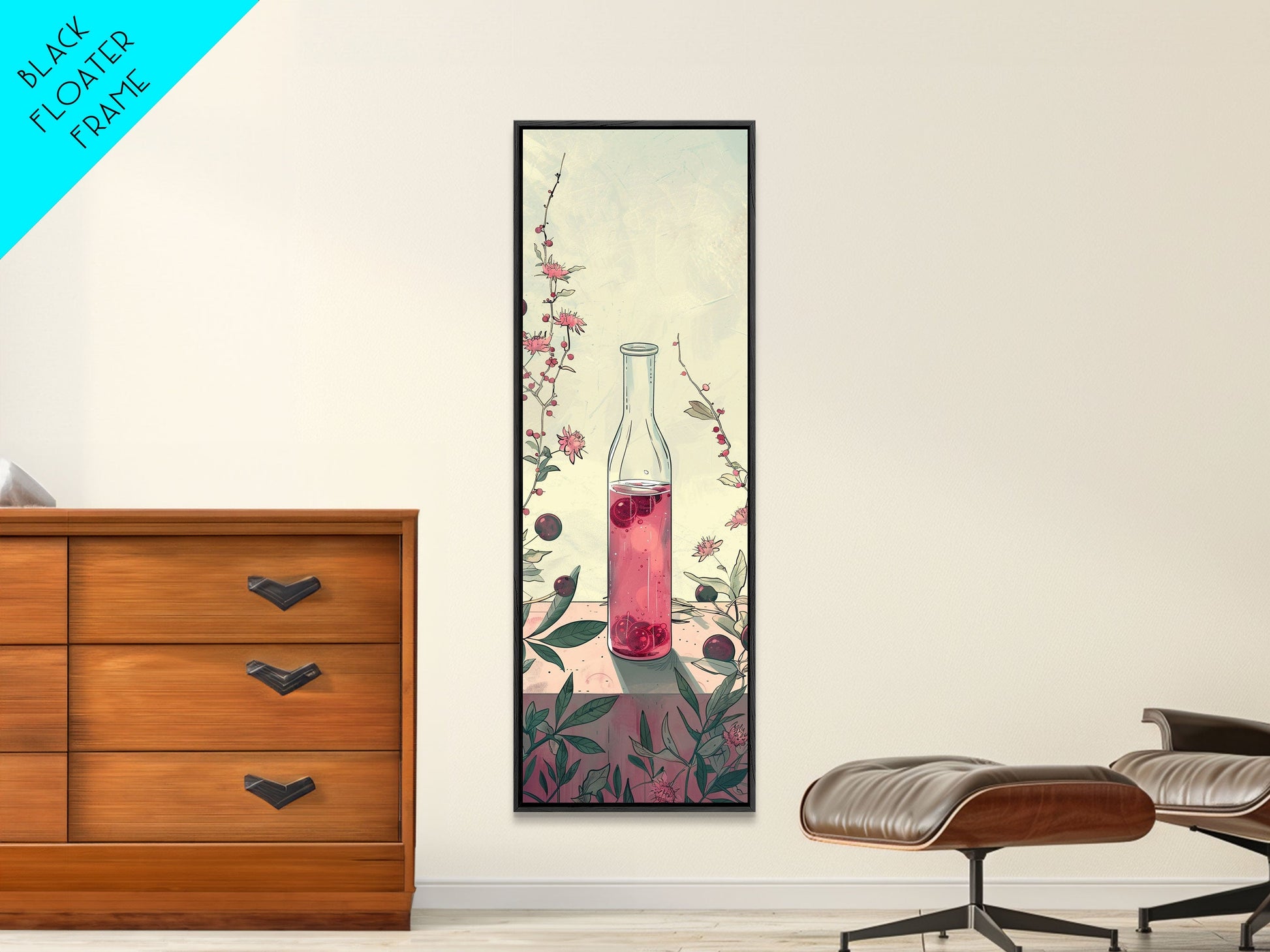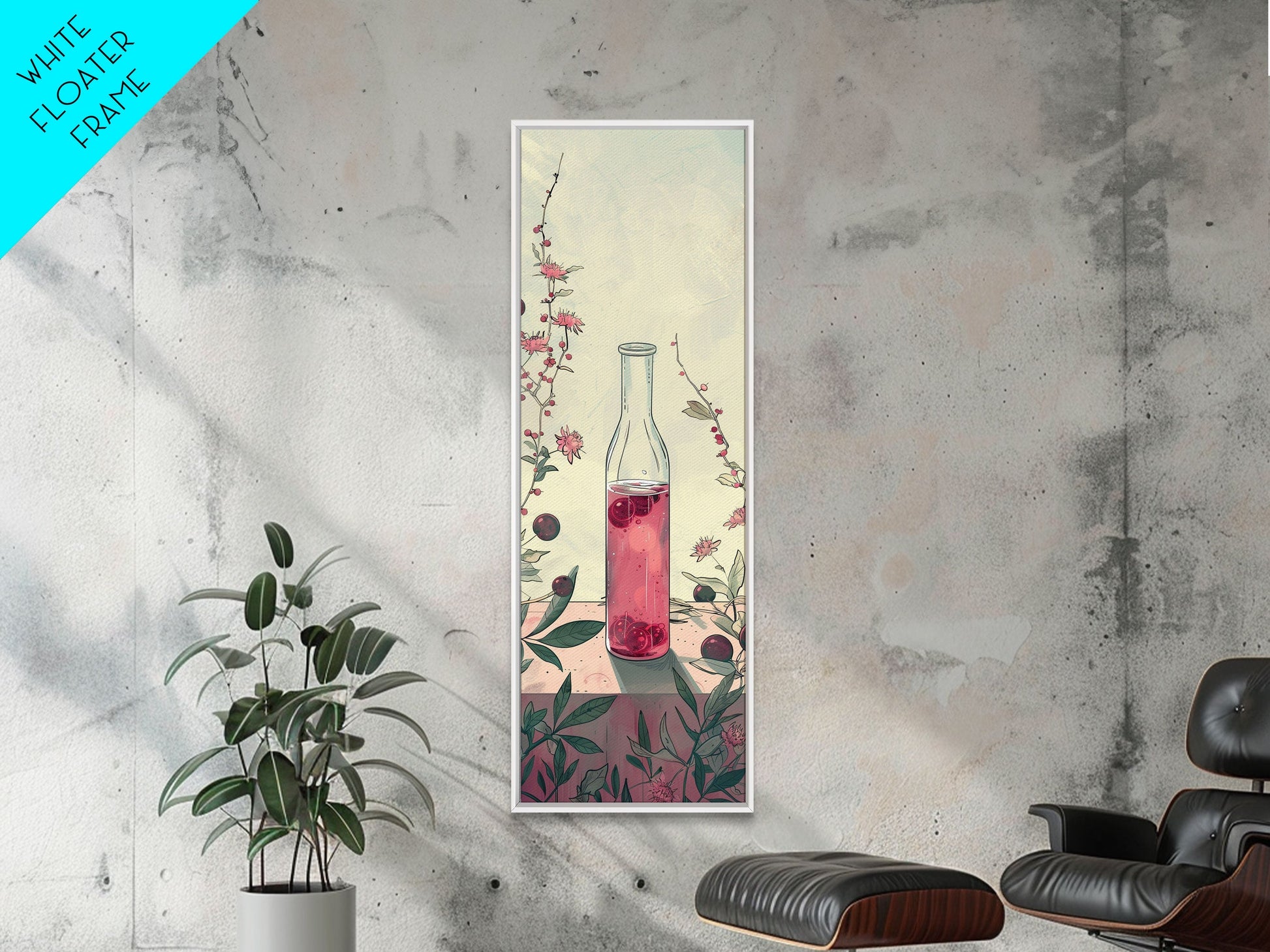 Skinny Art of Still Life with Elegant Glass Bottle and Floral Accents – Japanese-Inspired Framed Canvas Print