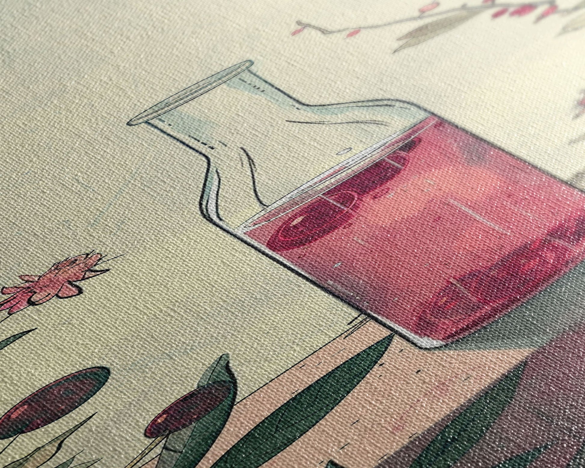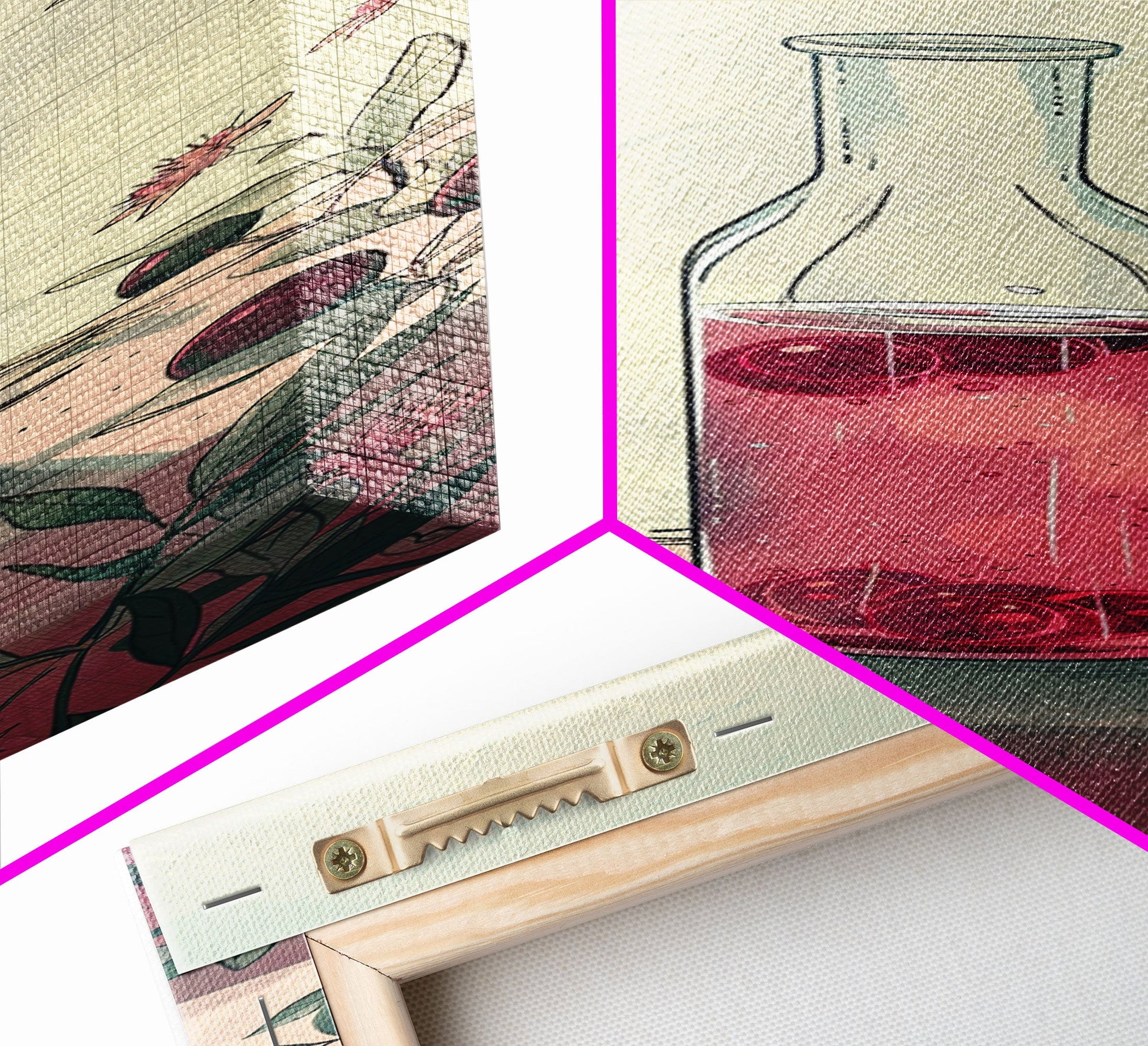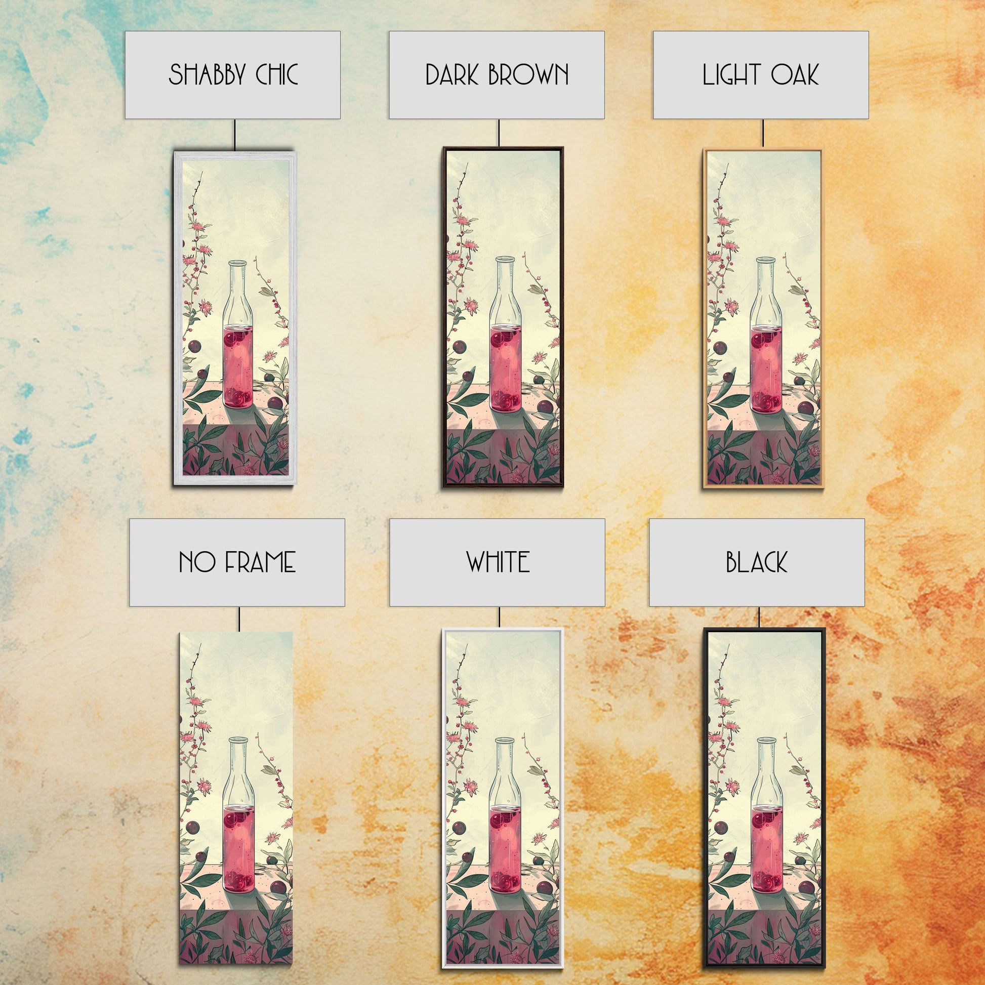 Skinny Art of Still Life with Elegant Glass Bottle and Floral Accents – Japanese-Inspired Framed Canvas Print