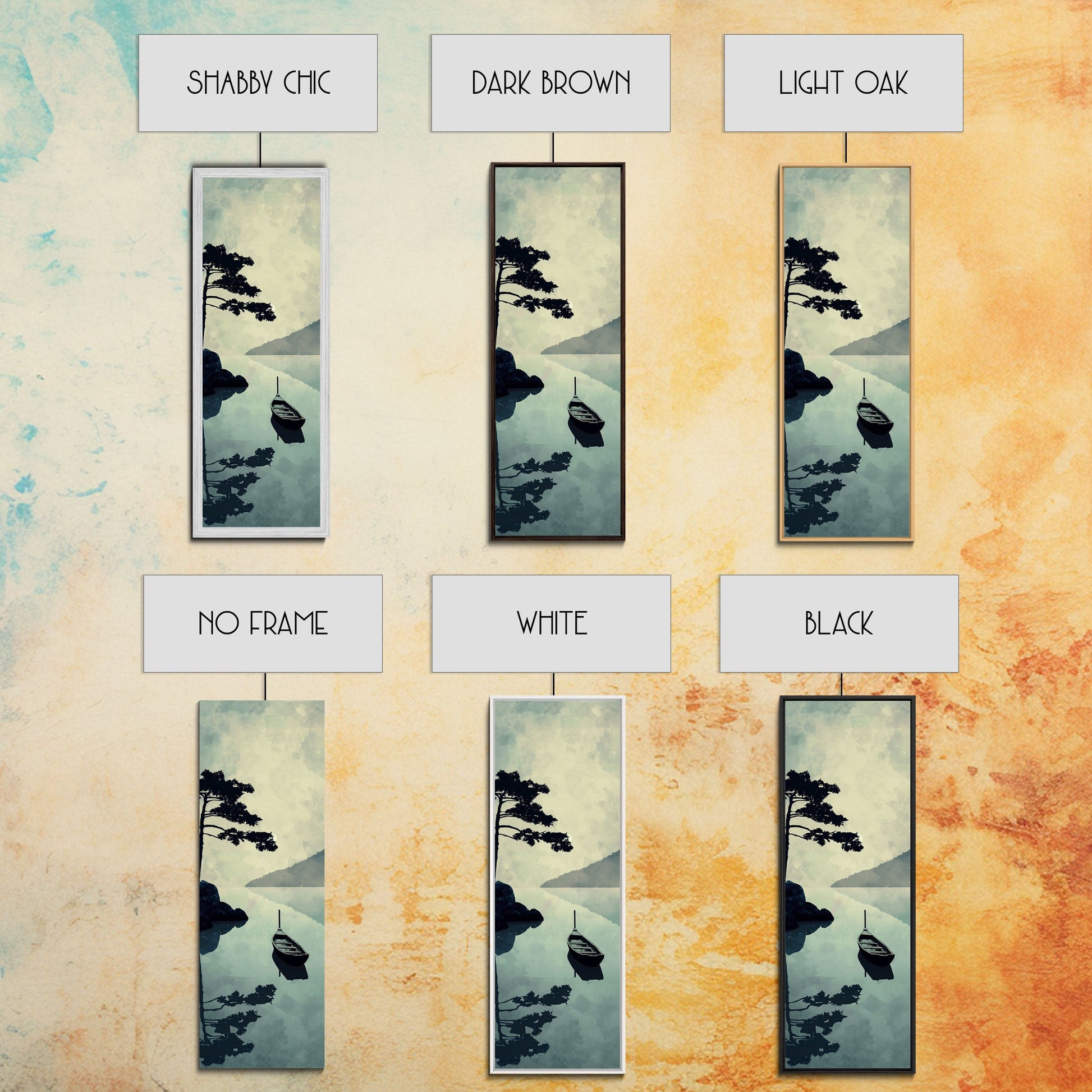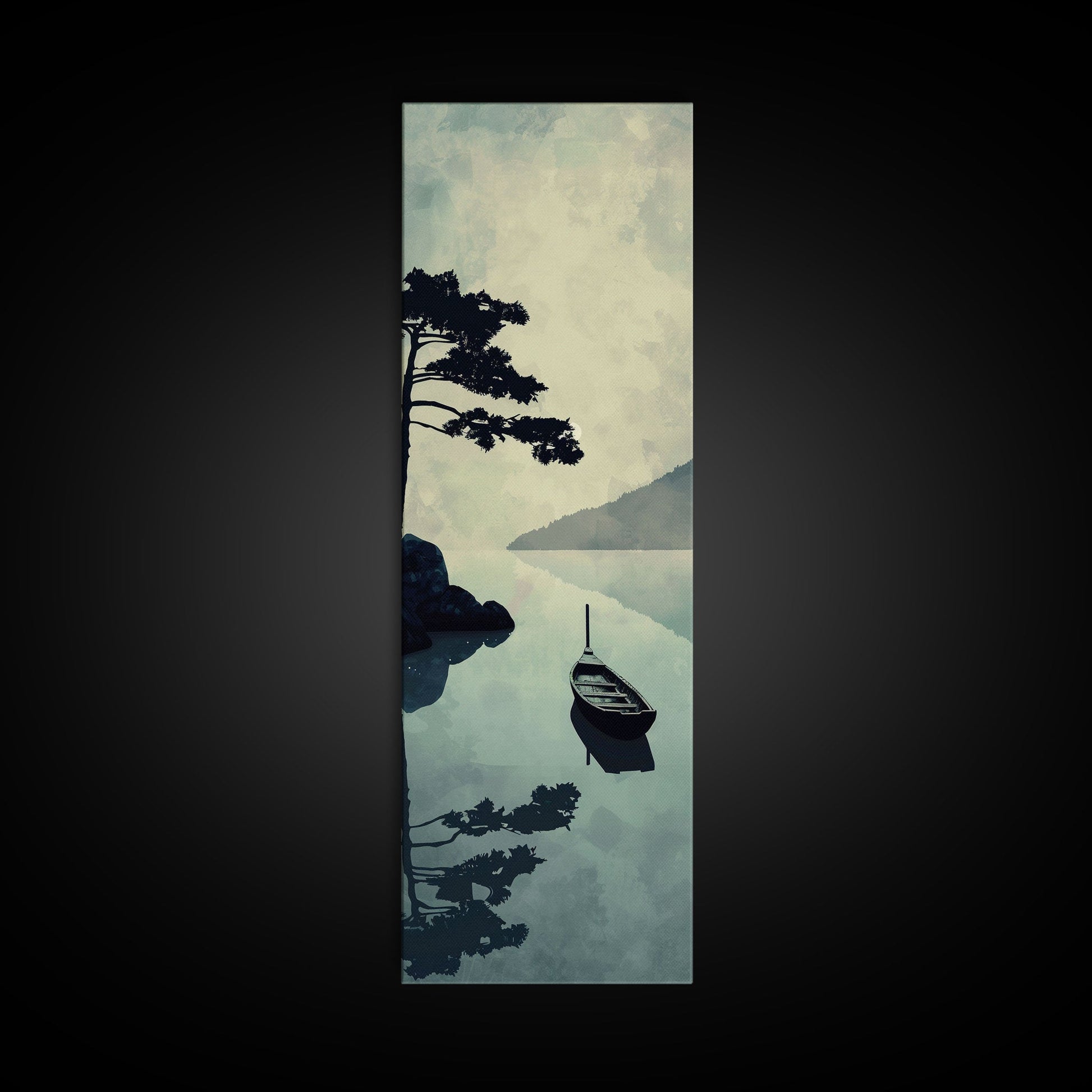 Skinny Art Tall Art Serene Lake Scene With Boat Wood Block Print Japanese Style Art Framed Canvas Print Calm Reflections On Still Water
