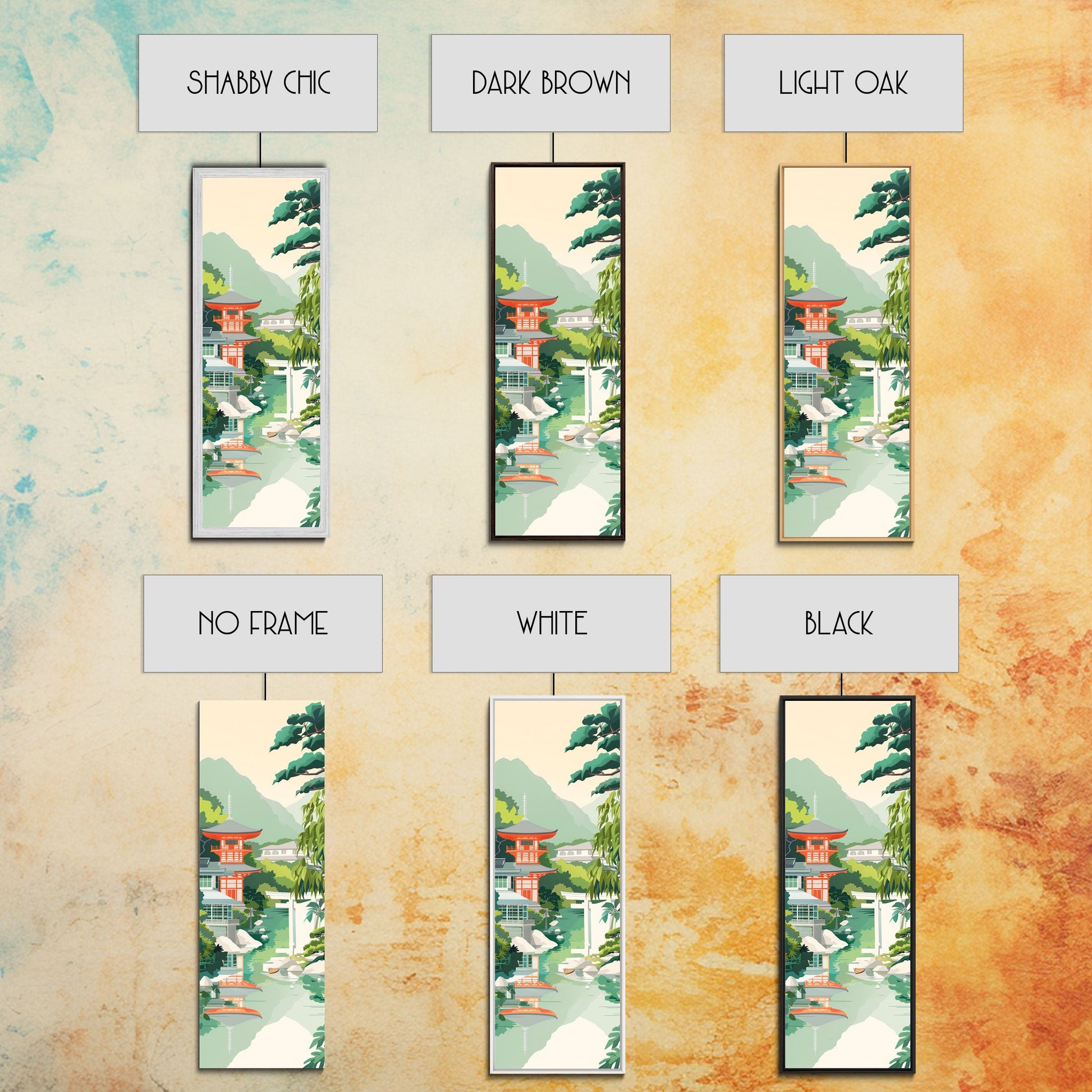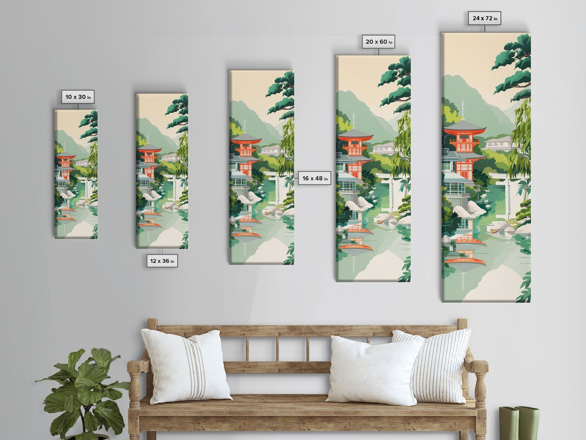 Skinny Art Tall Art Tranquil Japanese Garden Wood Block Print Japanese Style Art With Pagoda Reflected In Water Framed Canvas Print