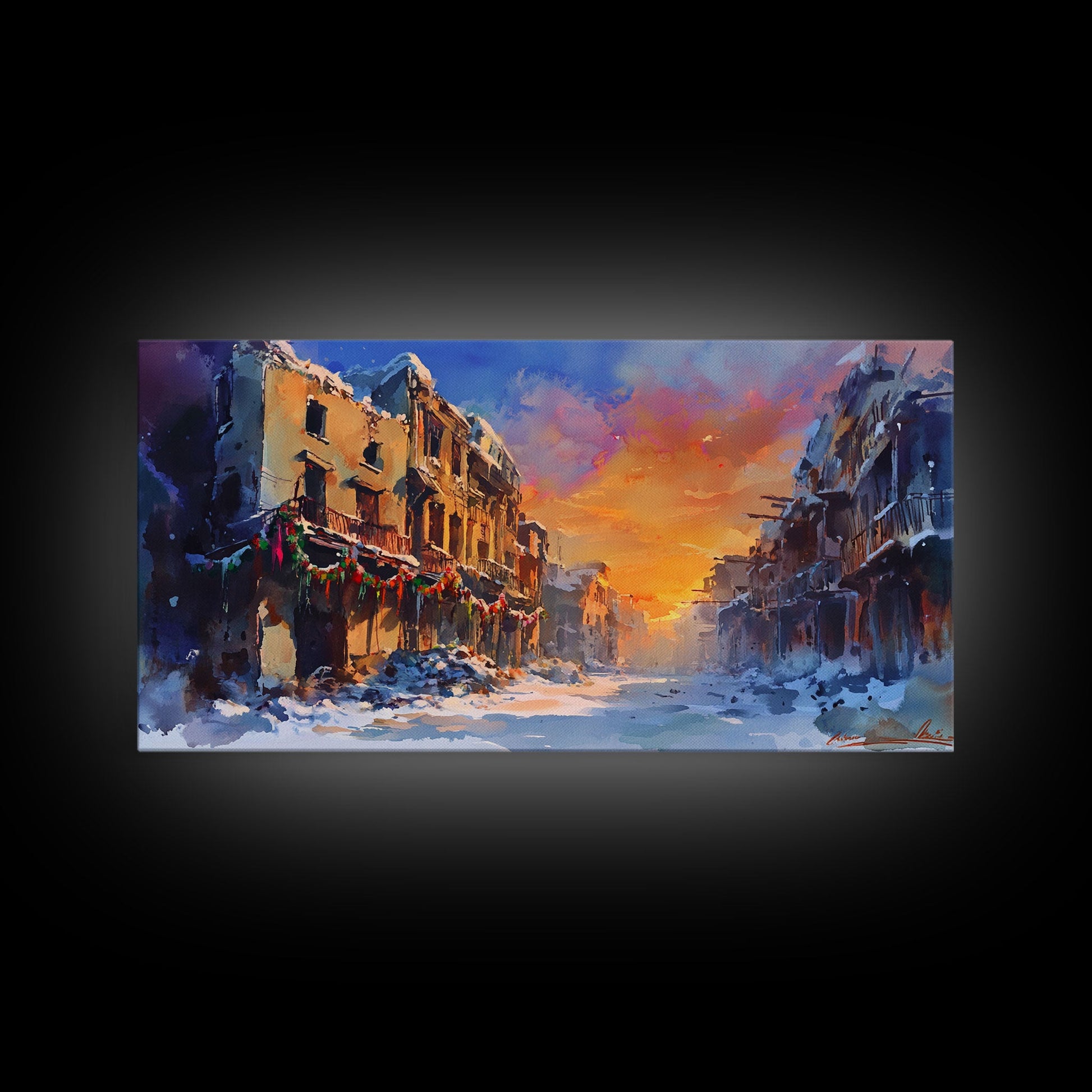 Snowy abandoned street at sunset with festive garland, framed canvas print, moody landscape Christmas or holiday decor