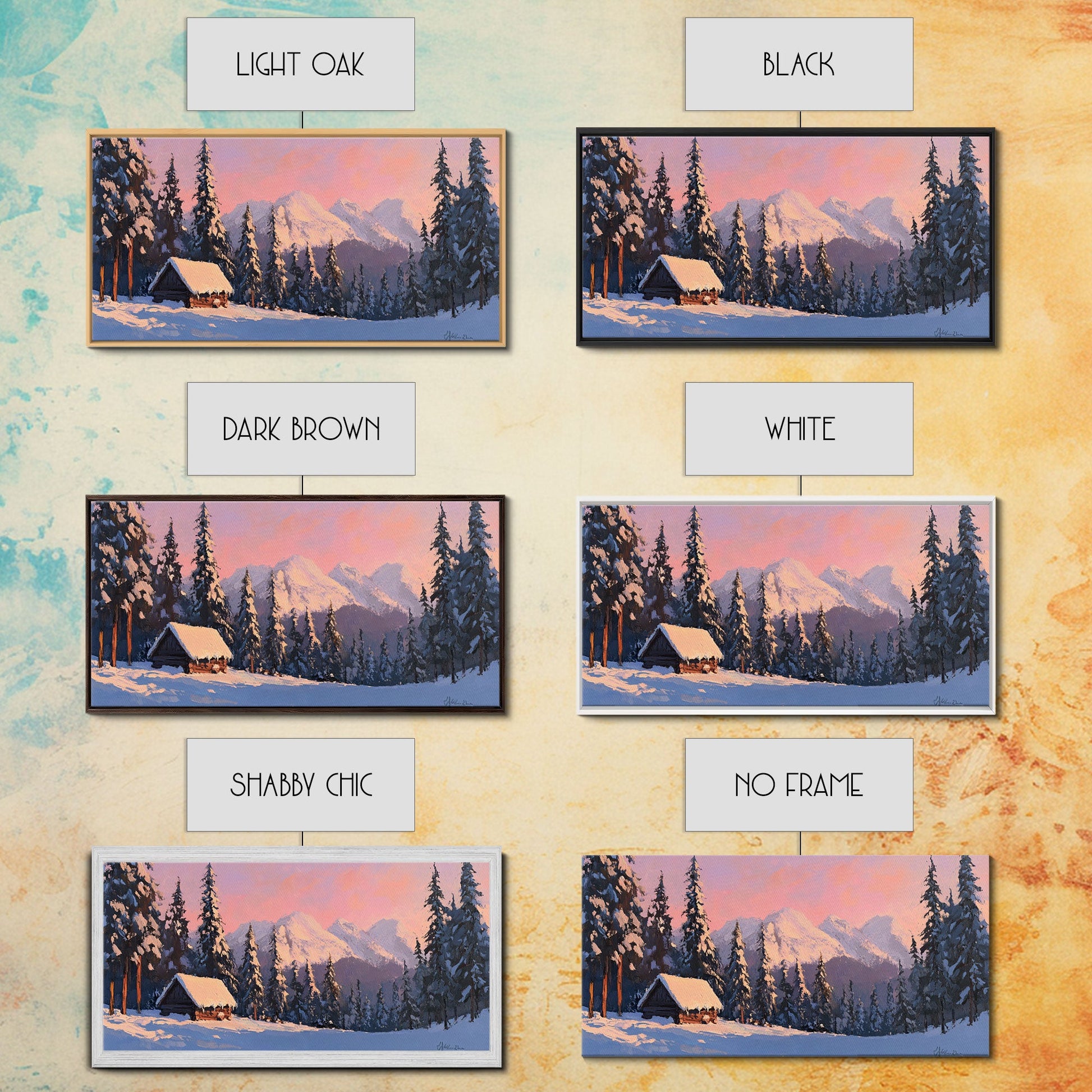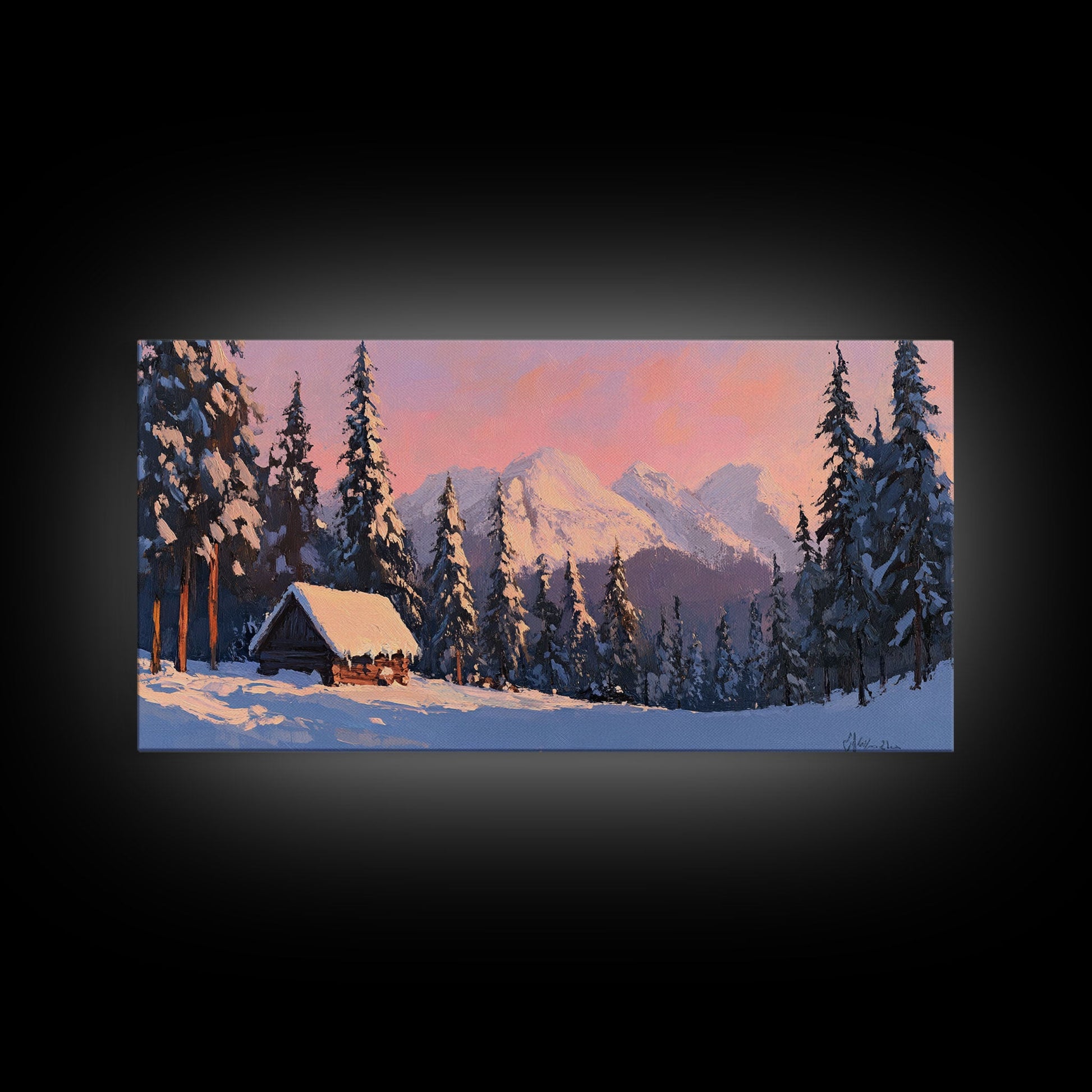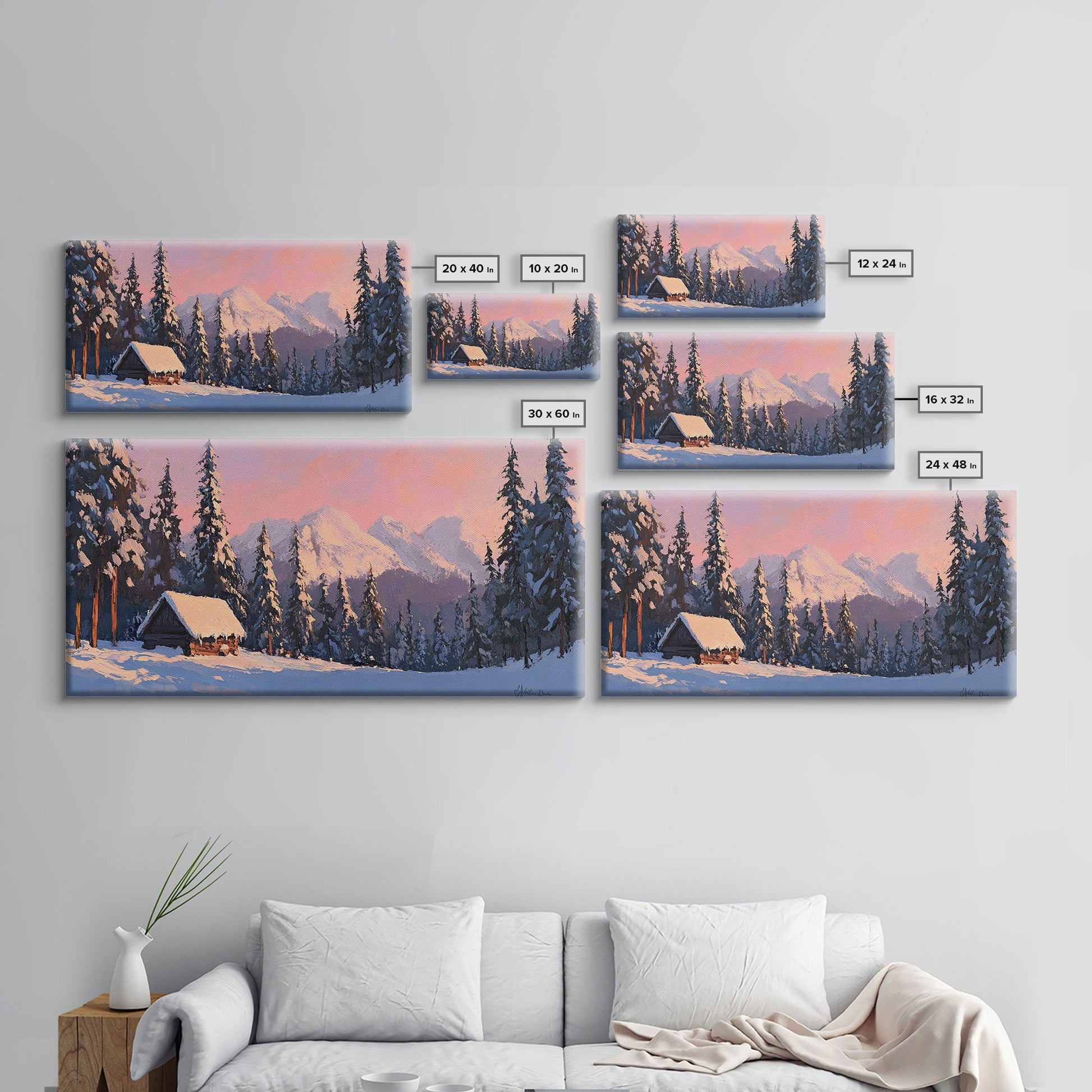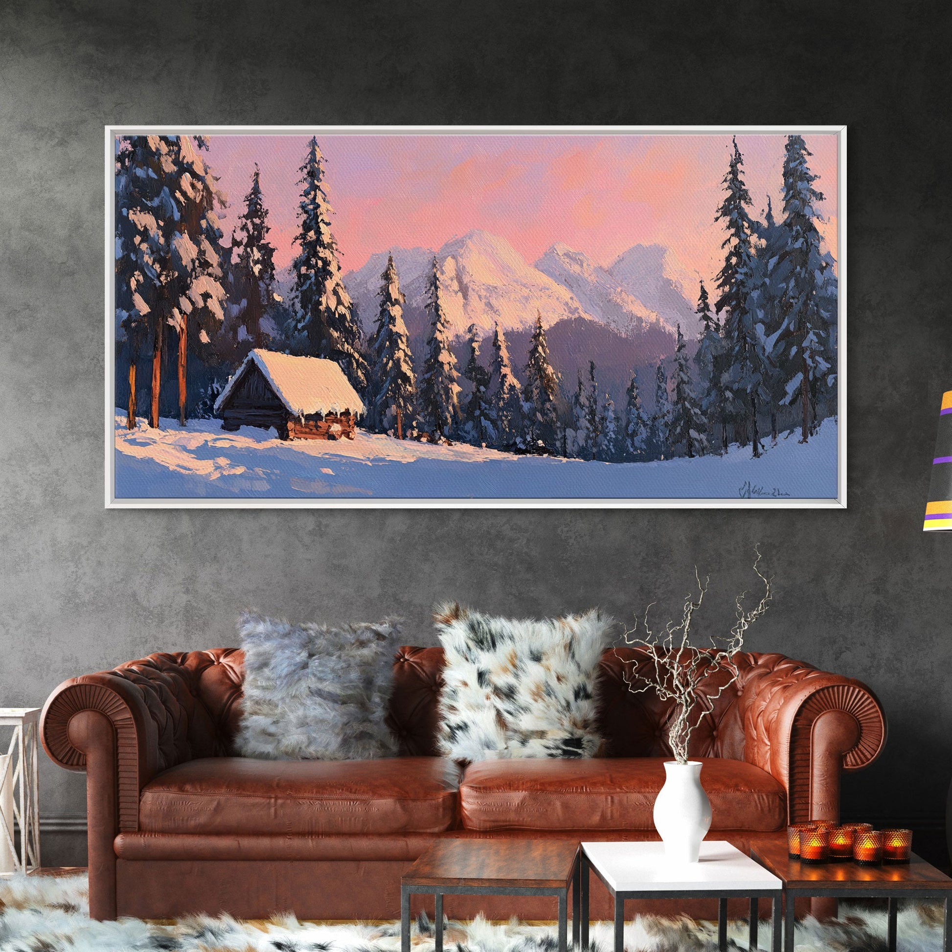 Snowy Mountain Cabin Tall Art Framed Canvas Print Cozy Winter Cabin Nestled In Snowy Forest With Majestic Mountain Landscape