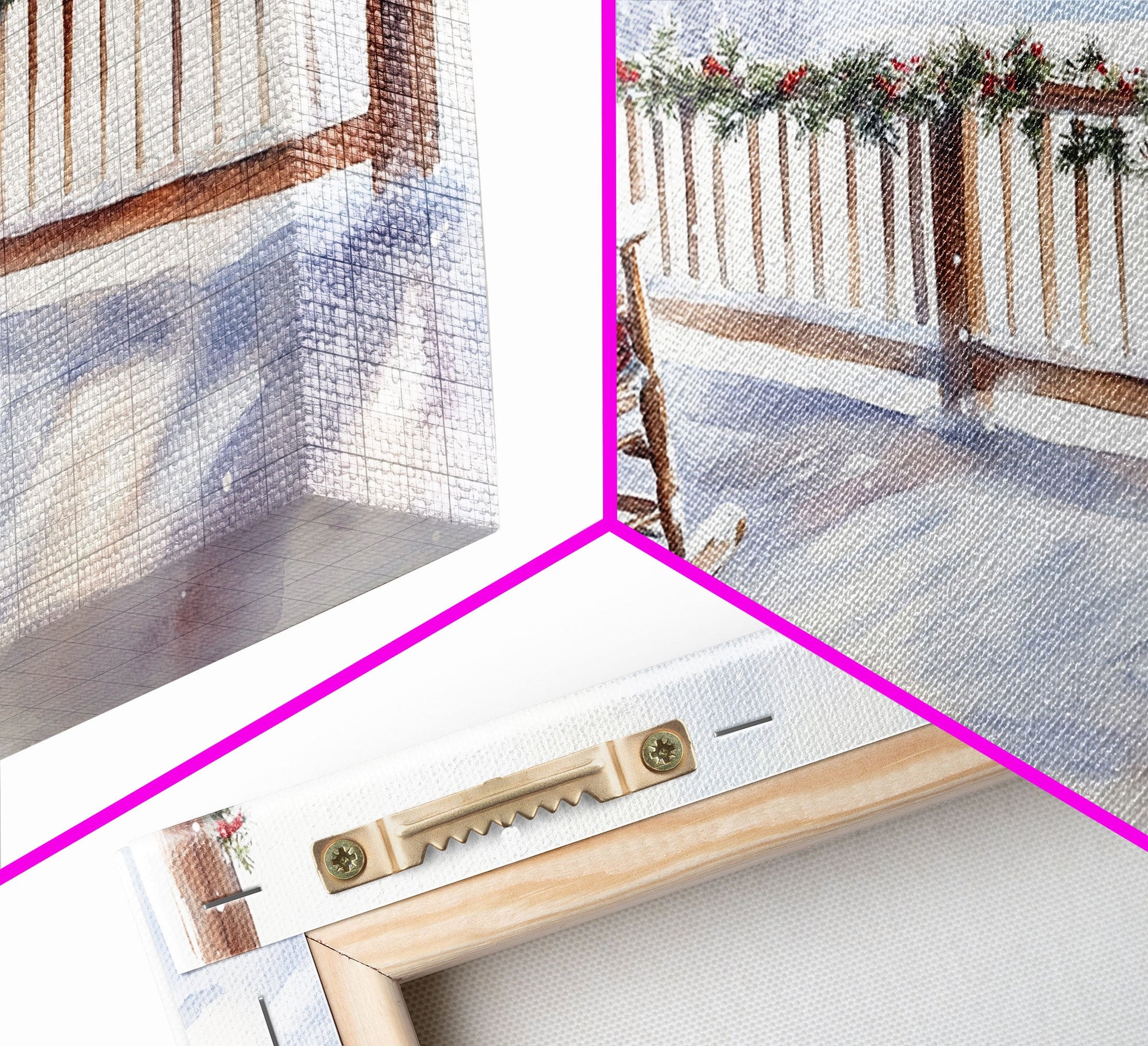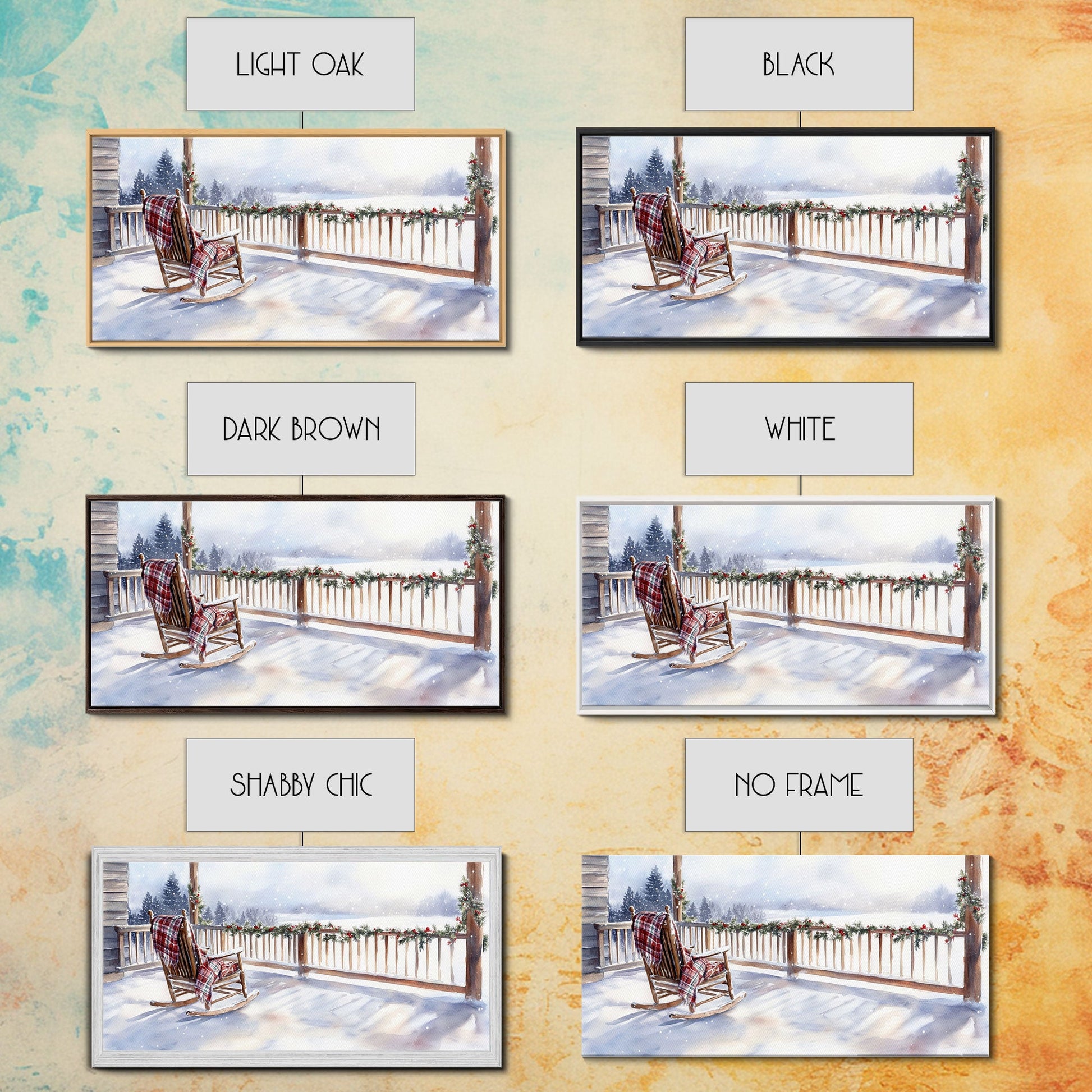 Snowy porch with rocking chair and plaid blanket, framed canvas print, Christmas decor perfect rustic holiday winter wall art