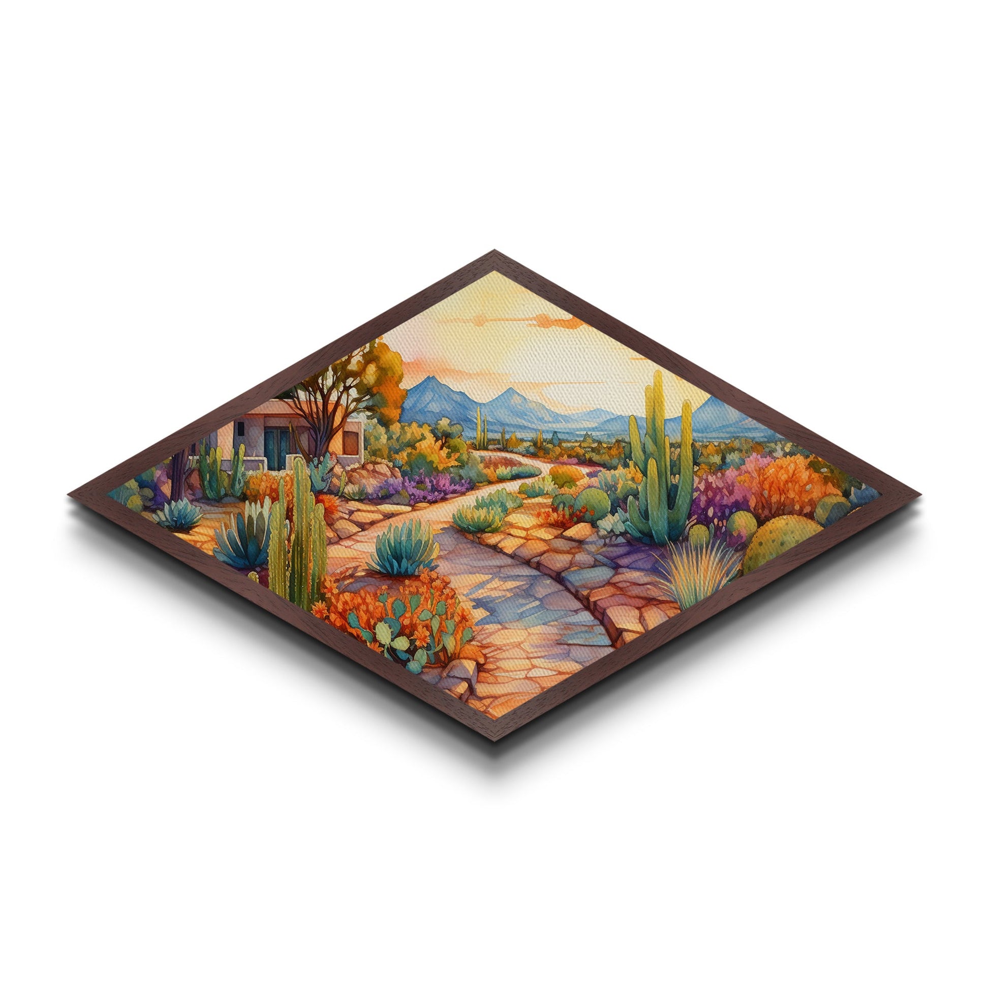 Southwest Garden Retreat Diamond Shaped Canvas Art Print desert botanical cacti and succulents colorful landscape art decor accent