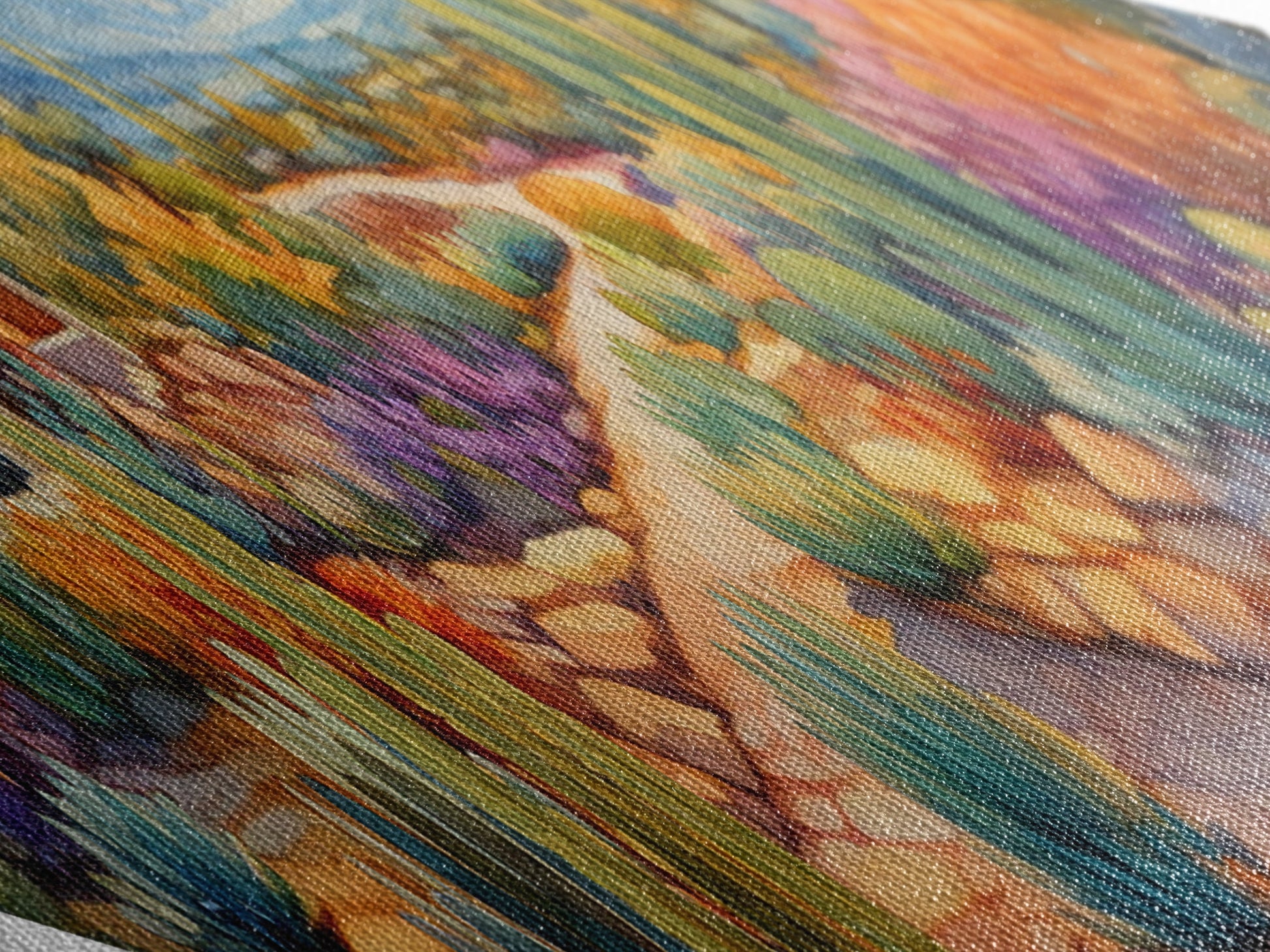 Most of our canvases are made in the USA, with the exception of canvases ordered with the light oak unstained frames, and any large canvases (24x48, 30x60, 16x48 and 20x60) ordered WITH a frame. These are temporarily made in and shipped from Europe, while we try to find a more consistent supplier in the USA.
