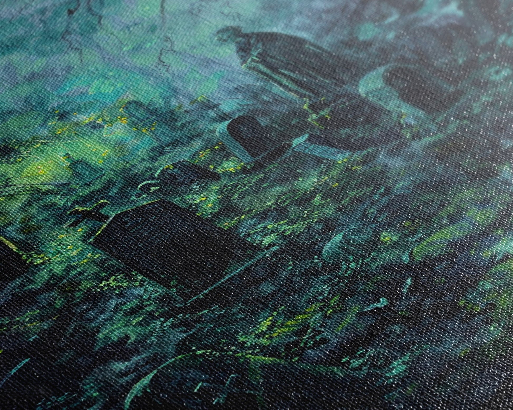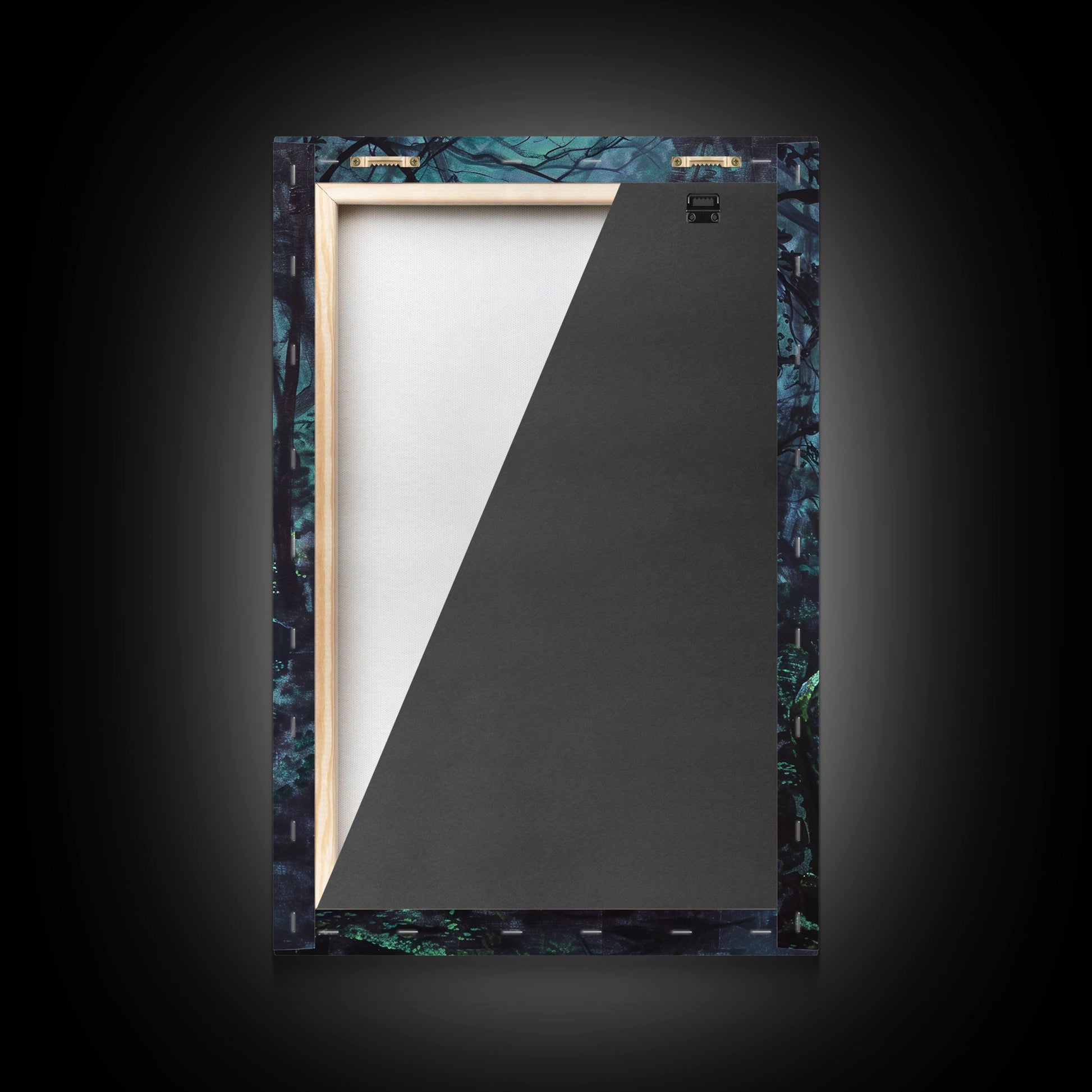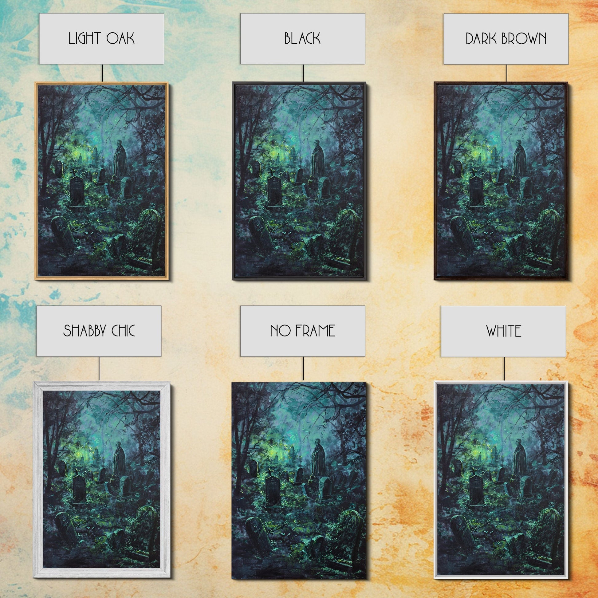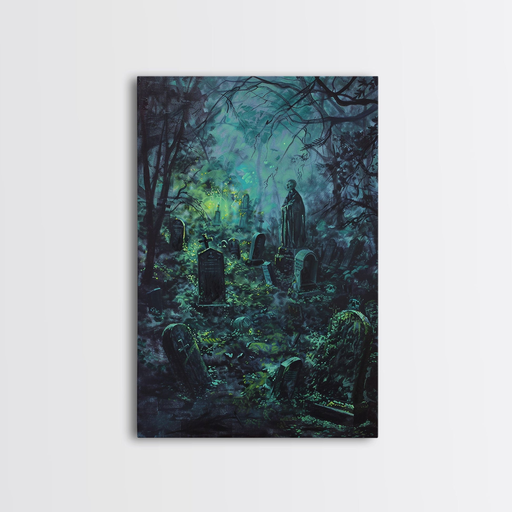 Spooky Cemetery with Glowing Lights Framed Canvas Print, Wall Art, Halloween Graveyard Art, Eerie Home Decor, Haunted Forest Painting