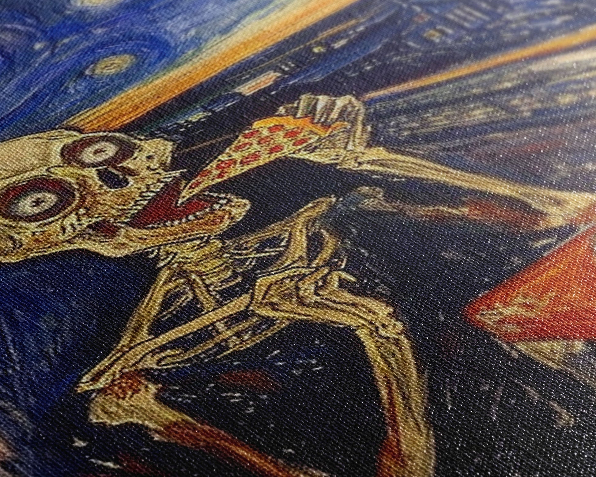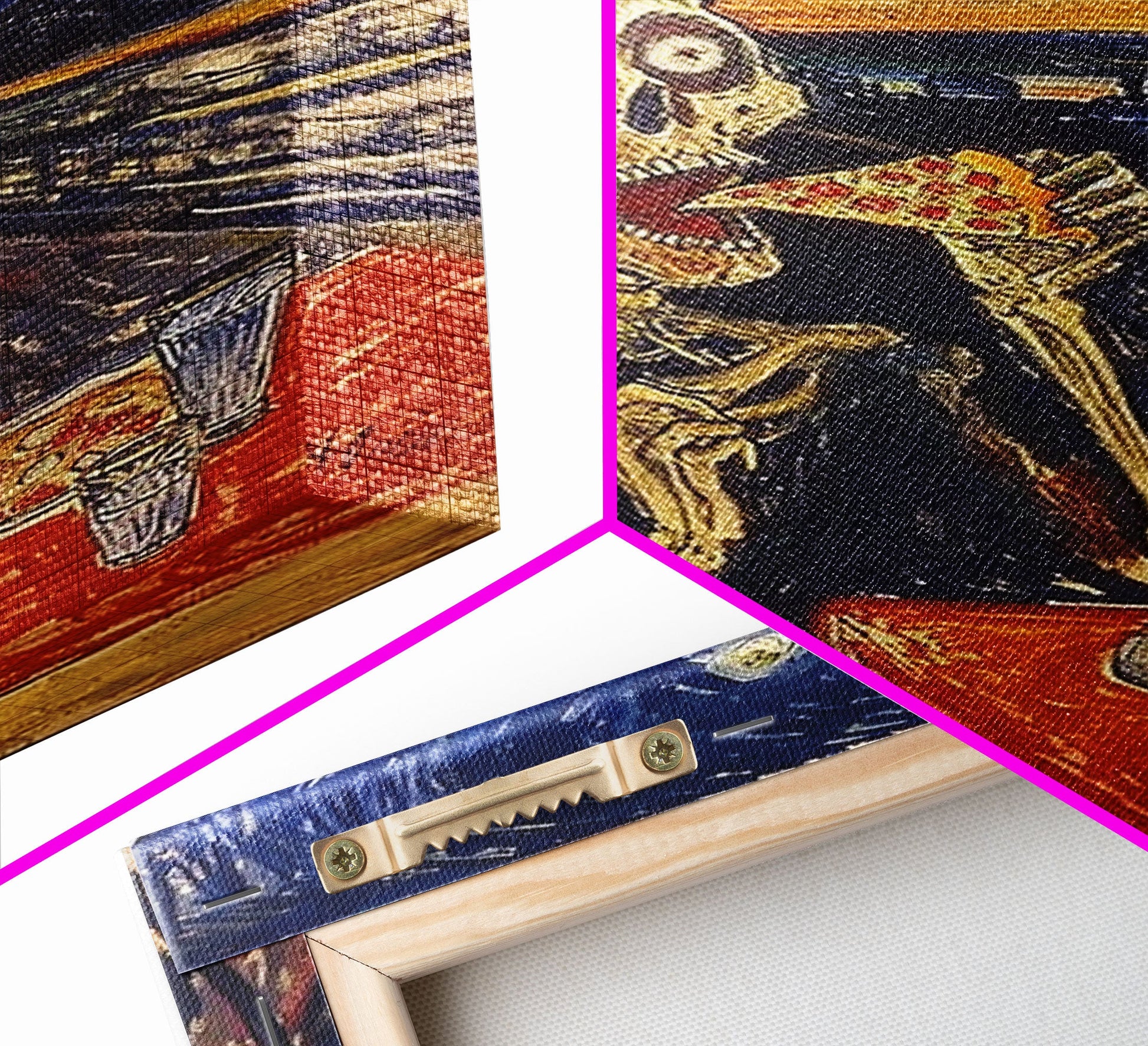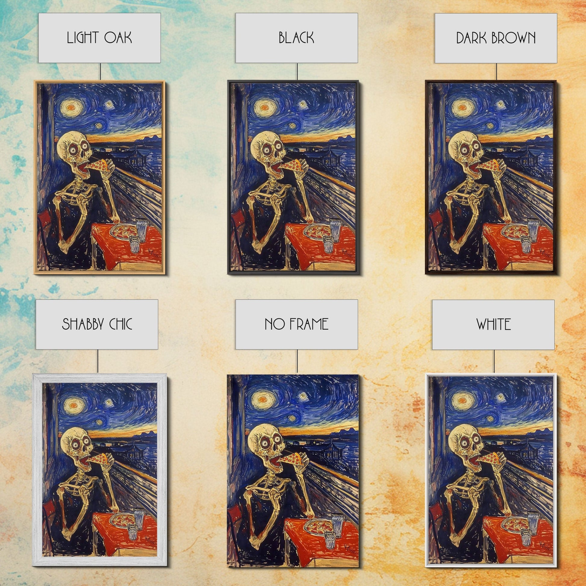 Spooky Skeleton Dude Eatin' a Pizza, Starry Night Inspired Funny Halloween Art, Framed Canvas Print