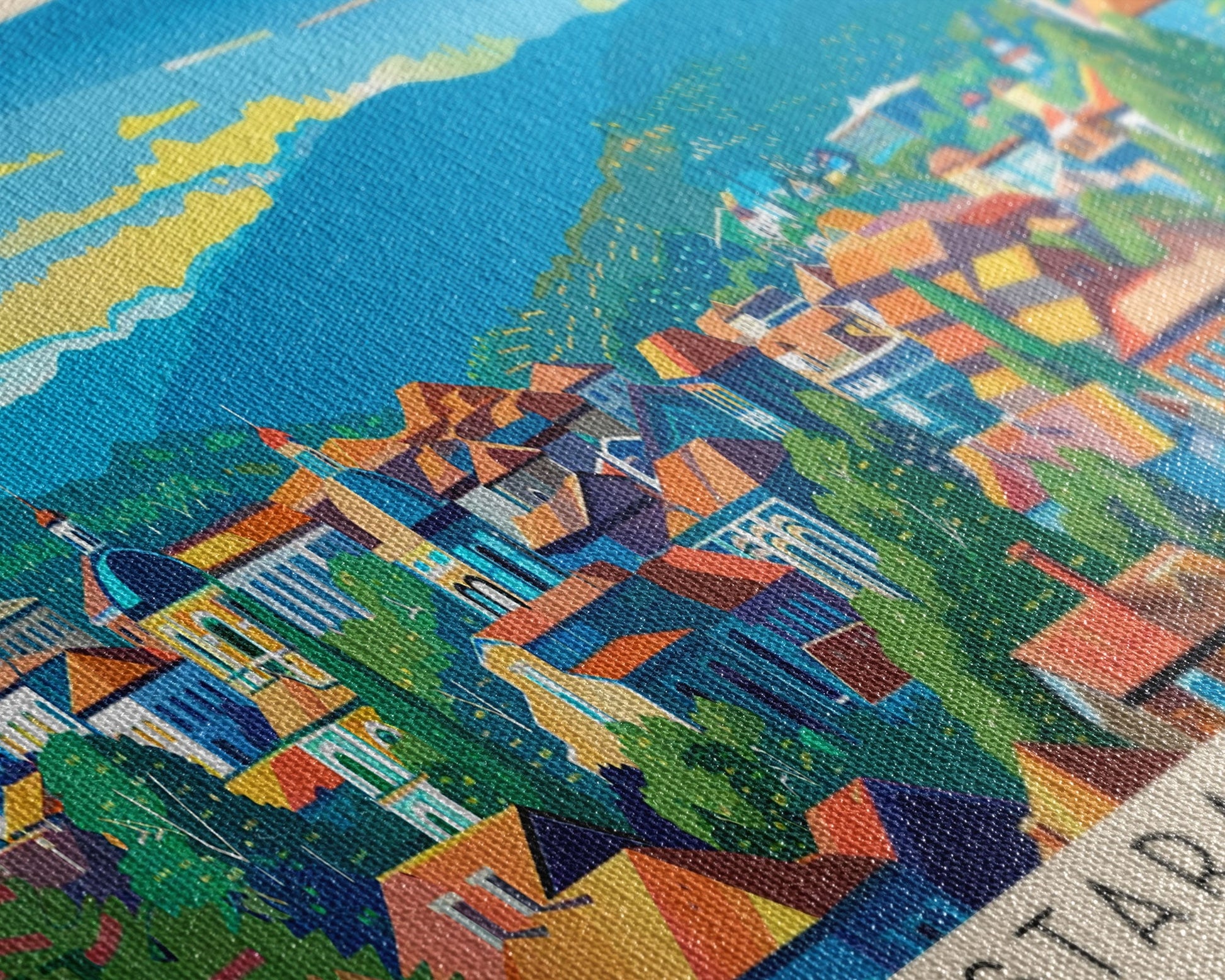 Most of our canvases are made in the USA, with the exception of canvases ordered with the light oak unstained frames, and any large canvases (24x48, 30x60, 16x48 and 20x60) ordered WITH a frame. These are temporarily made in and shipped from Europe, while we try to find a more consistent supplier in the USA.
