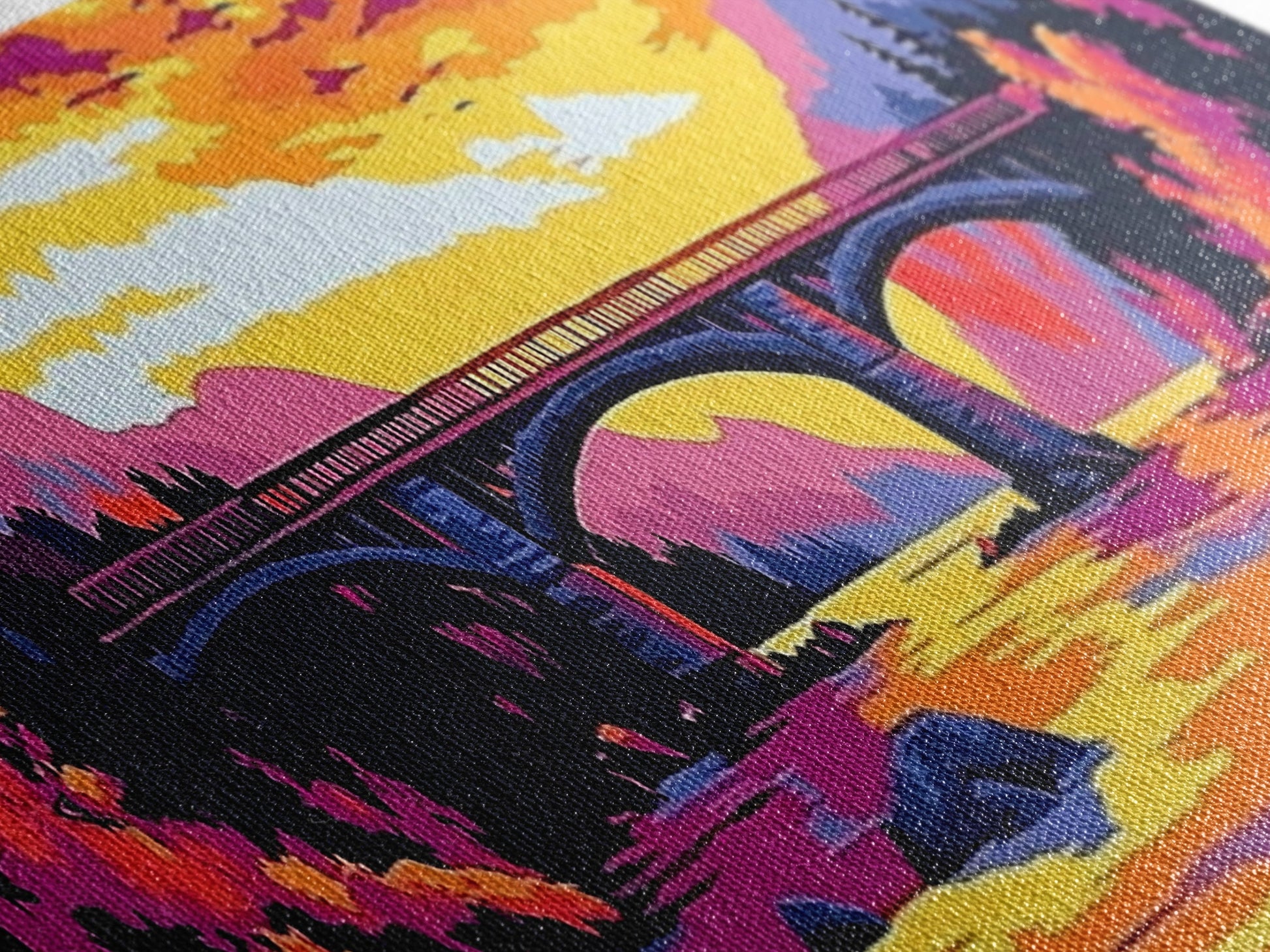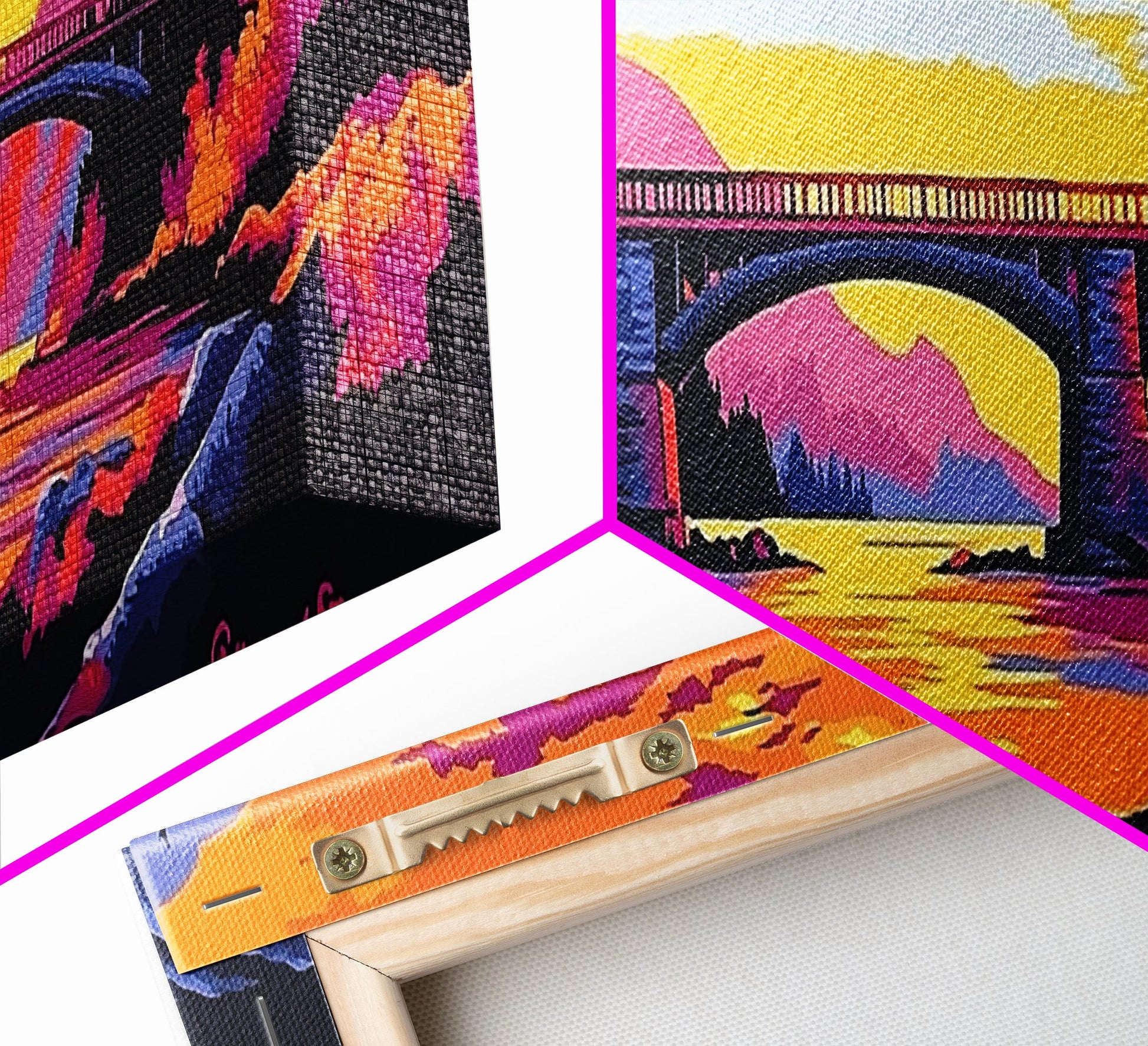 Stone Bridge, River Sunset, Autumn Art, Nature Scene, Living Room Wall Art, Colorful Home Decor, Canvas Print, Modern Landscape