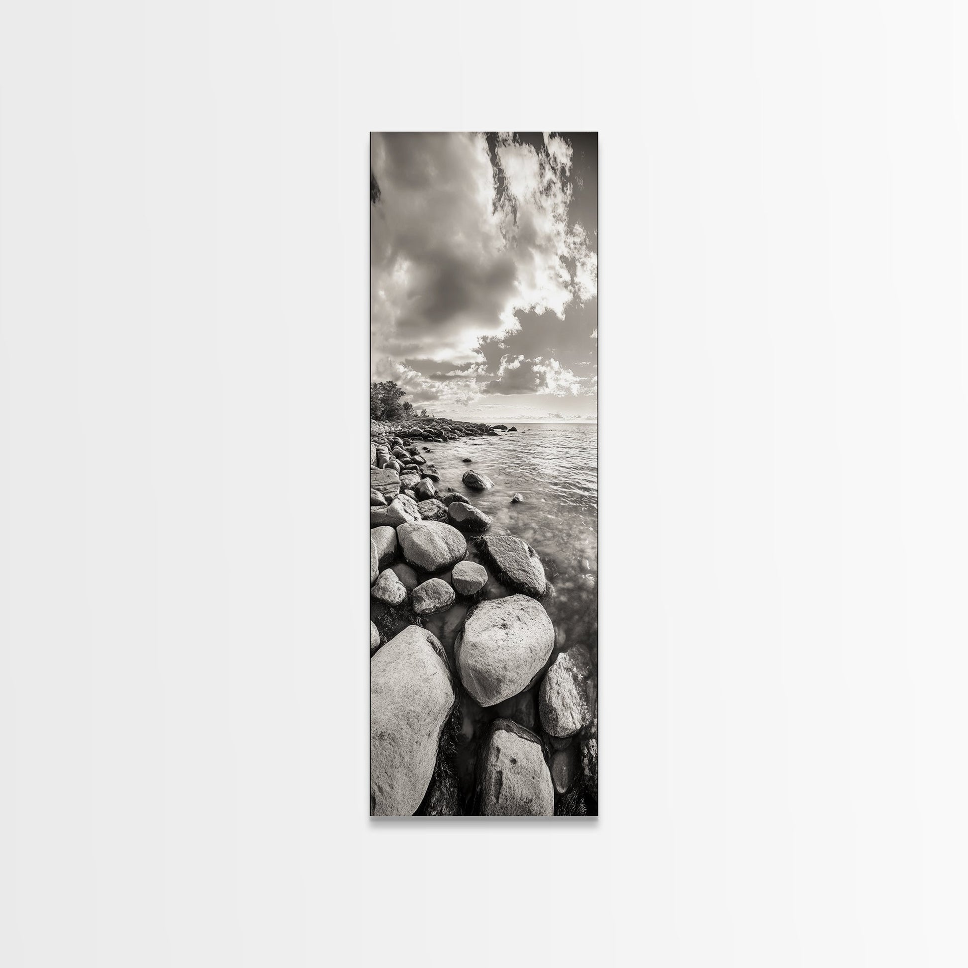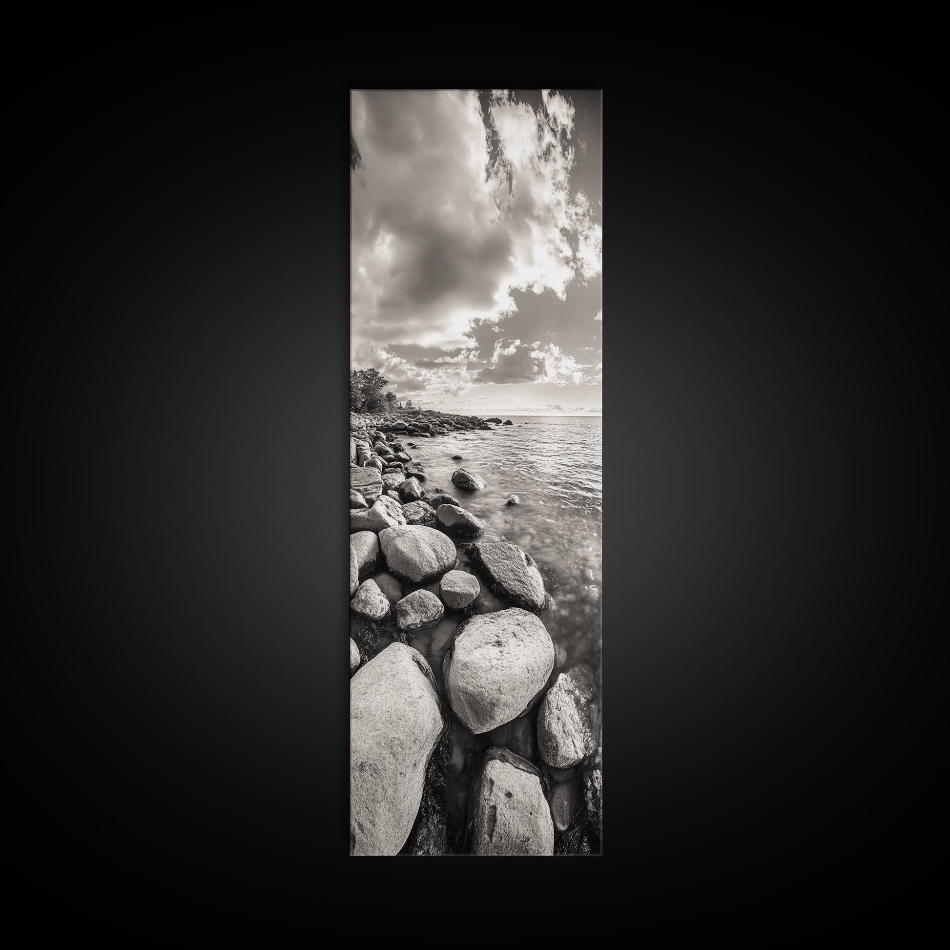 Sunrise Shore, Tranquil Coast, Pebble Beach, Golden Glow, Framed Canvas Print Fall Wall Art, Landscape Living Room Decor, Minimalist Aesthetic