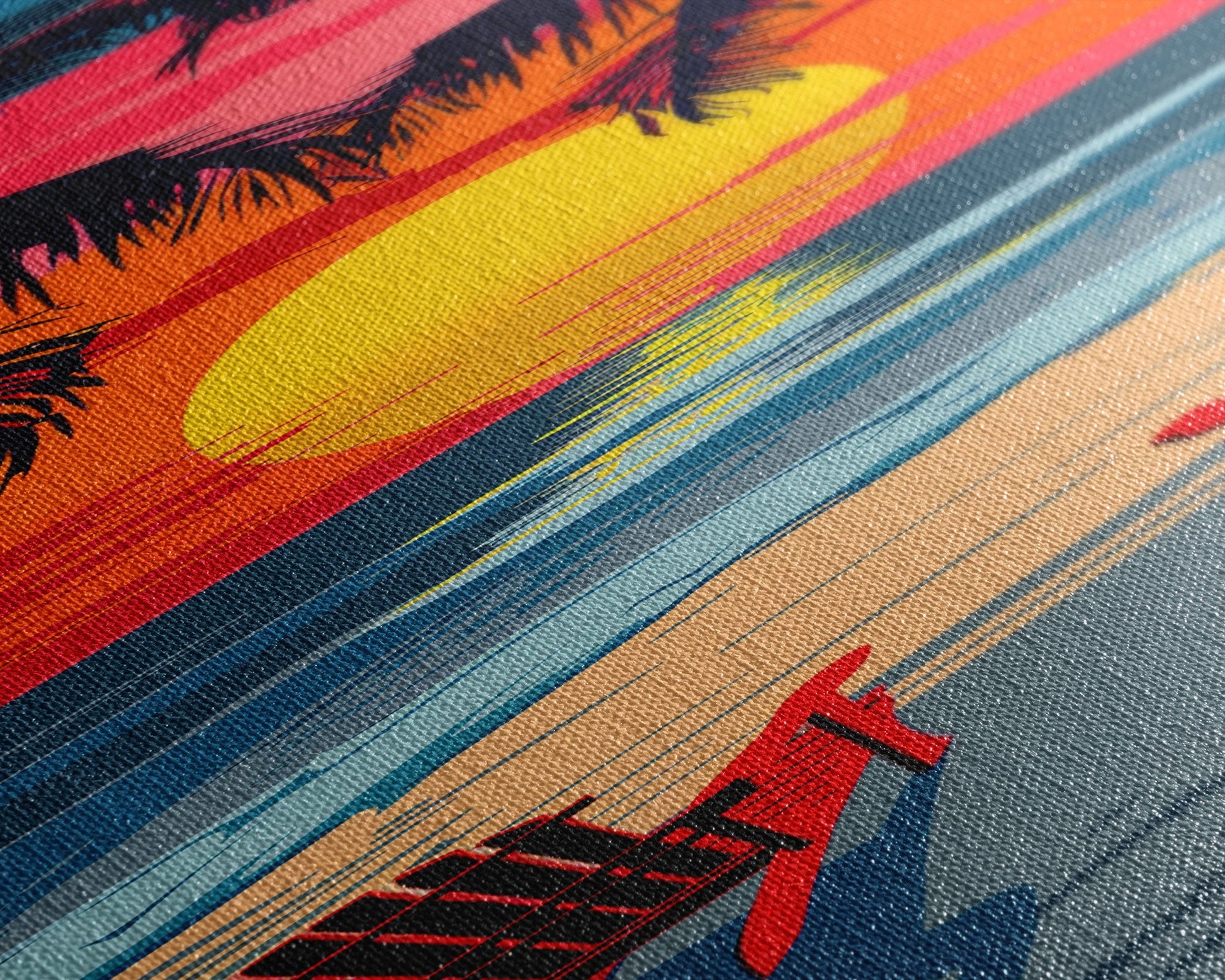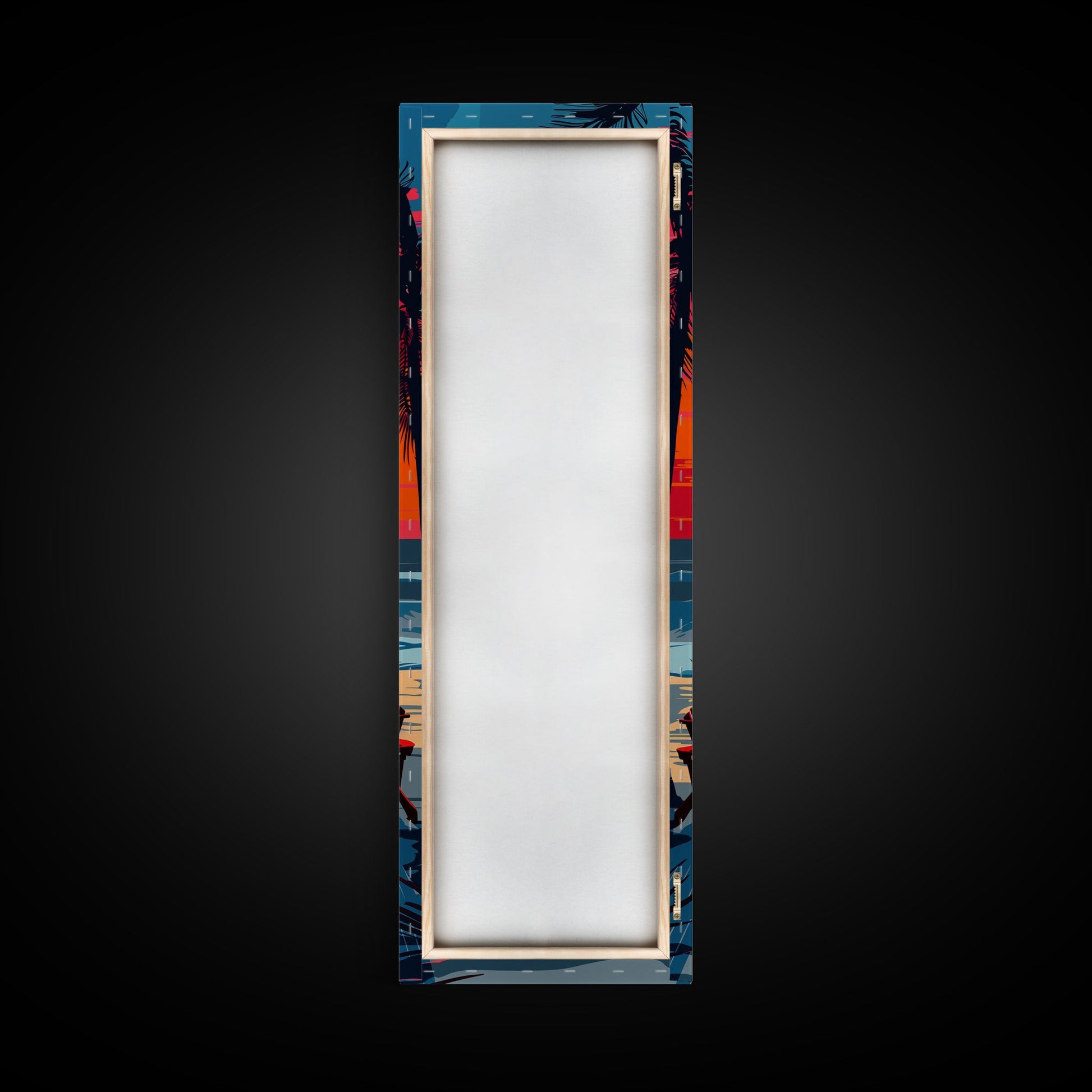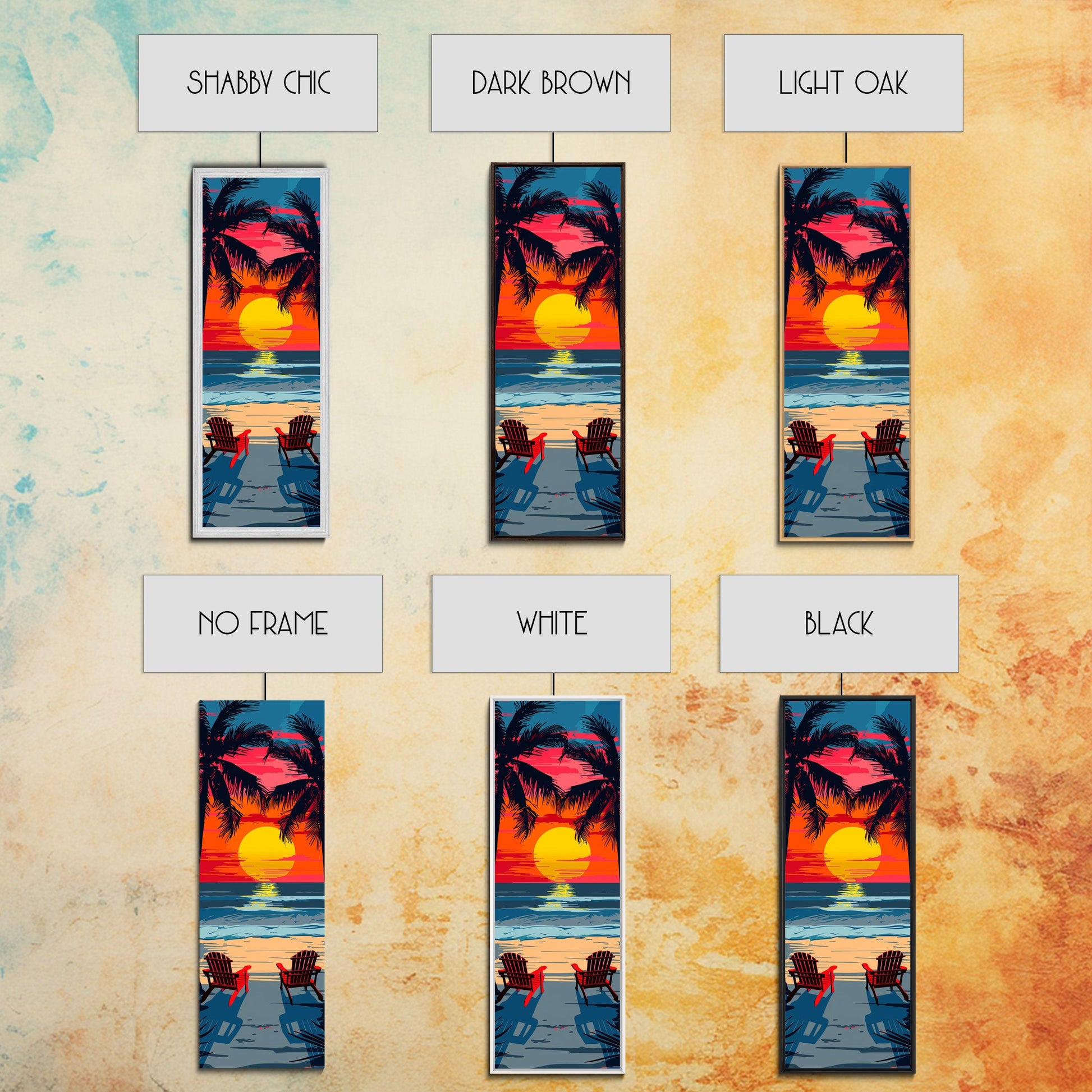 Sunset Beach Chairs Midcentury Modern Wall Art - Framed Canvas Print, Boho Art, Skinny Art, Living Room Art, Bedroom Decor, Tropical Landscape