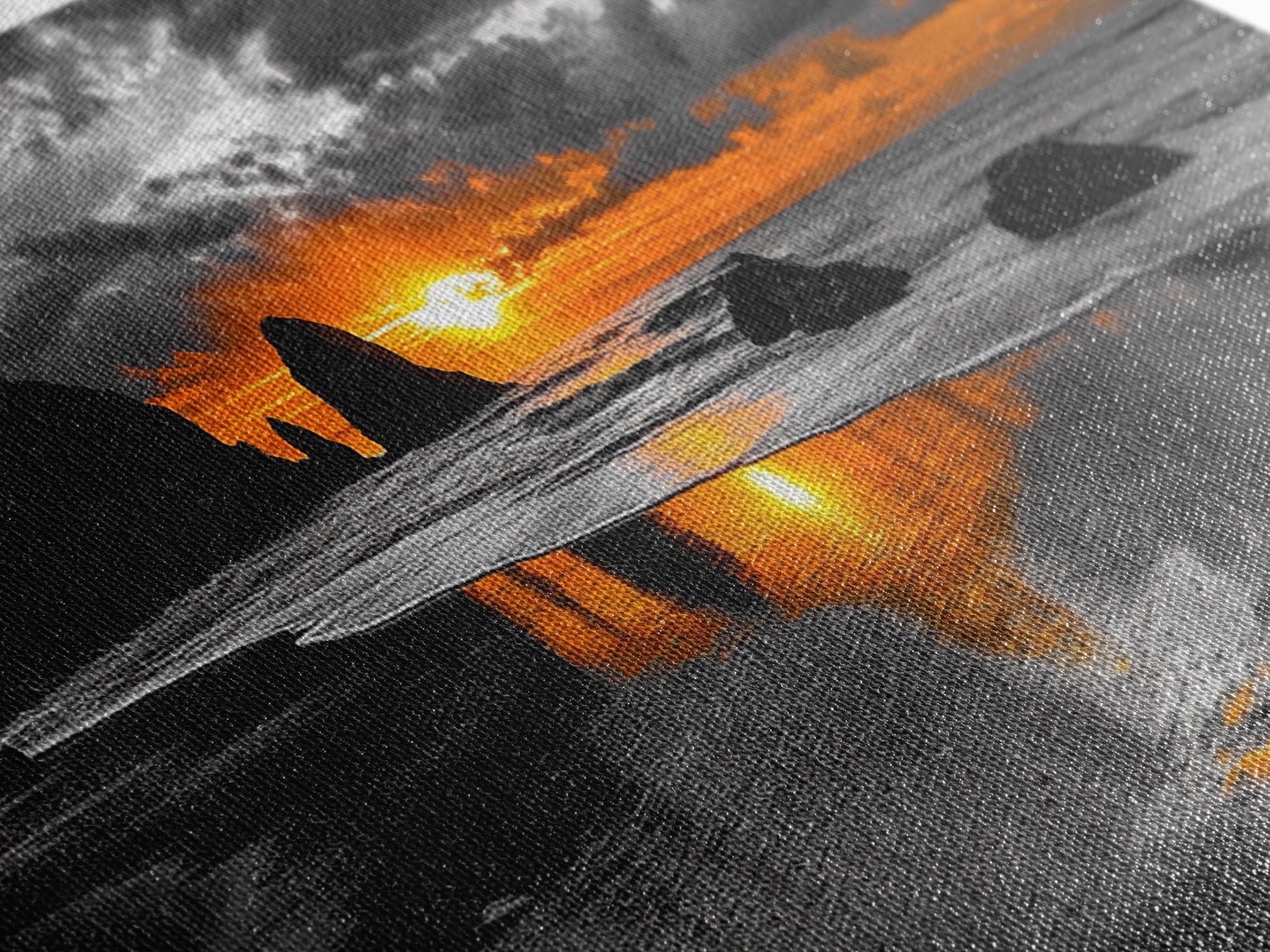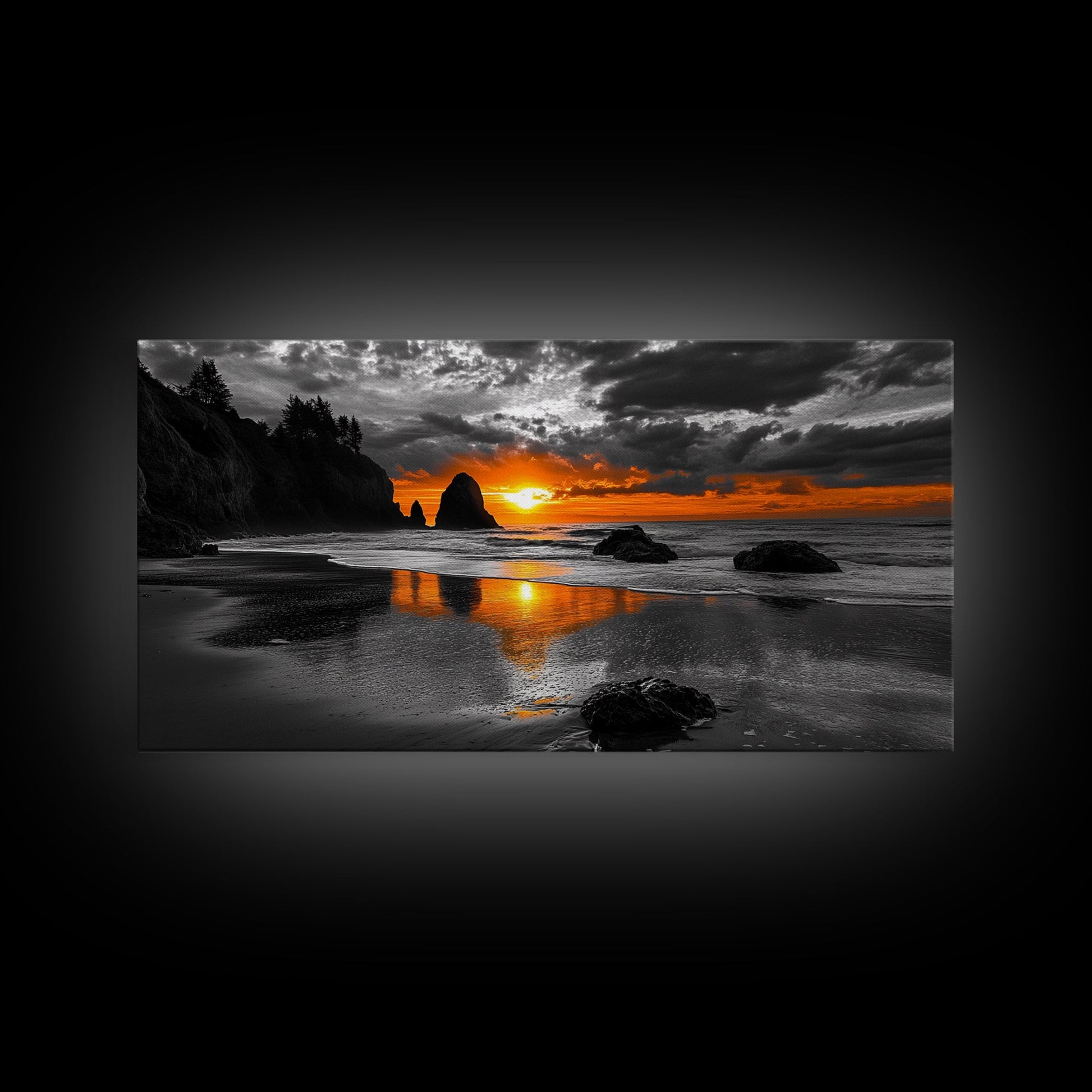 Sunset Beach, Fiery Sky, Ocean Glow, Moody Seascape, Framed Canvas Print coastal living room wall art, dramatic sunset photography