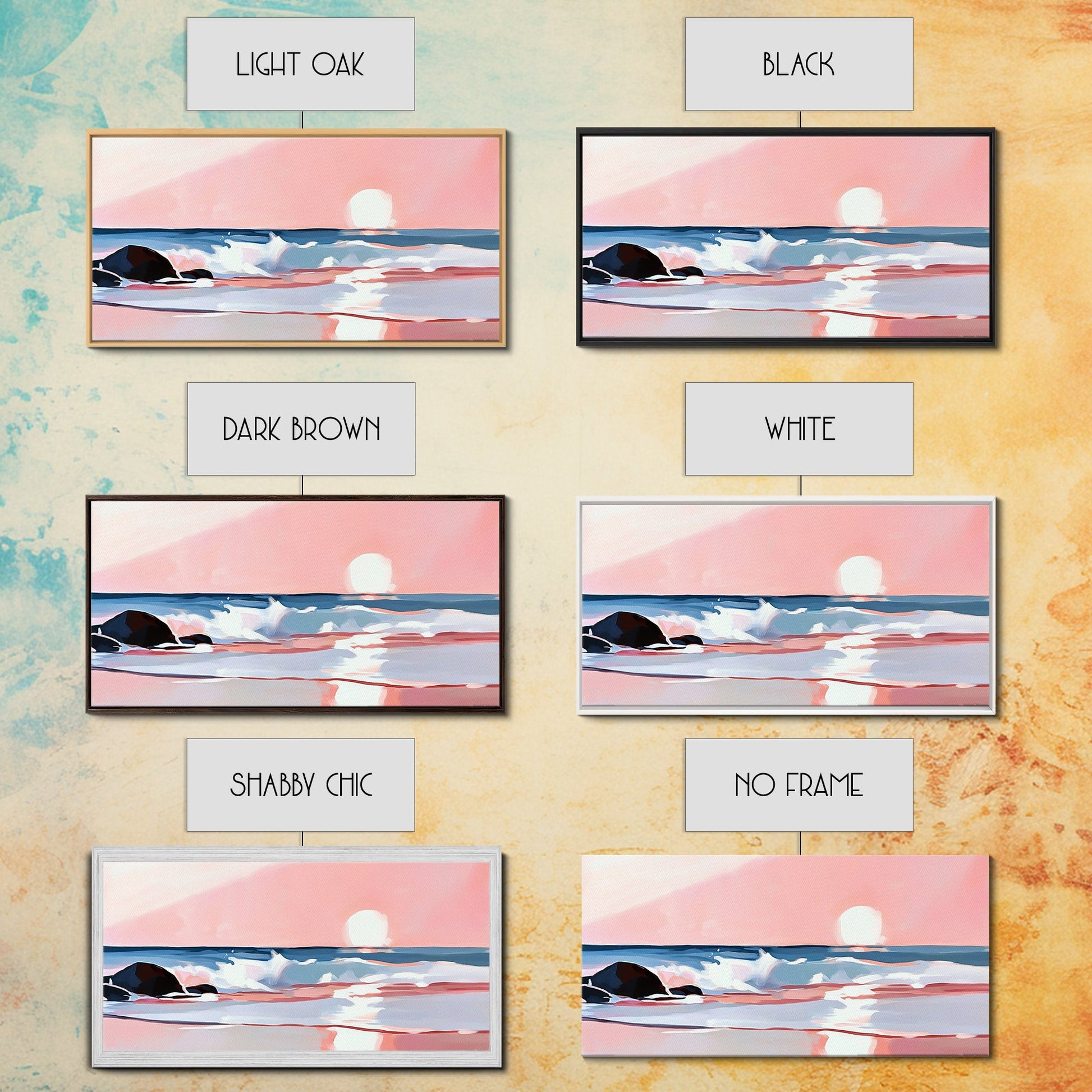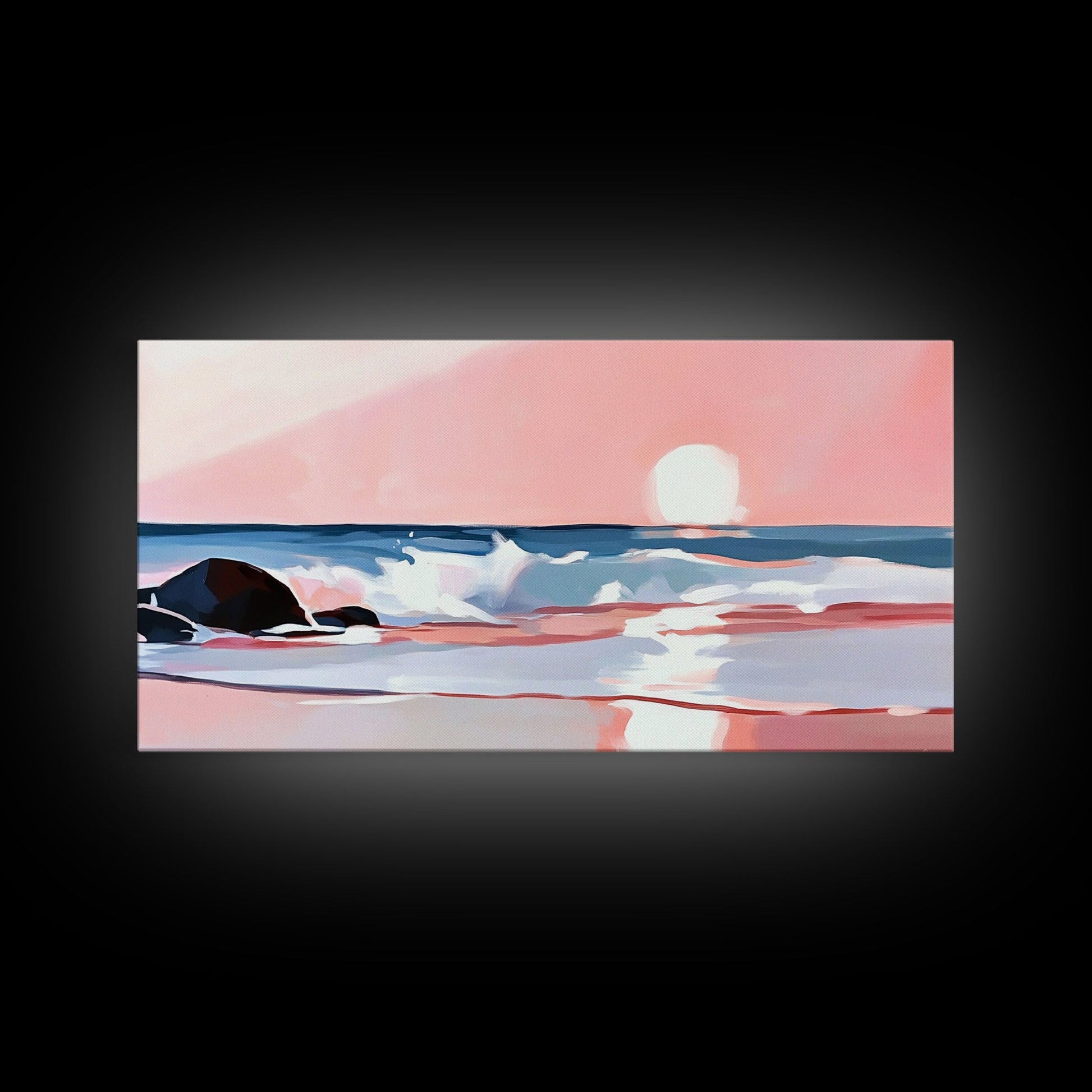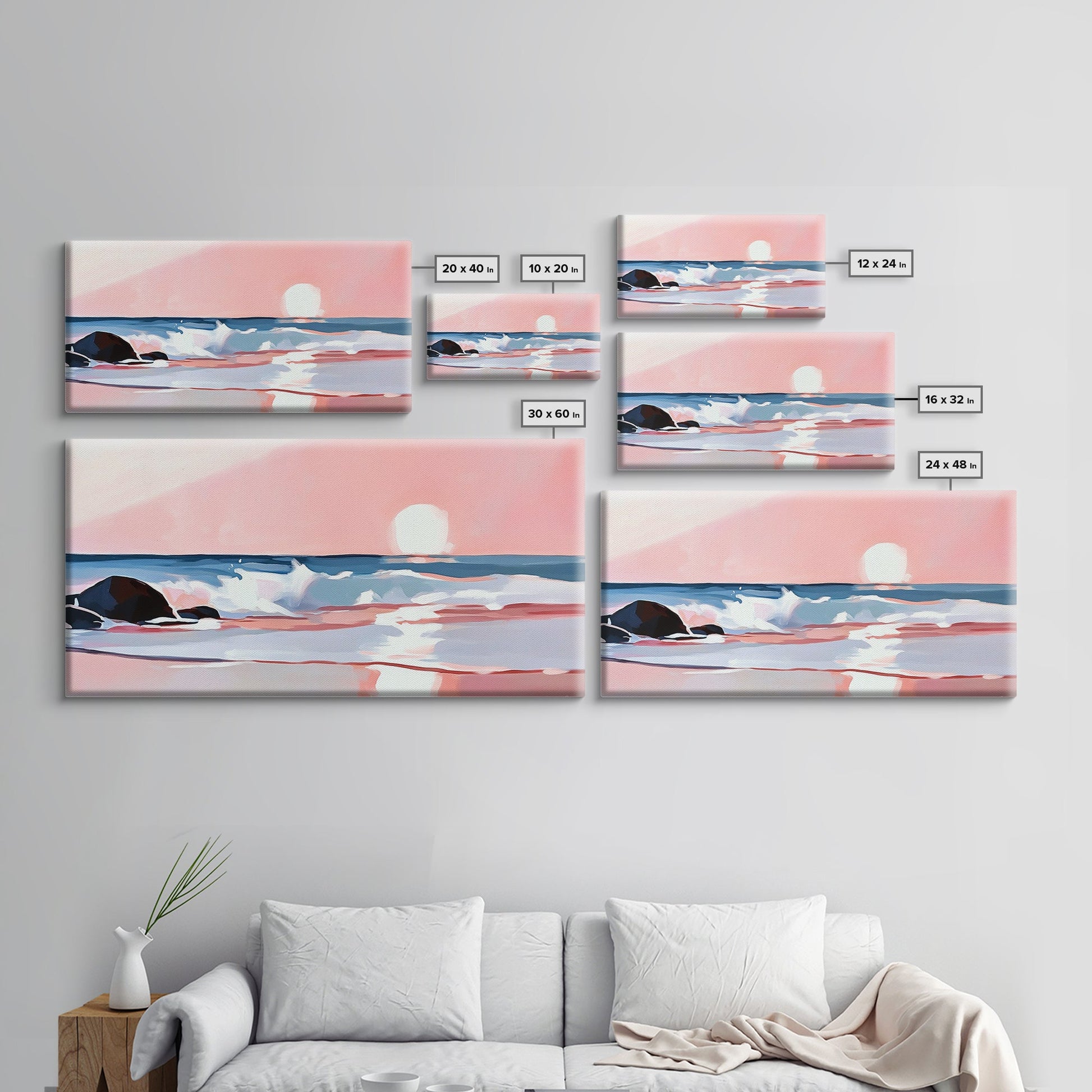 Sunset Beach, Ocean Waves, Framed Canvas Print, Coastal Wall Art, Pink Sky Painting, Living Room Decor, Tropical Seascape