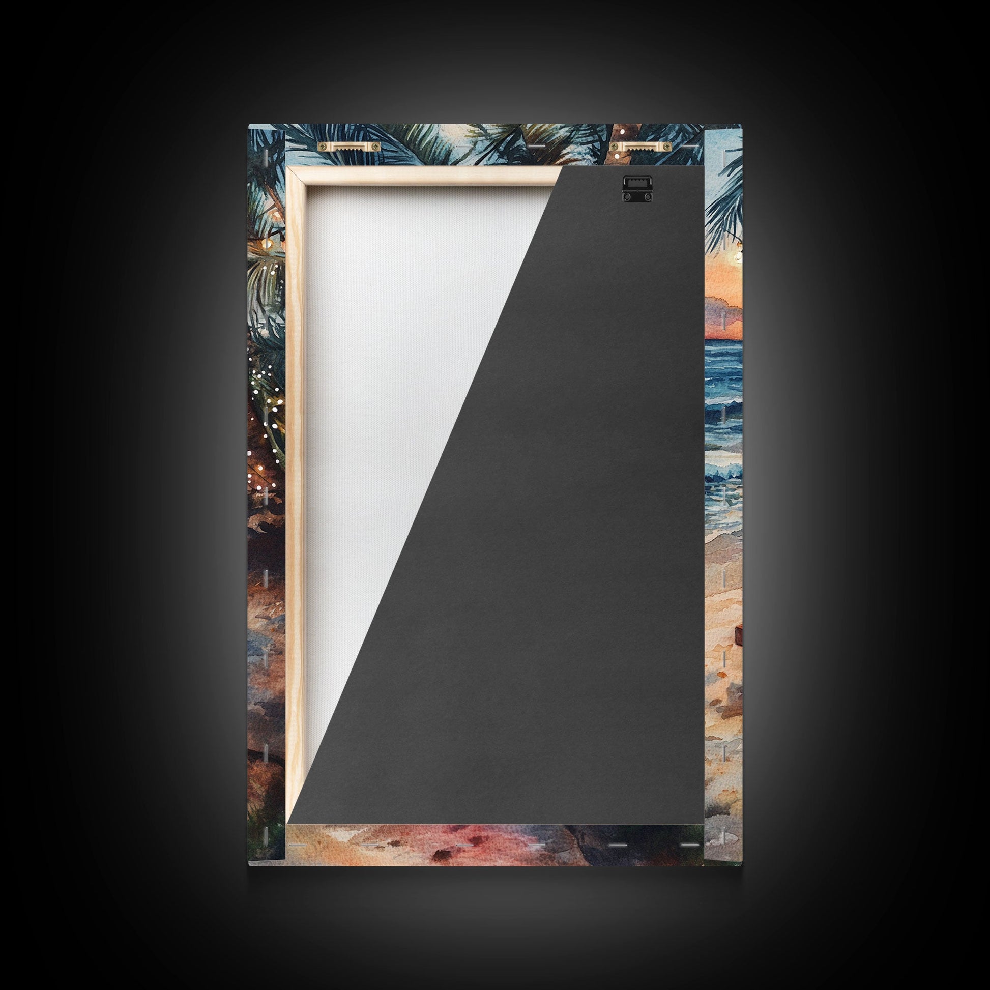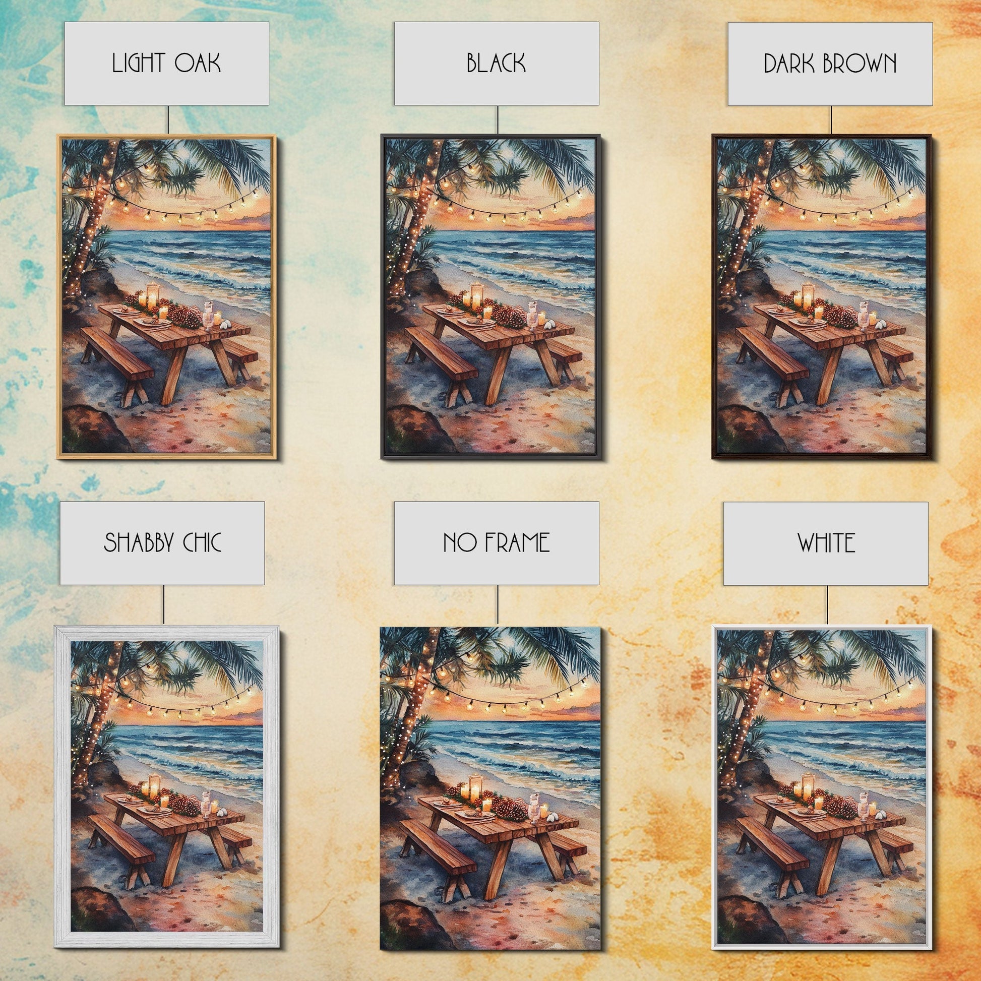 Sunset beach picnic with holiday lights and candles, coastal Christmas decor Framed Canvas Print, perfect tropical holiday art idea