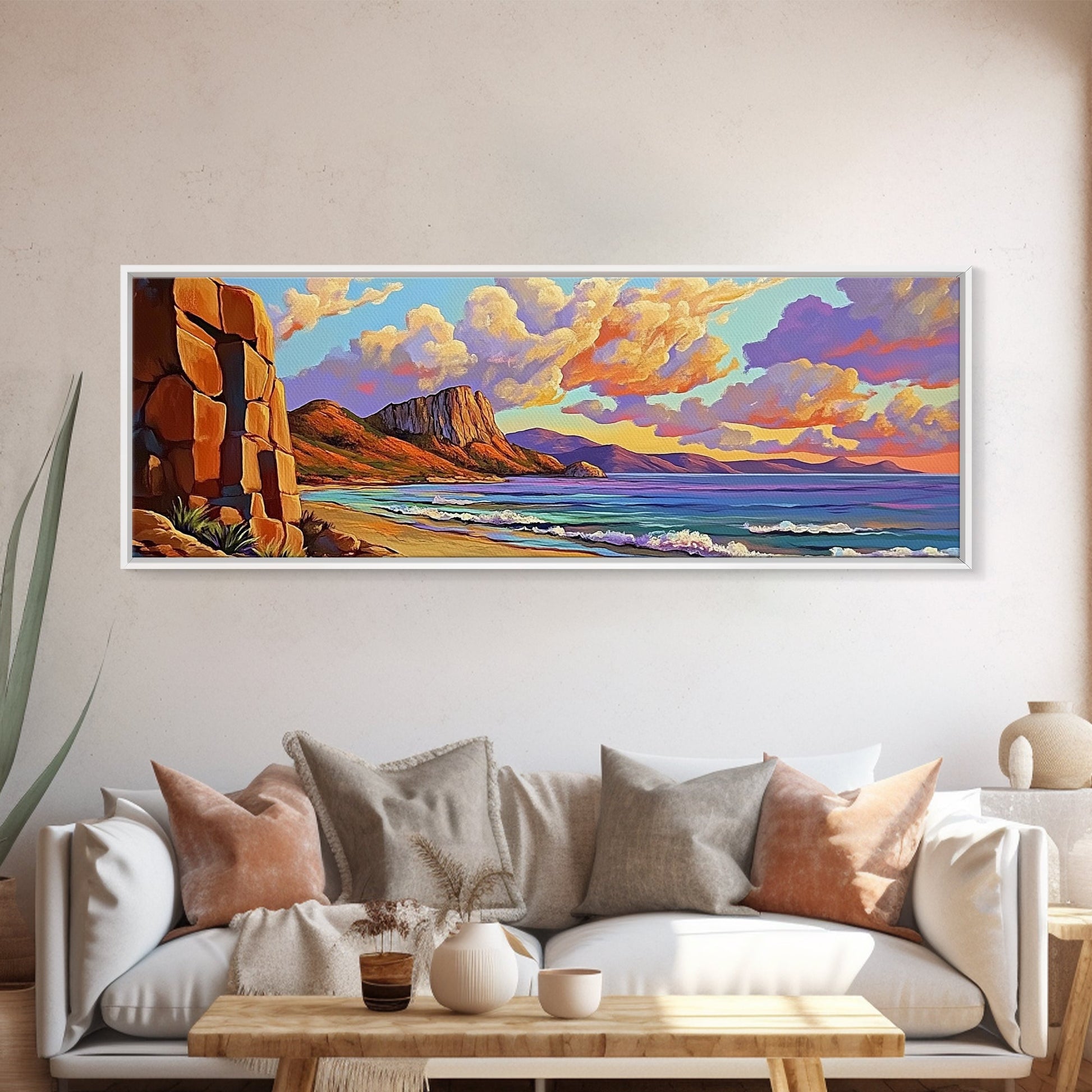 Sunset Beach View, Coastal Mountain Landscape, Peaceful Ocean Wall Art, Framed Canvas Print, Boho Bedroom or Living Room Decor