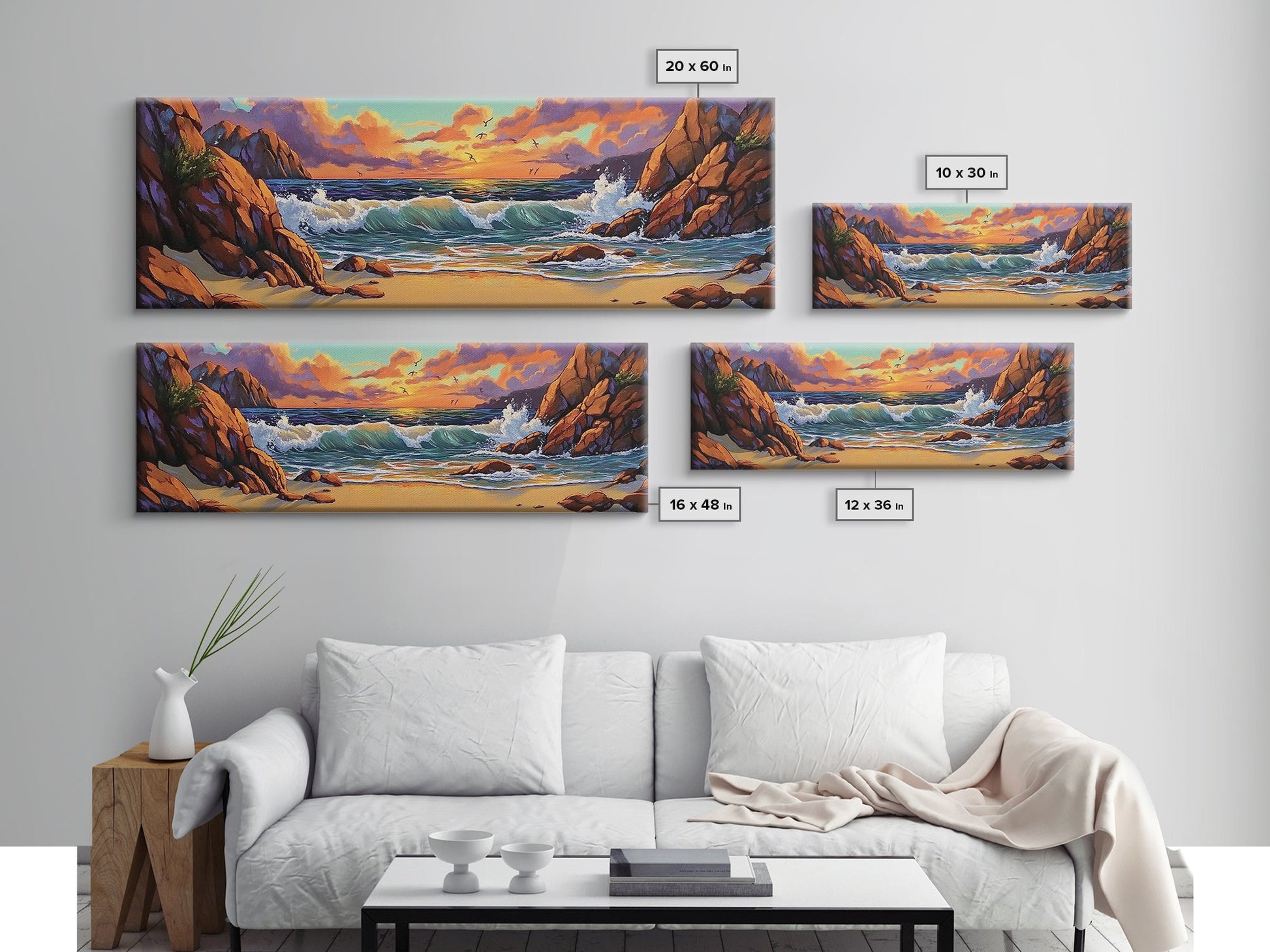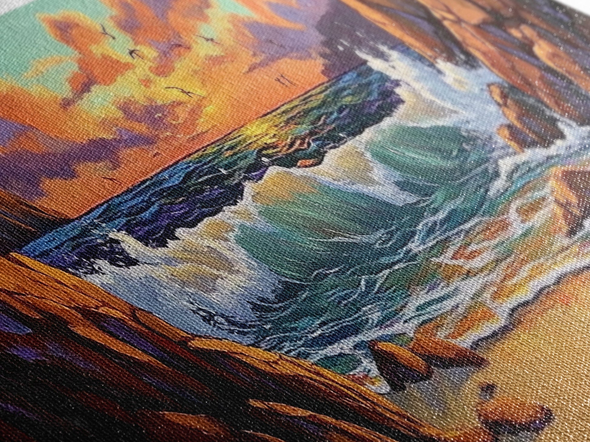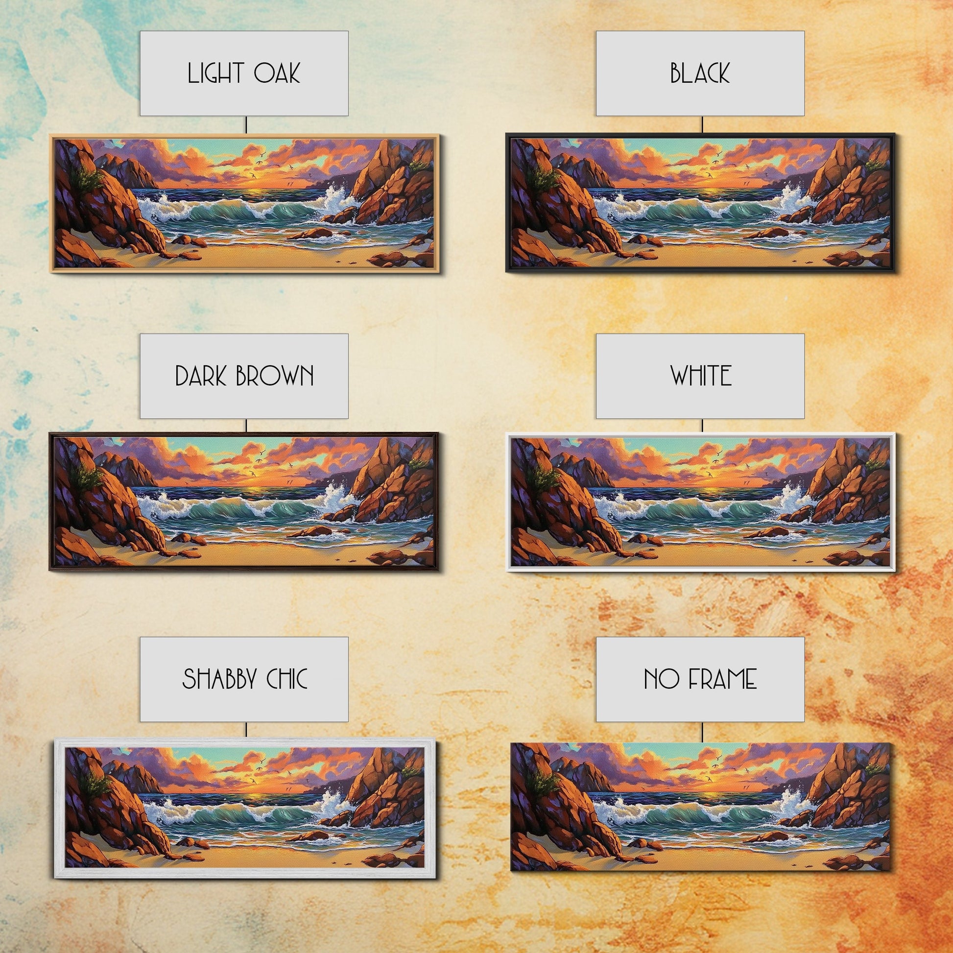 Sunset Beach Waves, Dramatic Ocean, Bold Skies, Framed Canvas Print, Entryway Wall Art, Nature Escape, Colorful Beach Scene