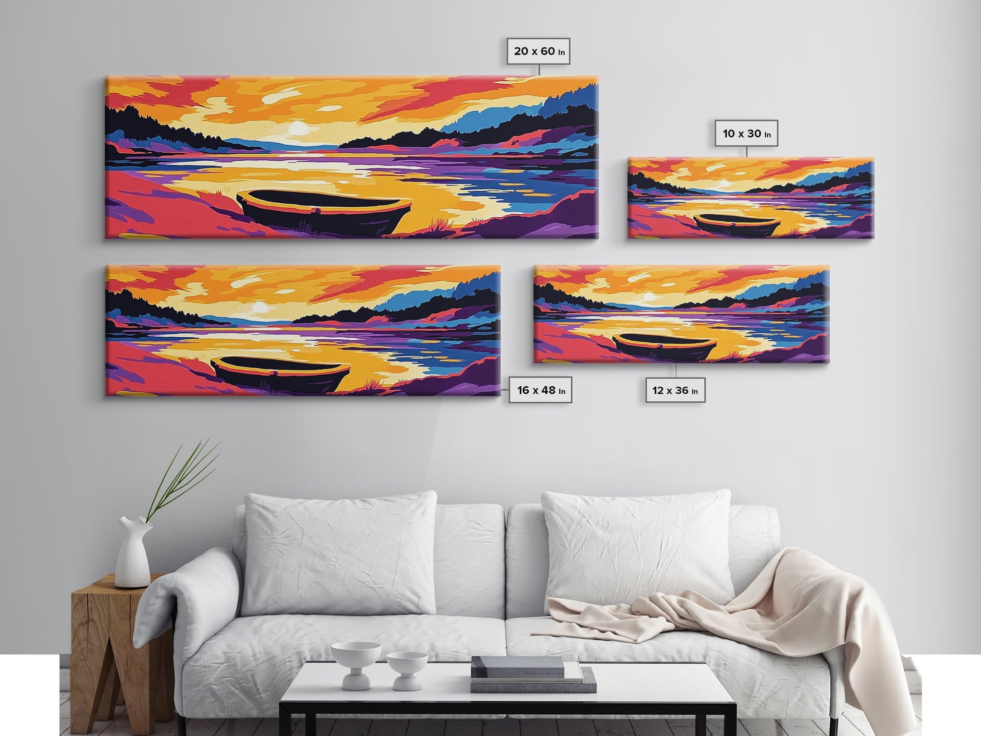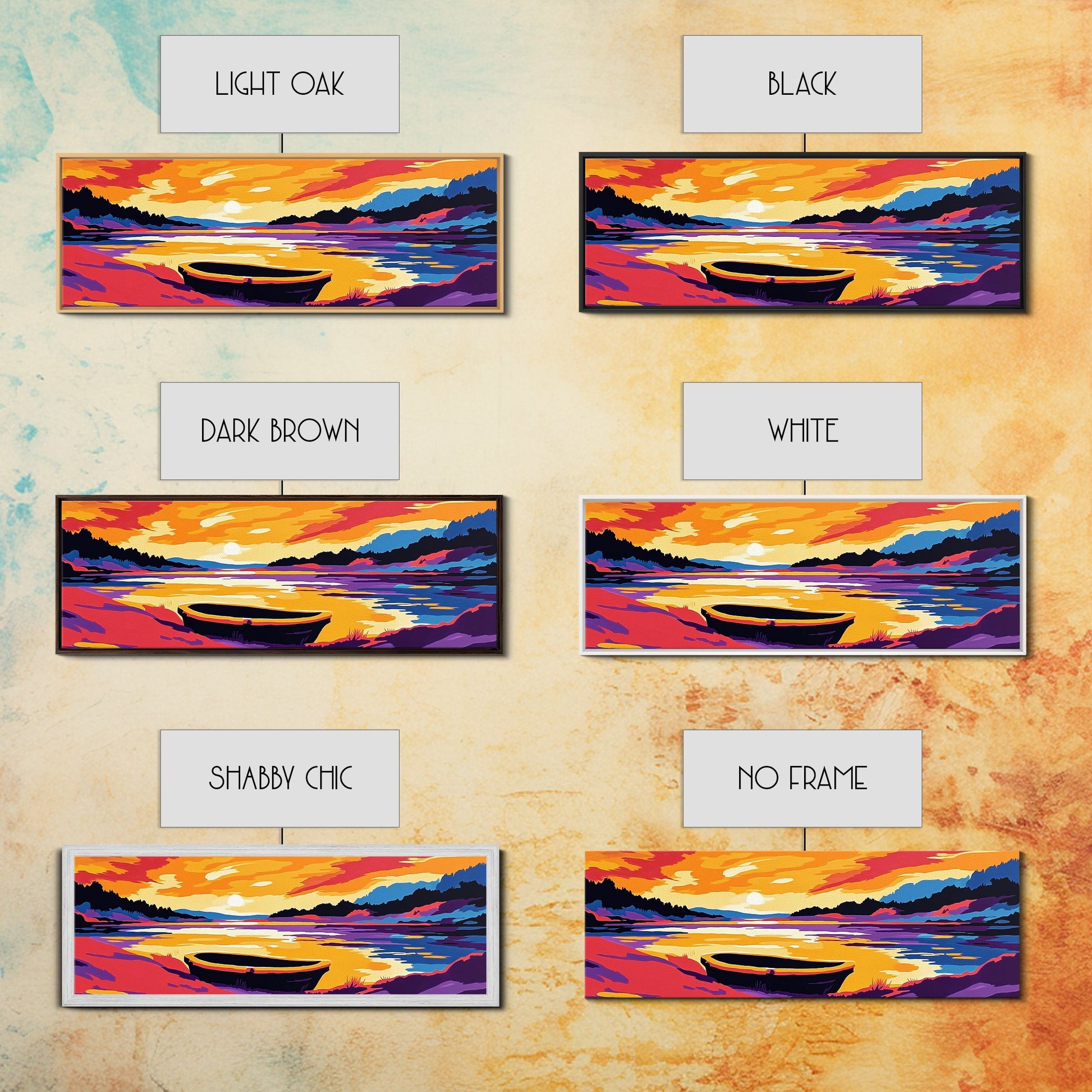 Sunset Boat, Serene Lake, Framed Canvas Print, Tranquil Water Art, Calm Landscape, Warm Color Palette, Boho Home Decor, Bedroom Wall Art