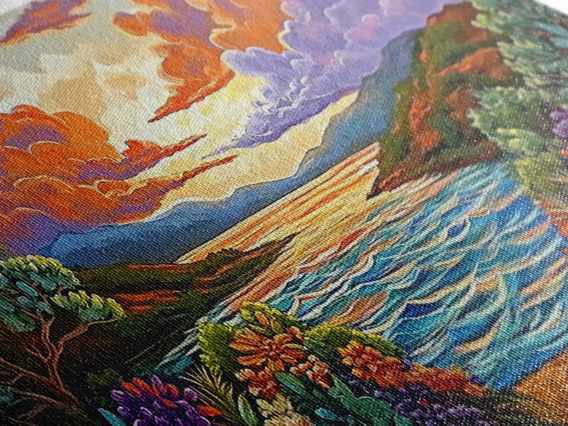 Most of our canvases are made in the USA, with the exception of canvases ordered with the light oak unstained frames, and any large canvases (24x48, 30x60, 16x48 and 20x60) ordered WITH a frame. These are temporarily made in and shipped from Europe, while we try to find a more consistent supplier in the USA.