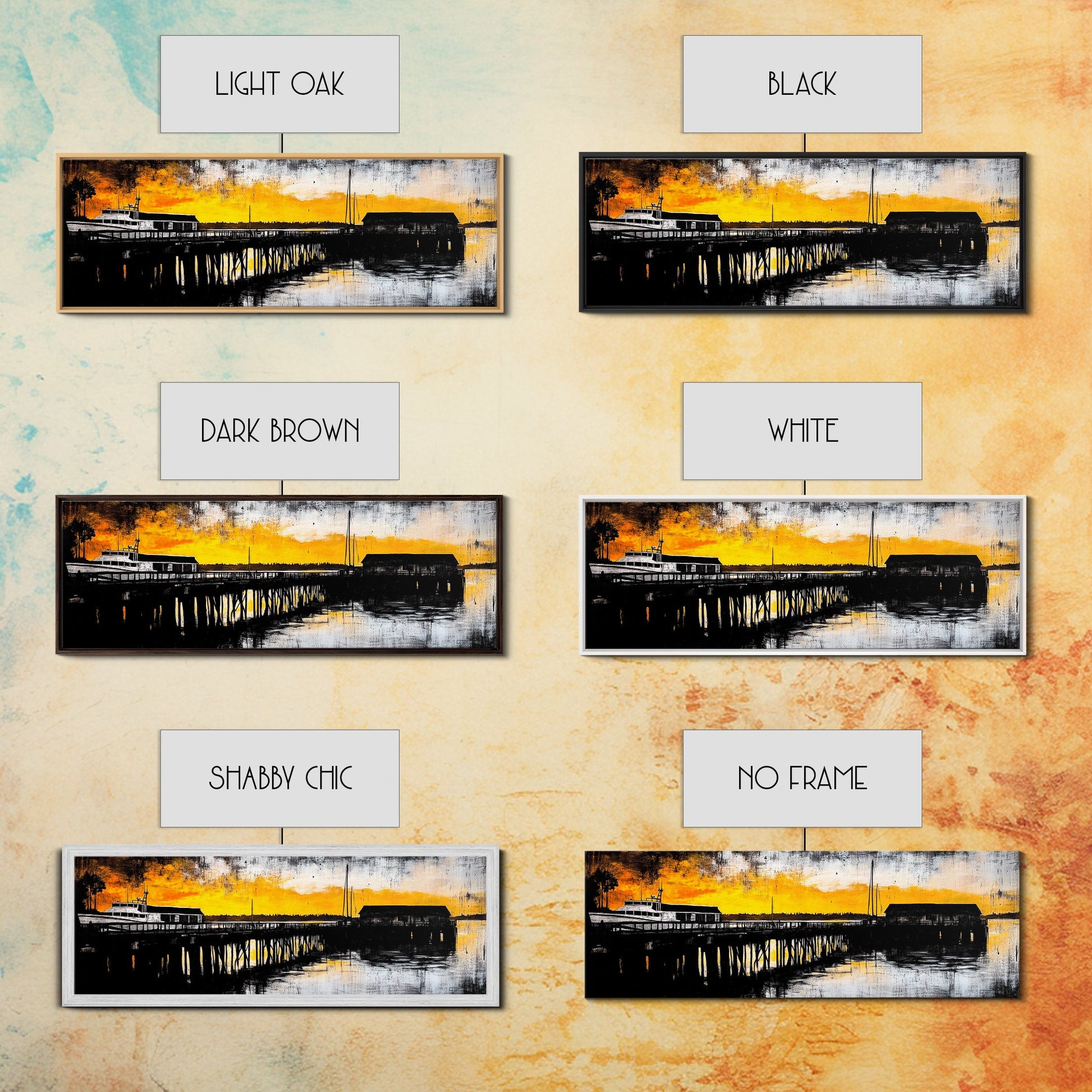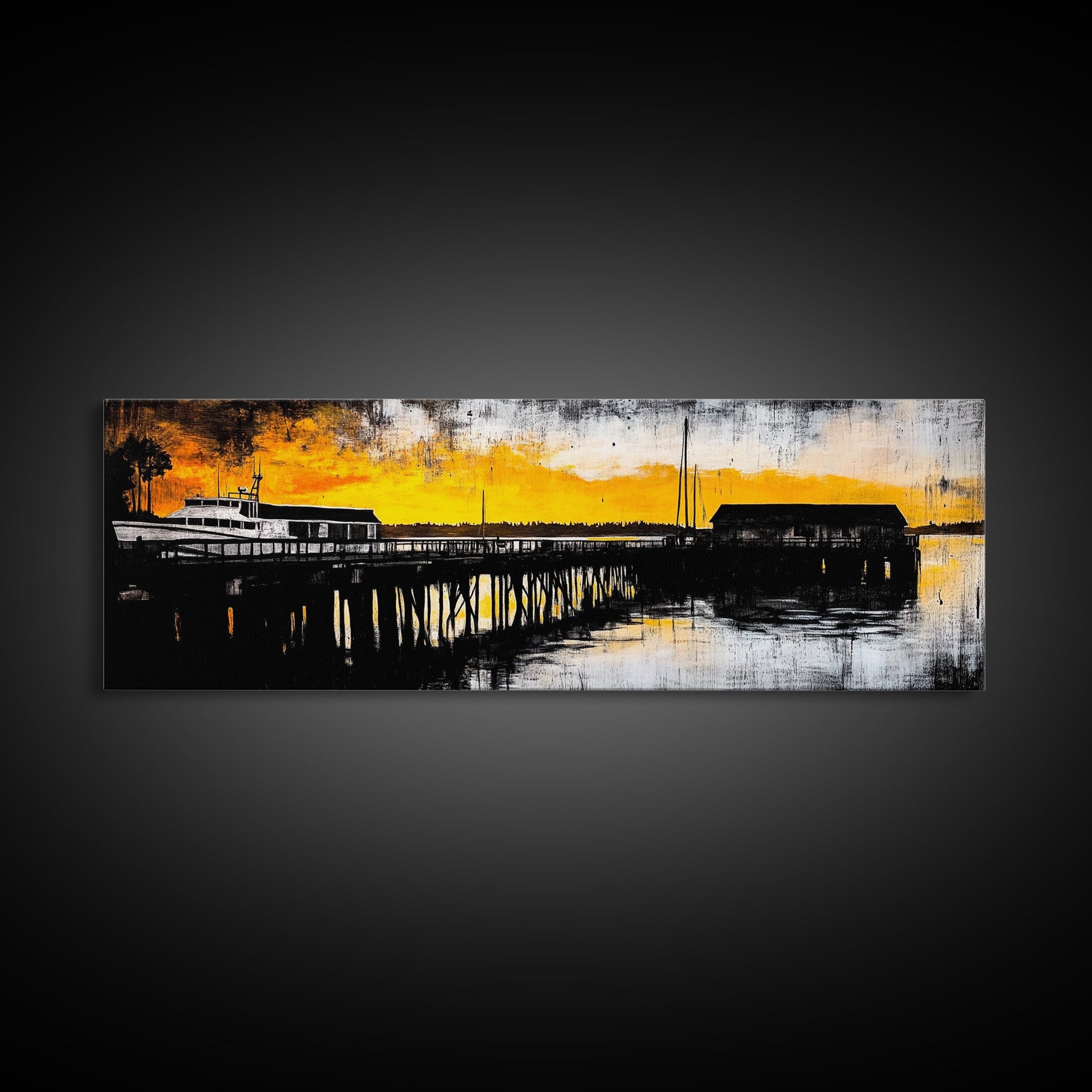 Sunset Pier, Coastal Wall Art, Nautical Art, Framed Canvas Print, Rustic Wall Decor, Boho Art, Living Room Art, Boat Painting